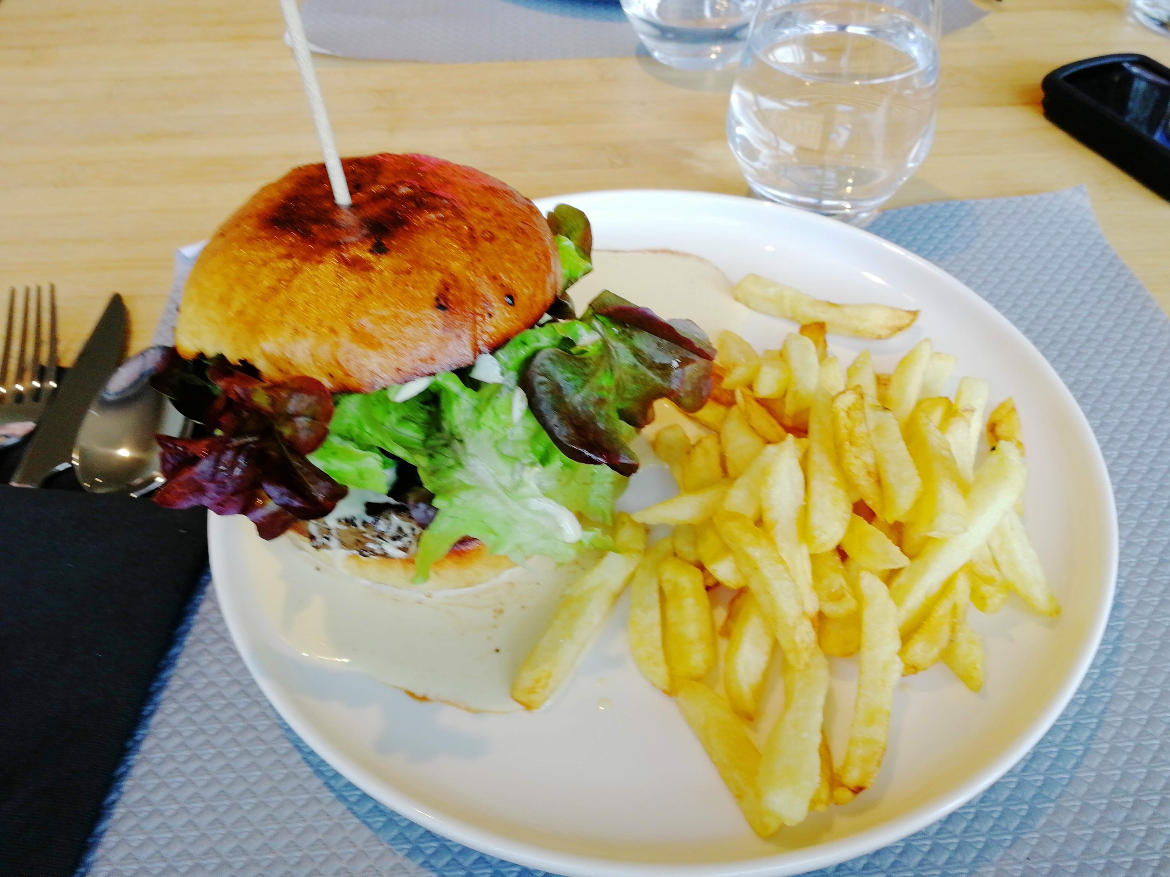 Délicieuse découverte hier midi : savoureuse adaptation du burger avec ses galettes de pommes de terre à l'époisse et son pain très bon, le dessert aux abricots est un moment gourmet de saison : merci !