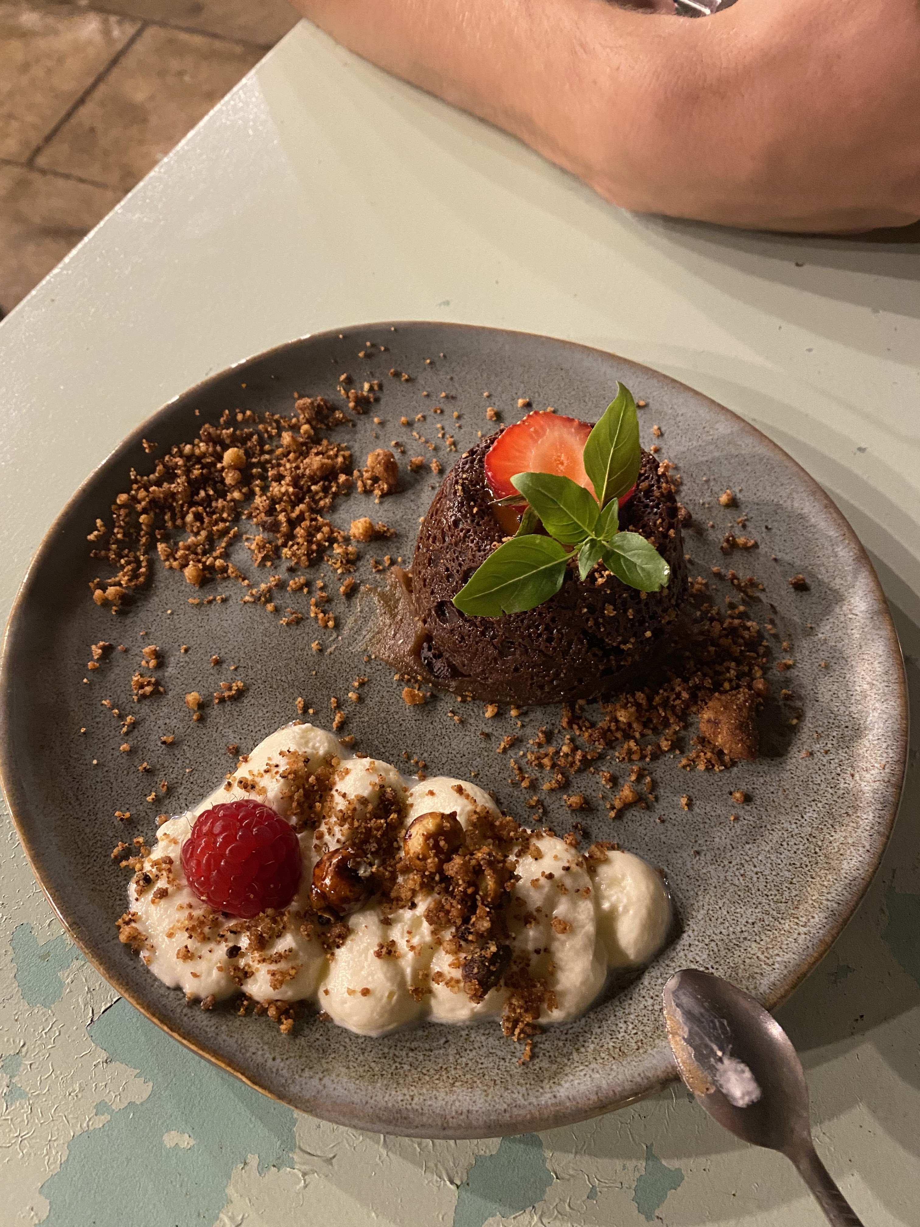Nourriture étonnante et bien présentée! Nous avons eu les beignets de pois chiches et le poisson du jour, tous deux délicieux. Nous avons terminé avec le gâteau fondant au chocolat et il était parfaitement fondu à l'intérieur. Il y a beaucoup de monde et il n'y a que deux serveurs, mais ils font de leur mieux et sont très sympathiques !