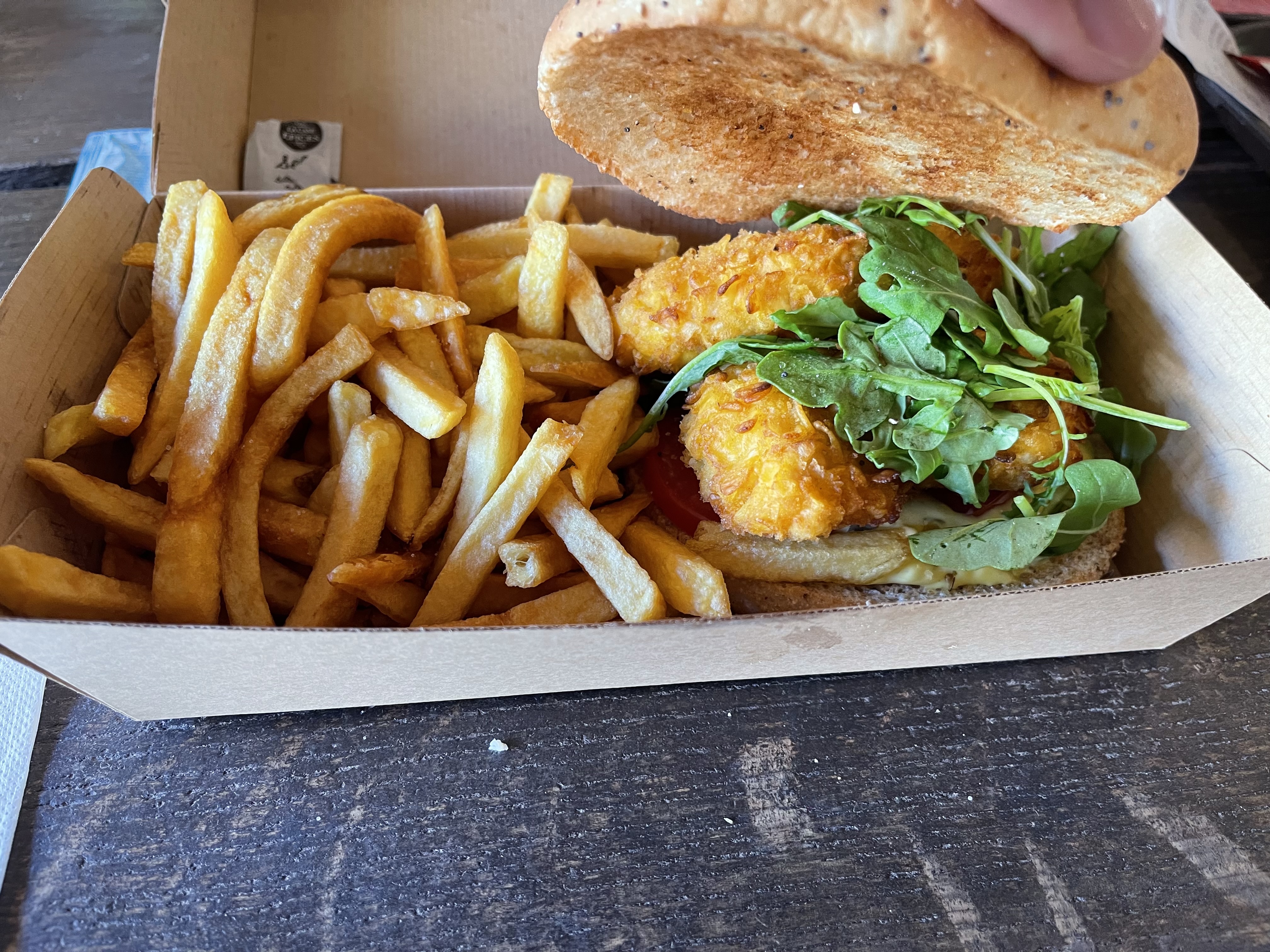 File d'attente un peu longue. 2 erreurs sur les commandes avant nous, donc délai d'attente supplémentaire. Aiguillettes de poulet et burger de boeuf bons mais pas extra. Frites correctes. Pour un repas rapide ça le fait, mais un peu cher pour ce que c'est.