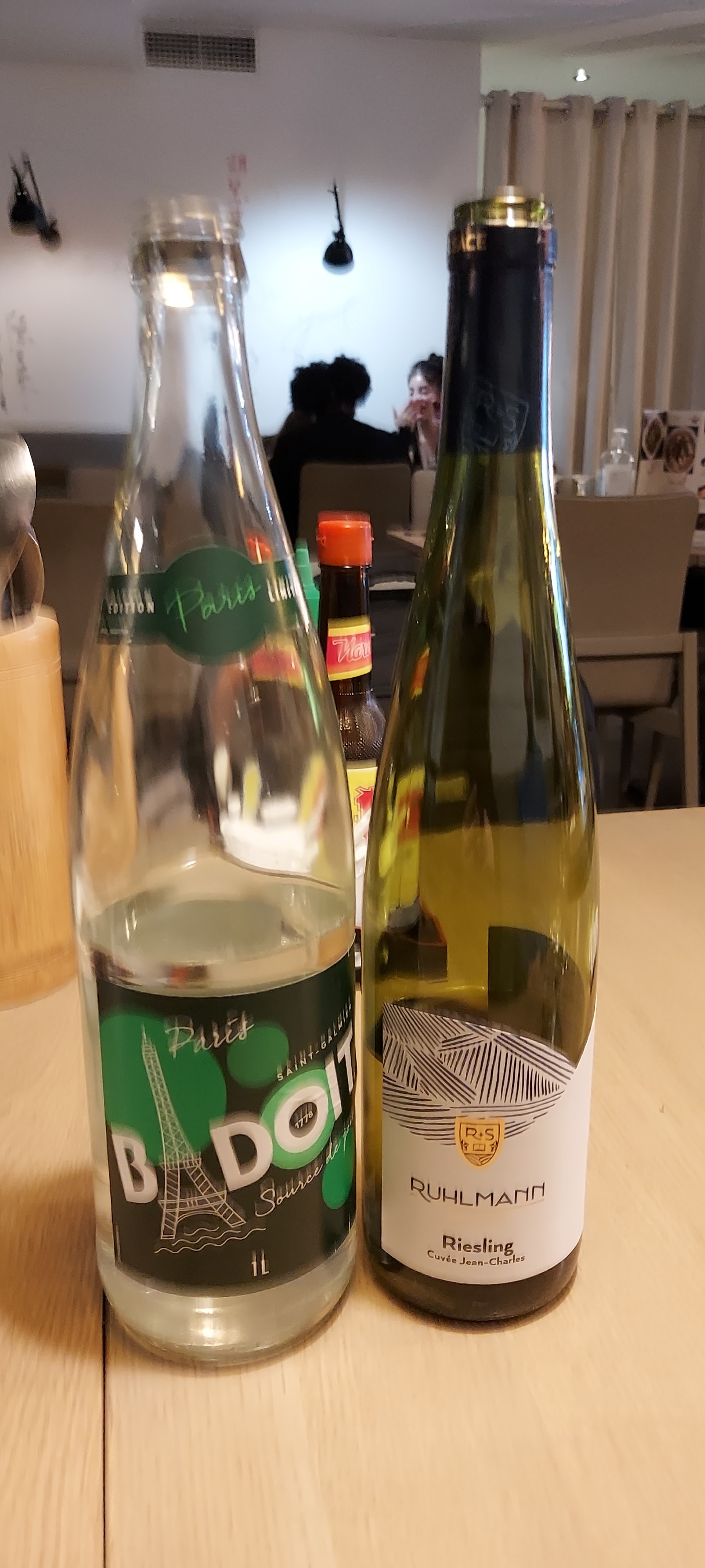 Très bonne qualité, prix très bas.. Une soupe au bœuf, une soupe au poulet, une salade de concombre, une portion de nems, plus une bouteille de vin blanc, 57 euros plus 3 pourboires, 60..