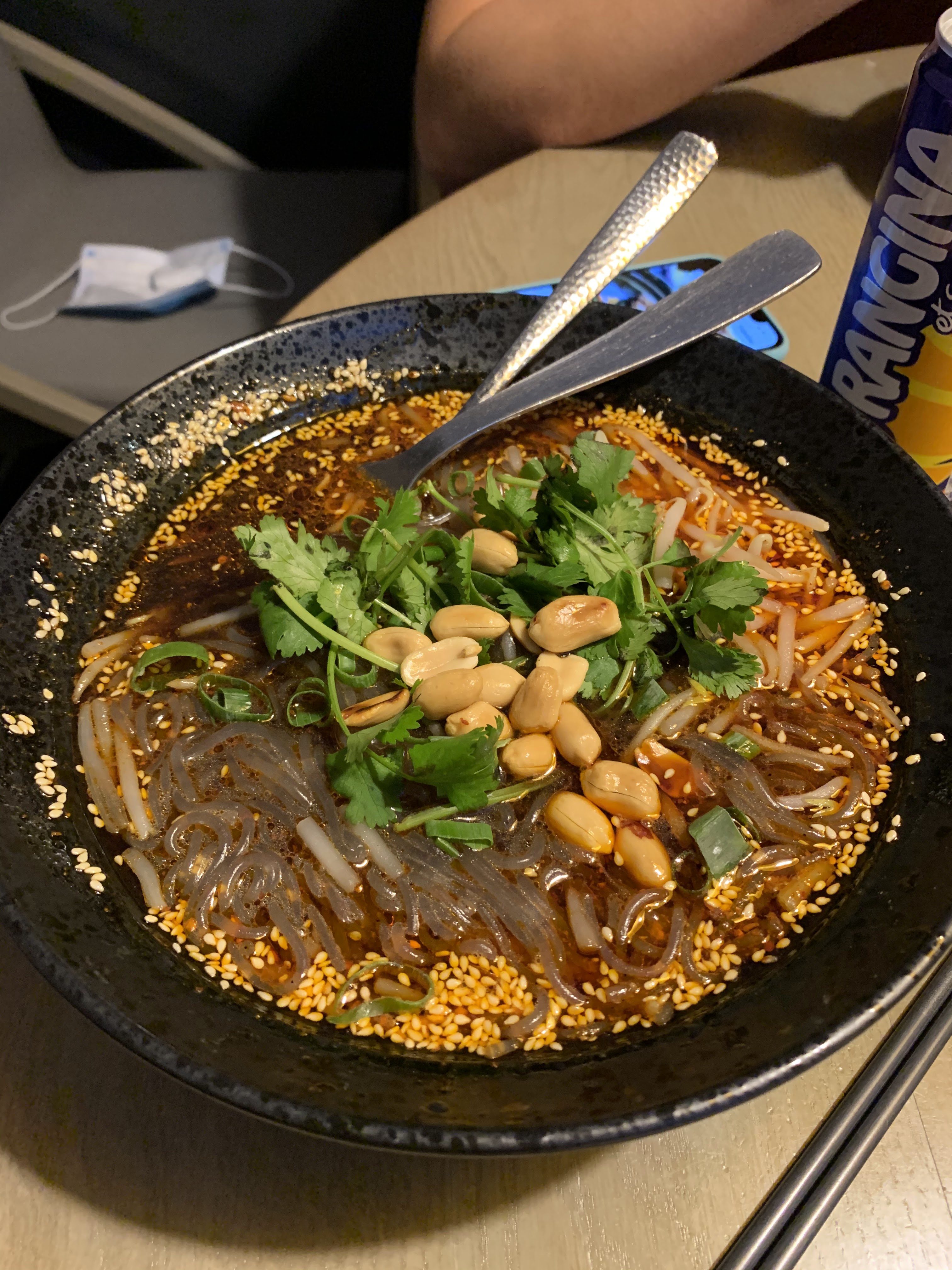 Les nouilles pour mon mari ont vraiment un bon goût de soupe mais le porc n'est pas vraiment bon. Le poulet épicé est mangé froid. À l'intérieur, pas vraiment cuit, il y a encore du sang. Du coup, je mange juste à l'extérieur.