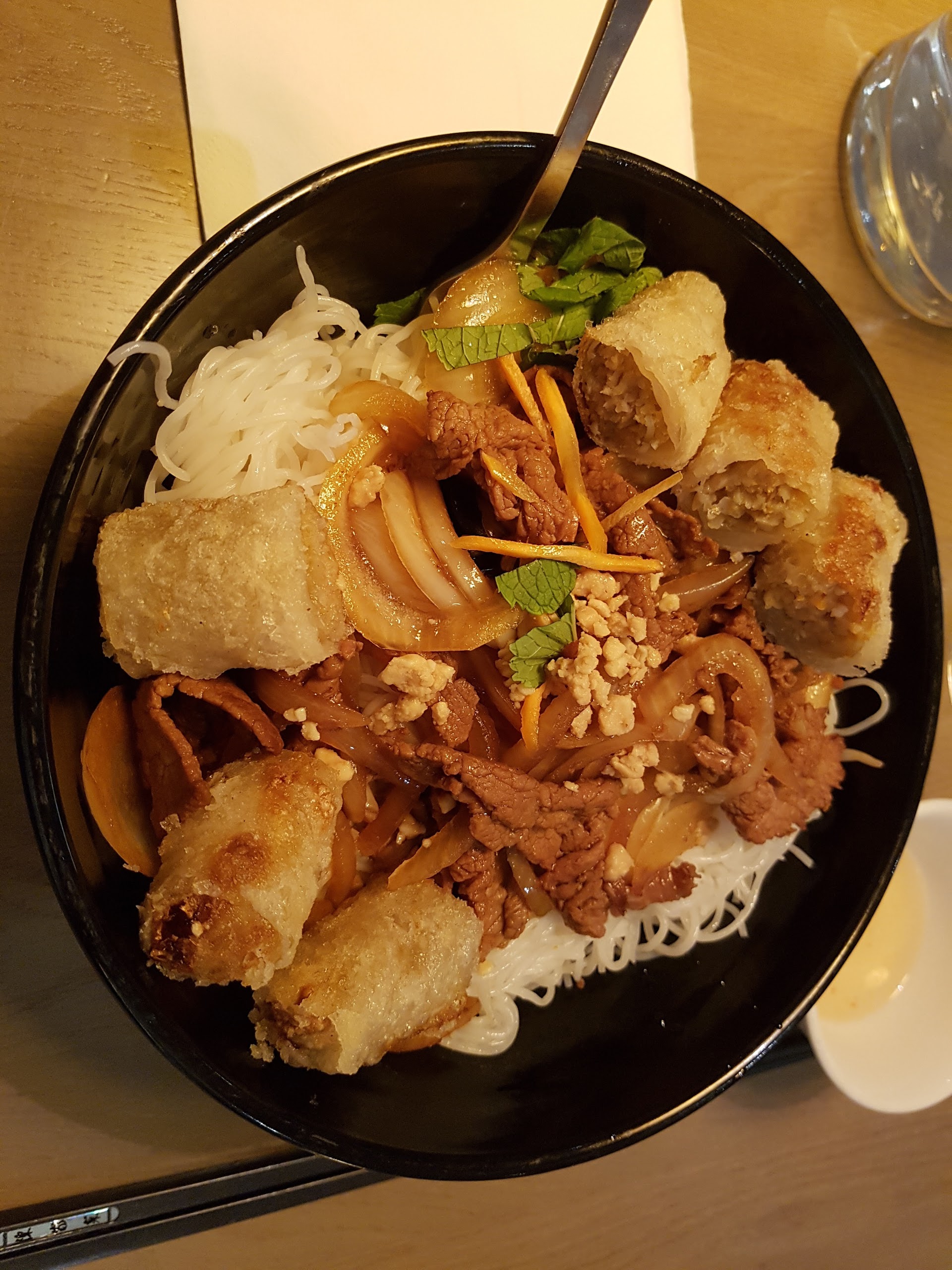 Nous y sommes allés un soir de semaine c'était donc très calme. Le cadre du restaurant et sa déco sont sympas Le service est rapide et la serveuse était très souriante. On a apprécié 🙃 Cuisine asiatique authentique et bonne. Je me suis régalé avec le bò bún et les brioches au porc laqué 🥰. En revanche, attention avec le bœuf sauté maison qui arrache ! 🌶️🌶️
