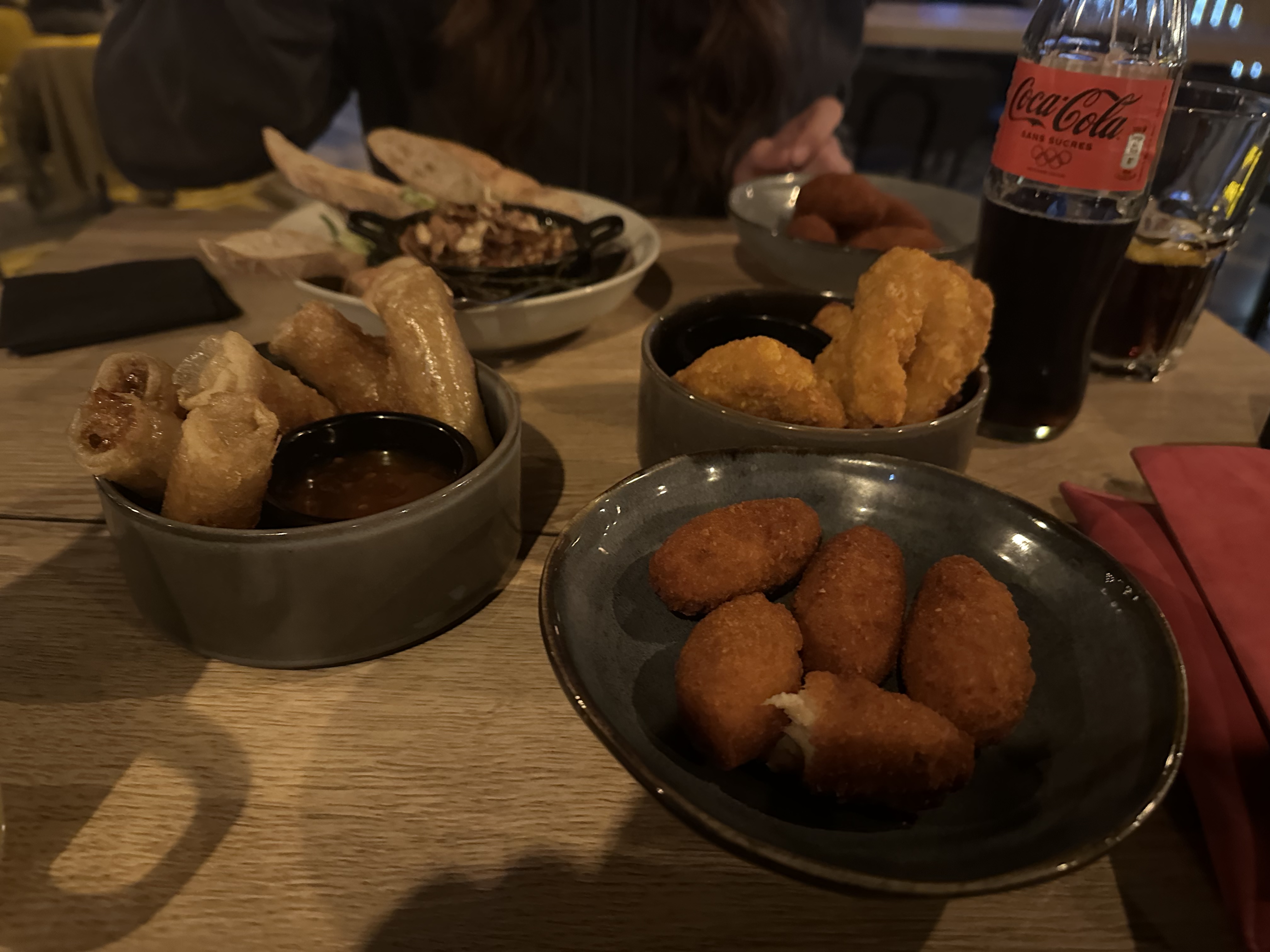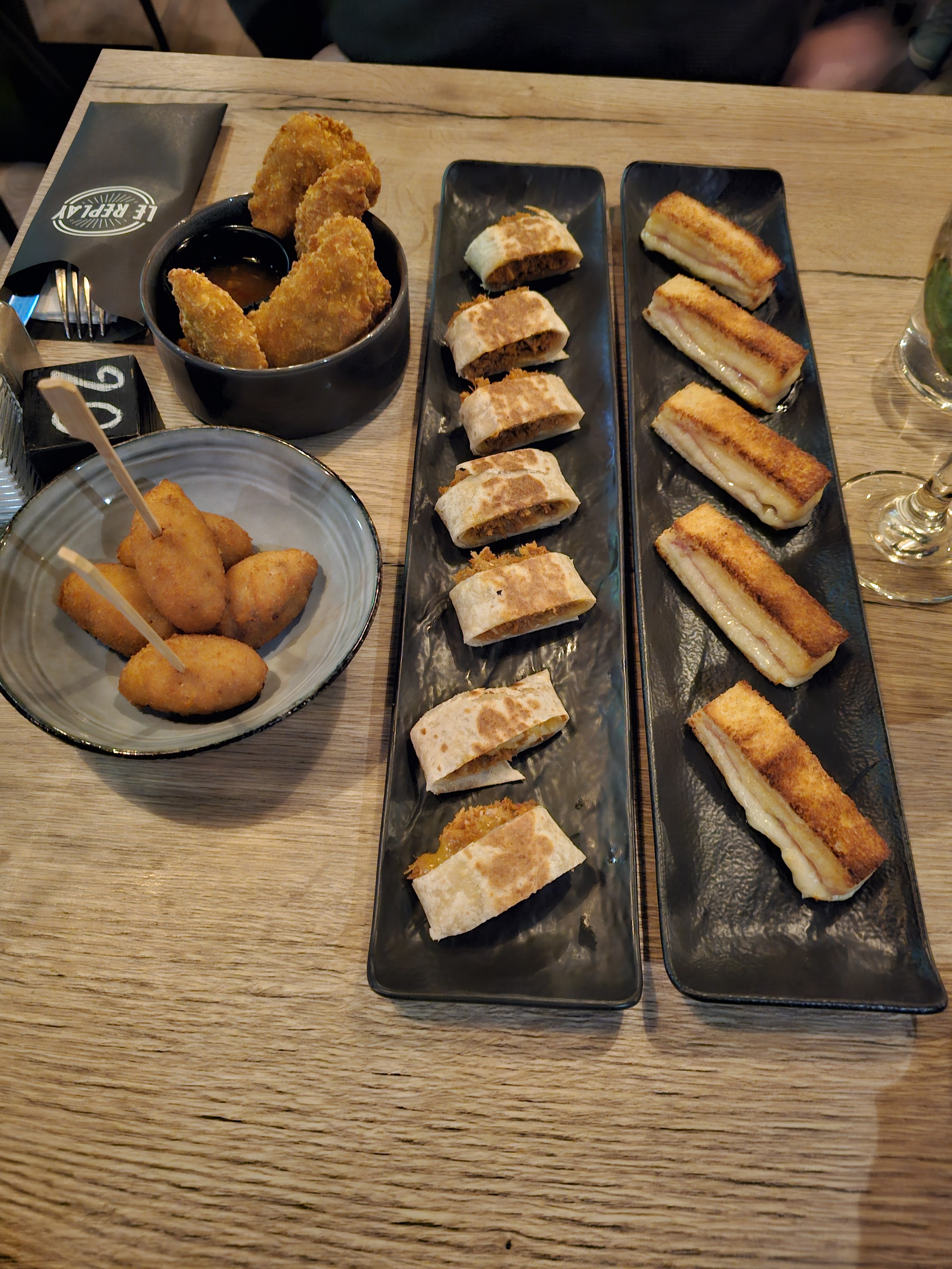 Bien mangé. pas d'assiette pour manger des tapas surtout en cette période avec les microbes ( tt le.monde pioche. ..) Bonne ambiance mais musique un peu forte à certain moment surtout quand on mange .
