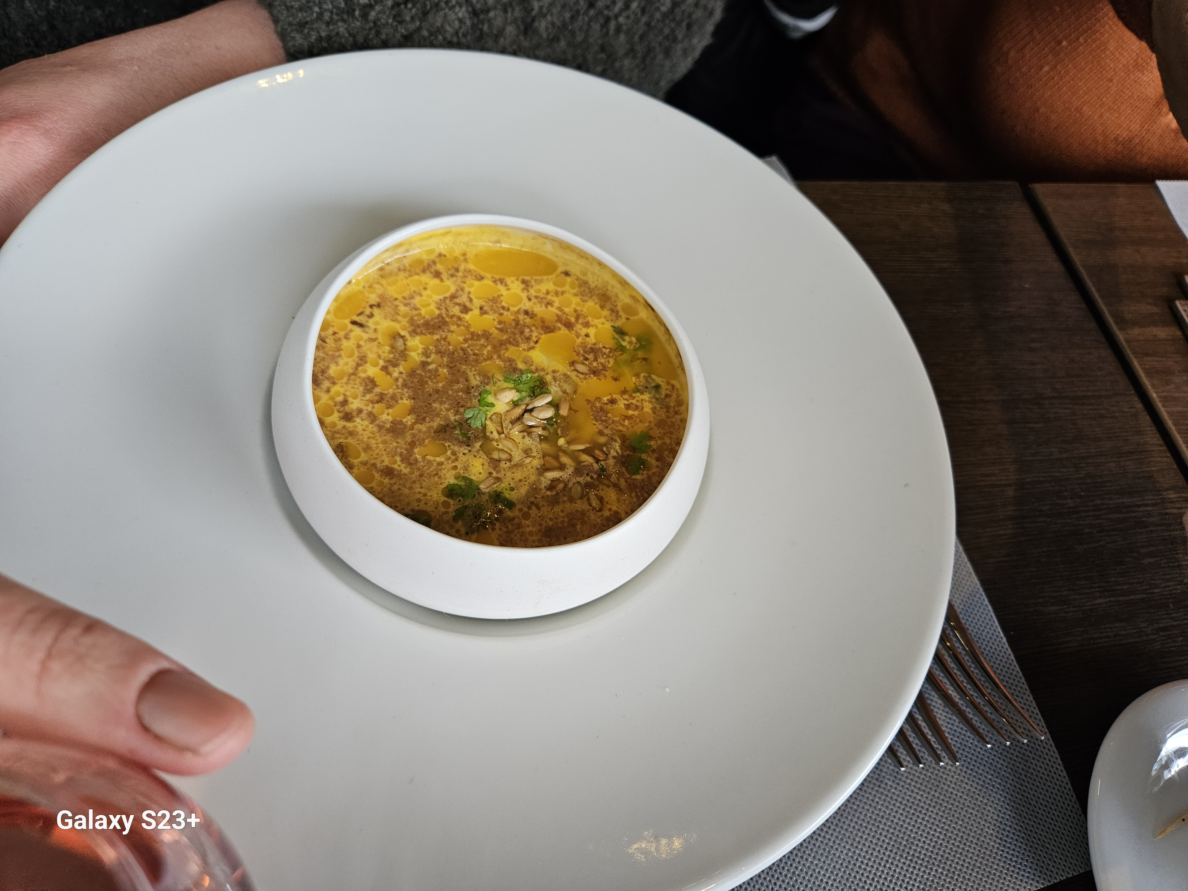 Personnel très professionnel et à l'écoute du client. On avait 1h pour manger et ils ont tout fait pour qu'on soit dans les temps. Excellent plat très raffiné et avec des produits de saison ! Restaurant très propre et pas bruyant
