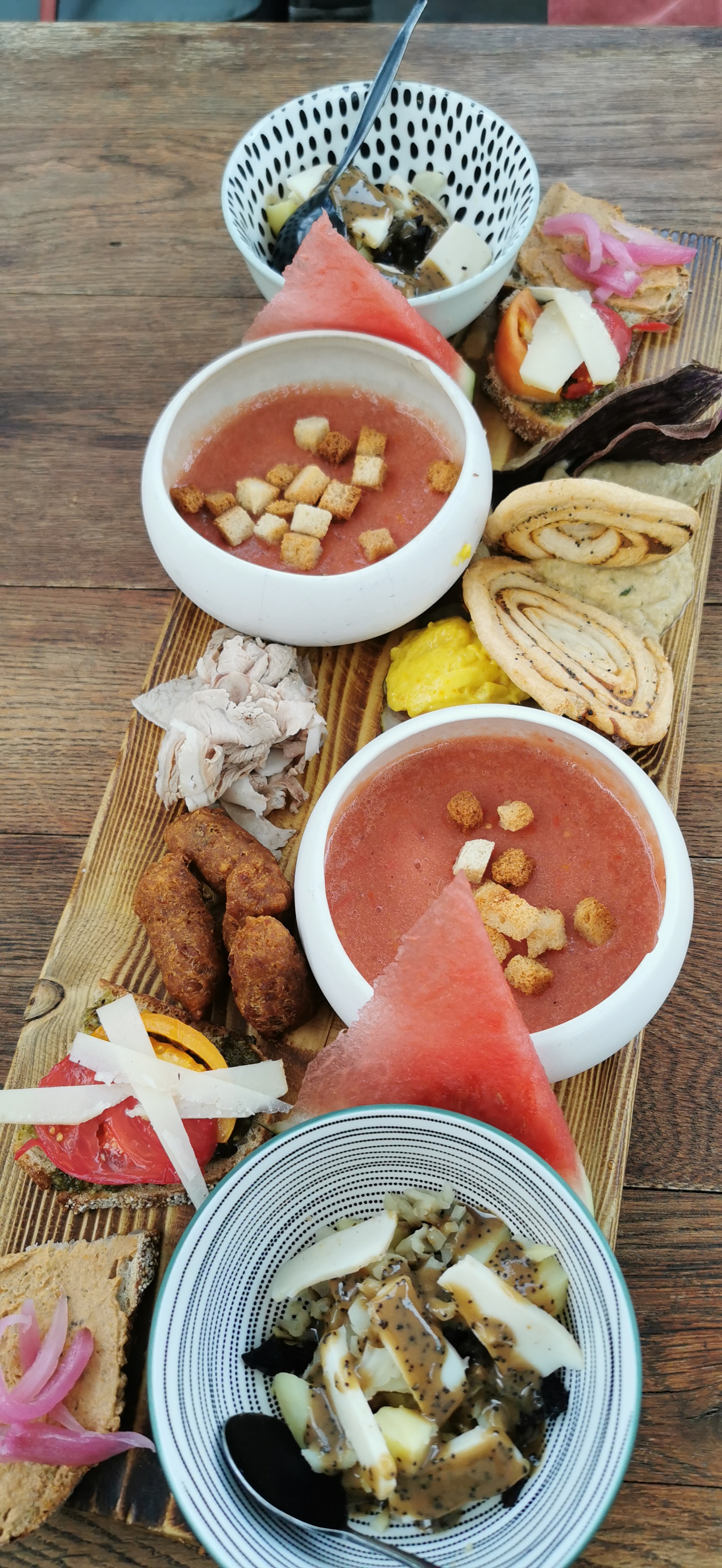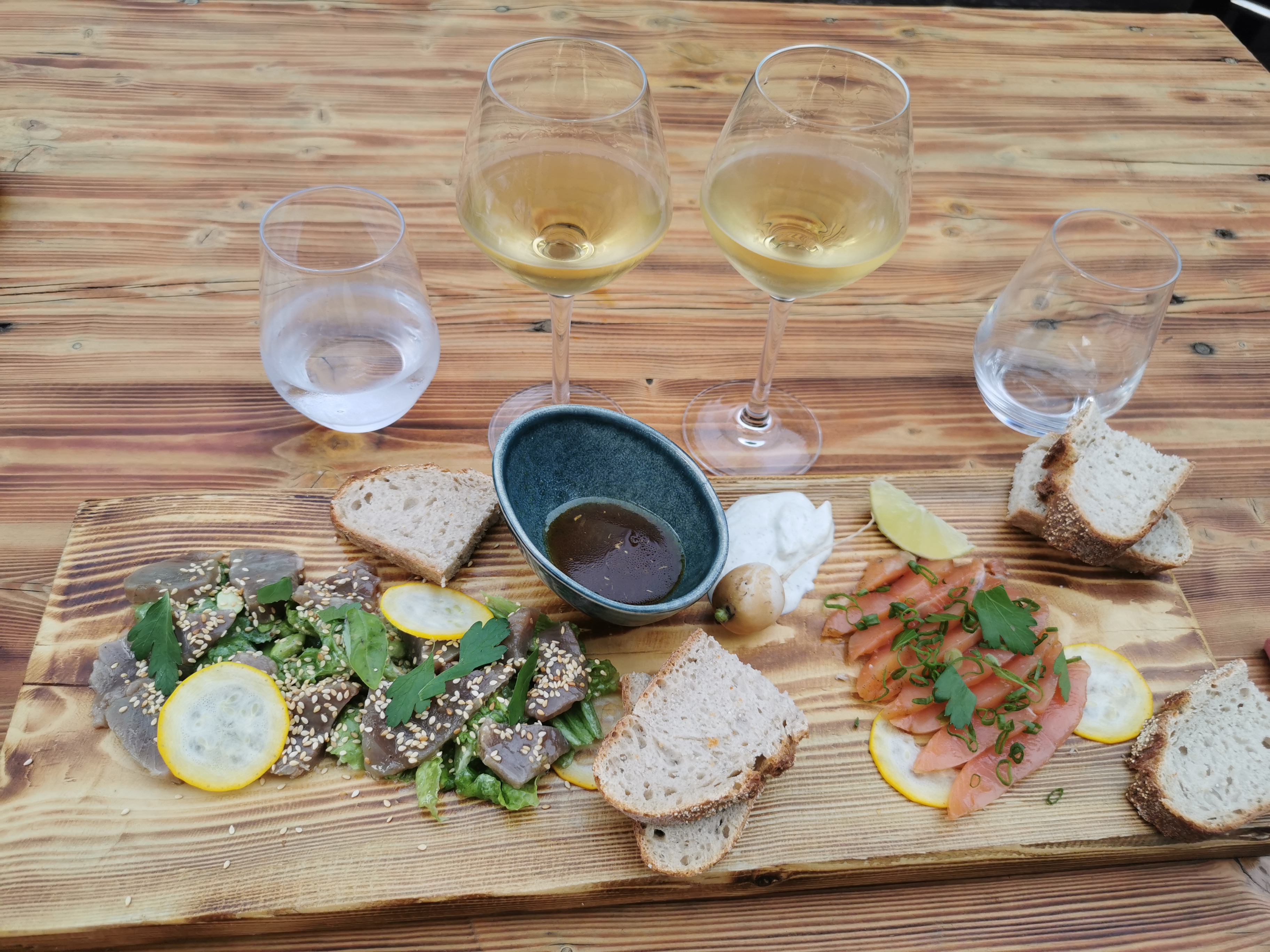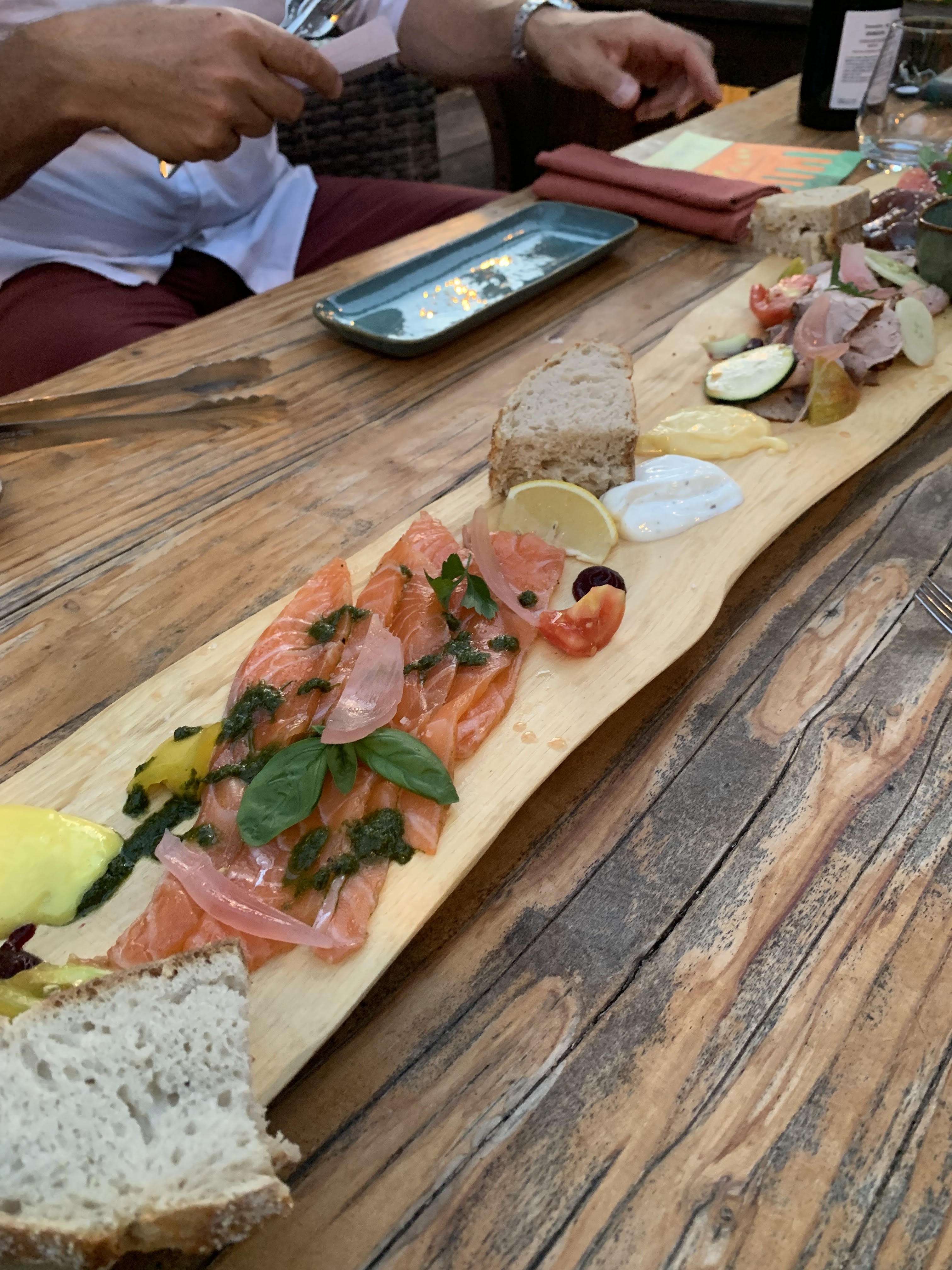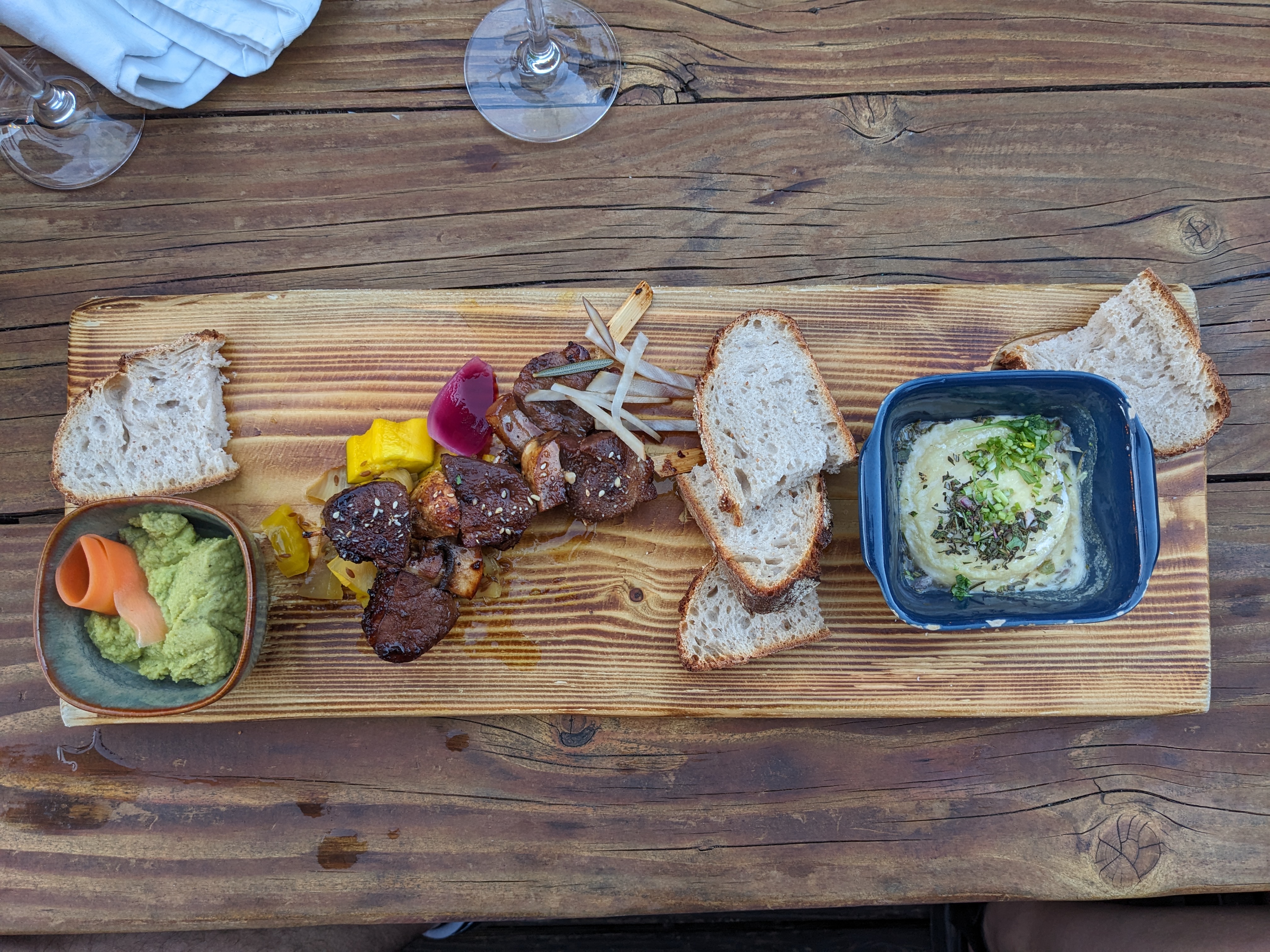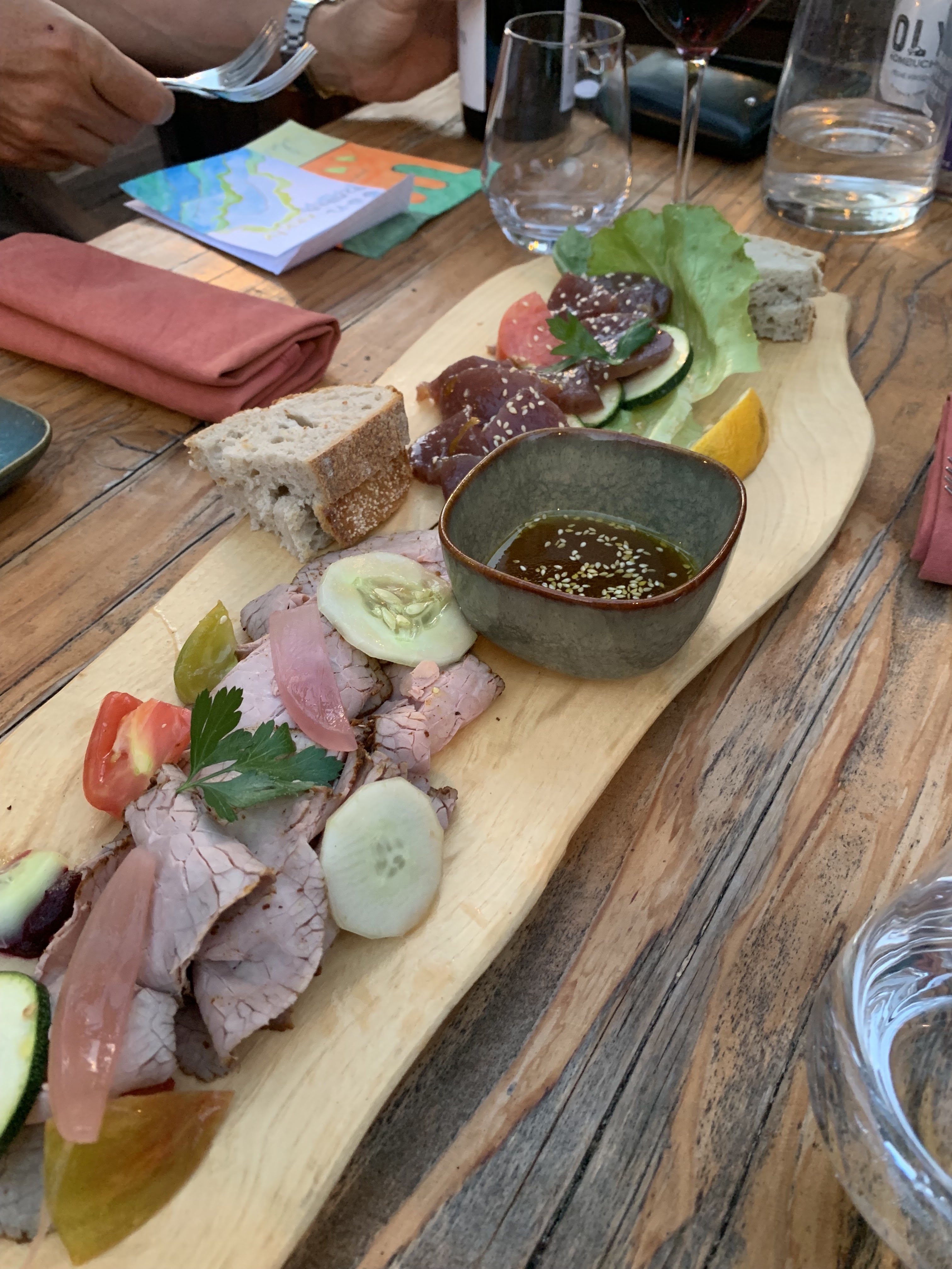 Super expérience, plats présentés sur des planches, original et les aliments sont locaux et succulents. Grand choix de vins et conseils de grande qualité distillés par l'excellent et sympathique Jo. Possibilité également d'acheter des bouteilles à la cave. Un must si vous passez dans le coin !