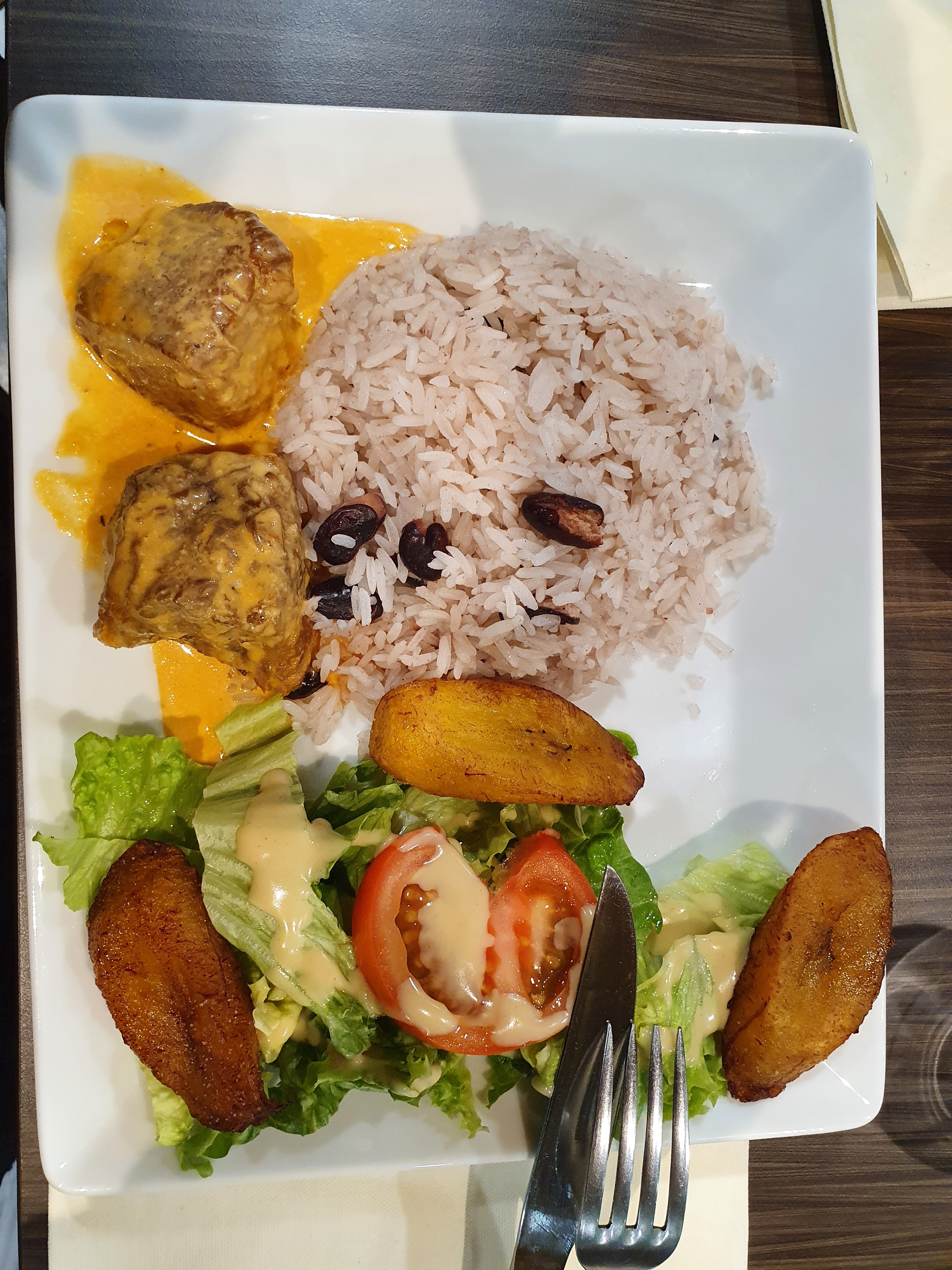Très bonne accueil et Chef plutôt bien, bon plat rougail au porc avec riz et haricots noirs, quelques banana plantain pour donner un goût un peu sucré.