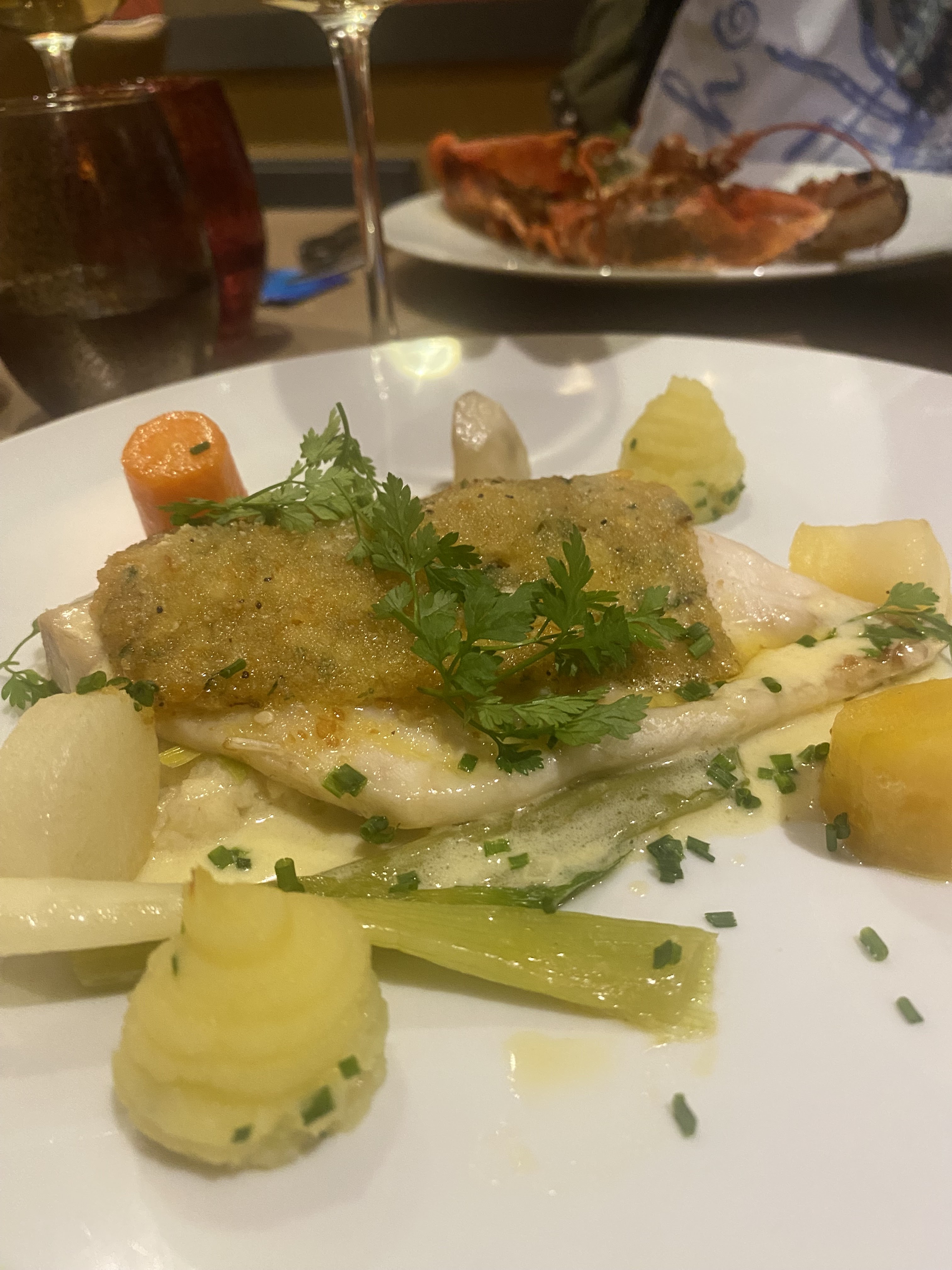 Entré bonne plats pri 2 poissons Différent regrette sauce garnitures pareil légumes manque cuisson dessert bon