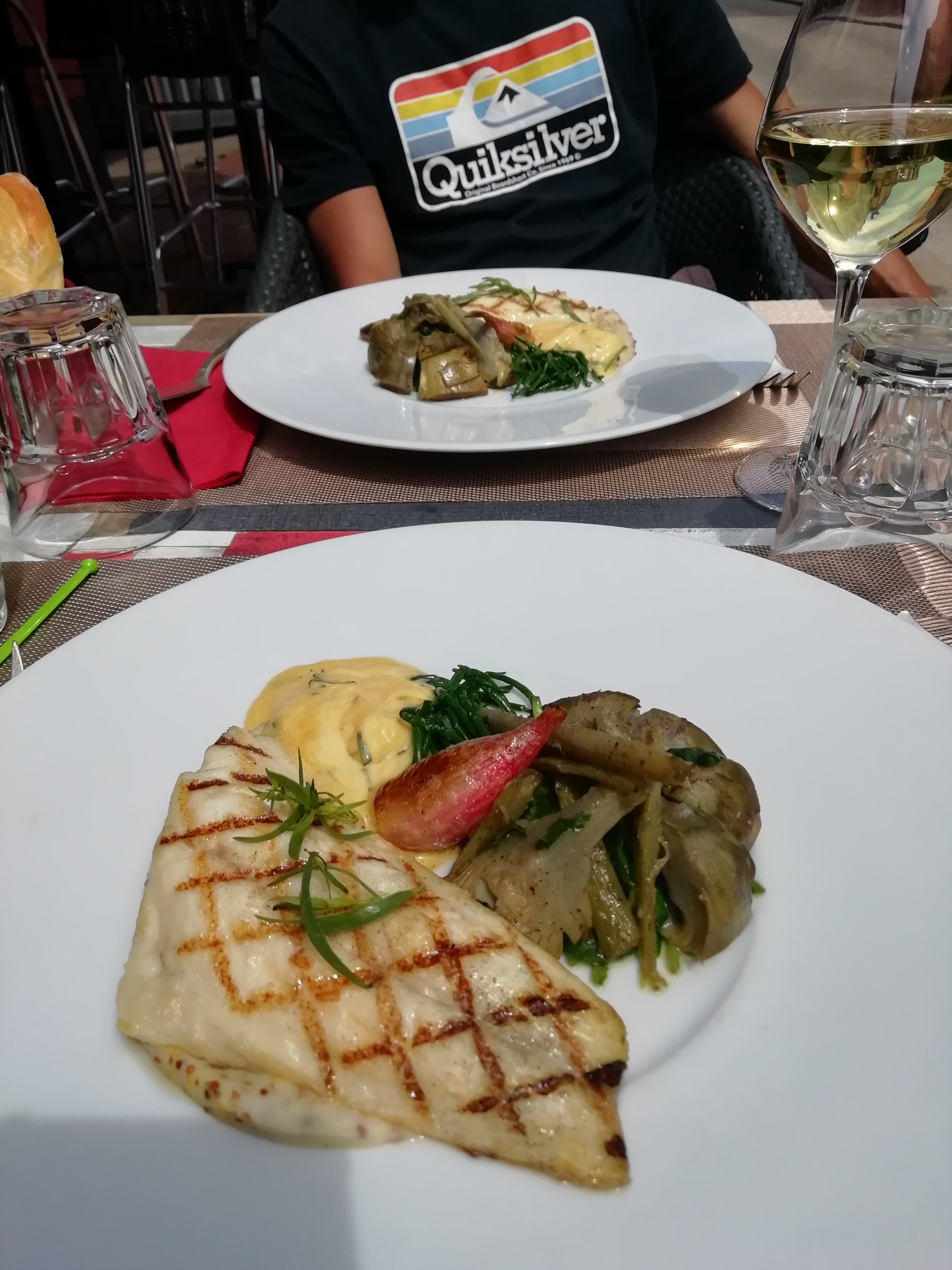 Tartare de saumon suivi d’un filet de cabillaud asperges & petits légumes en version « à emporter » du fait des contraintes sanitaires en vigueur. Très belle présentation, très belle cuisson du cabillaud. Pas très pratique à déguster en bord de mer accompagné d’un petit vent frais mais nous n’avons absolument pas été déçus. Félicitations au chef Arnaud ! Nous recommandons cette excellente adresse.