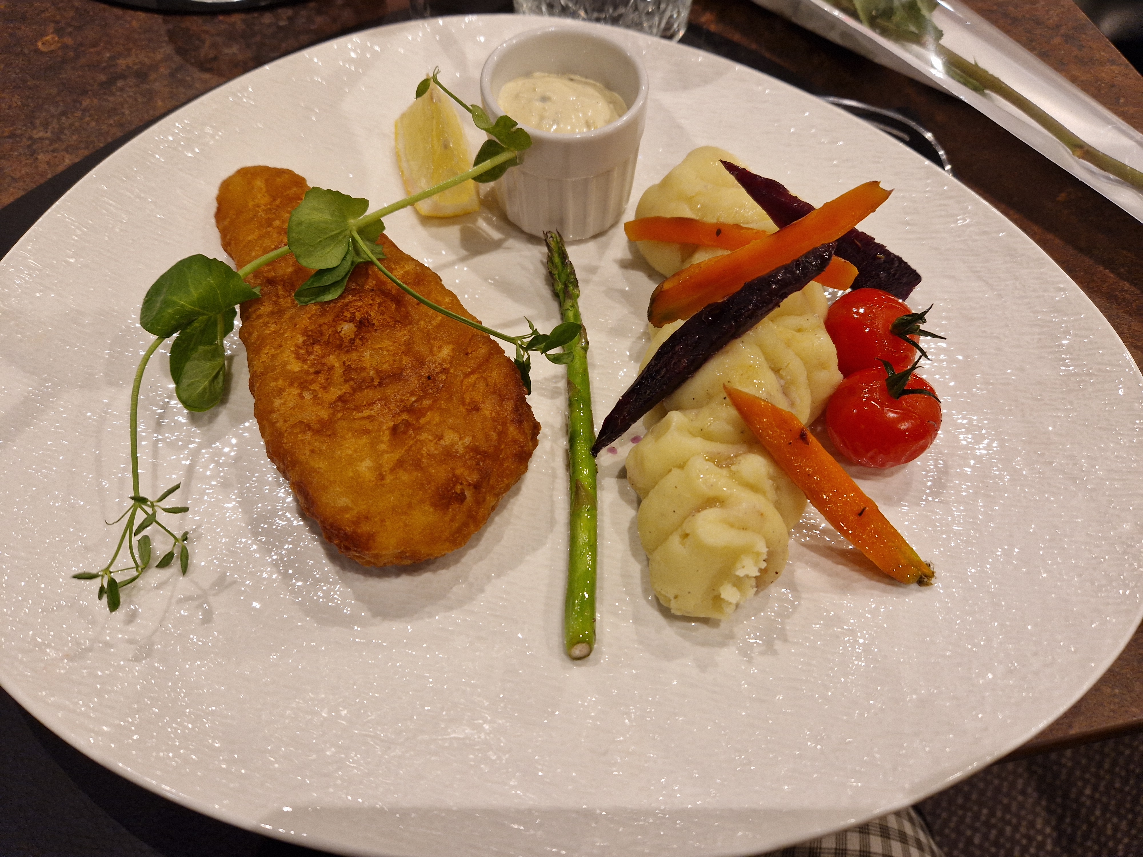 Restaurant bistronomique. Un plat de poisson, choix selon arrivage, c’est très compréhensible et logique, se voir en seule proposition un fish&chips… voir ma photo et faites votre conclusion… 18€ … pêche du jour j imagine très bien. La mayonnaise en sachet, peut-on avoir une vraie mayonnaise digne d un bistronomique ? crème brûlée fève tonka en dessert, sans plus. Endroit spacieux et agréable, personnel efficace et accueillant mais c est une réelle déception pour le dîner.