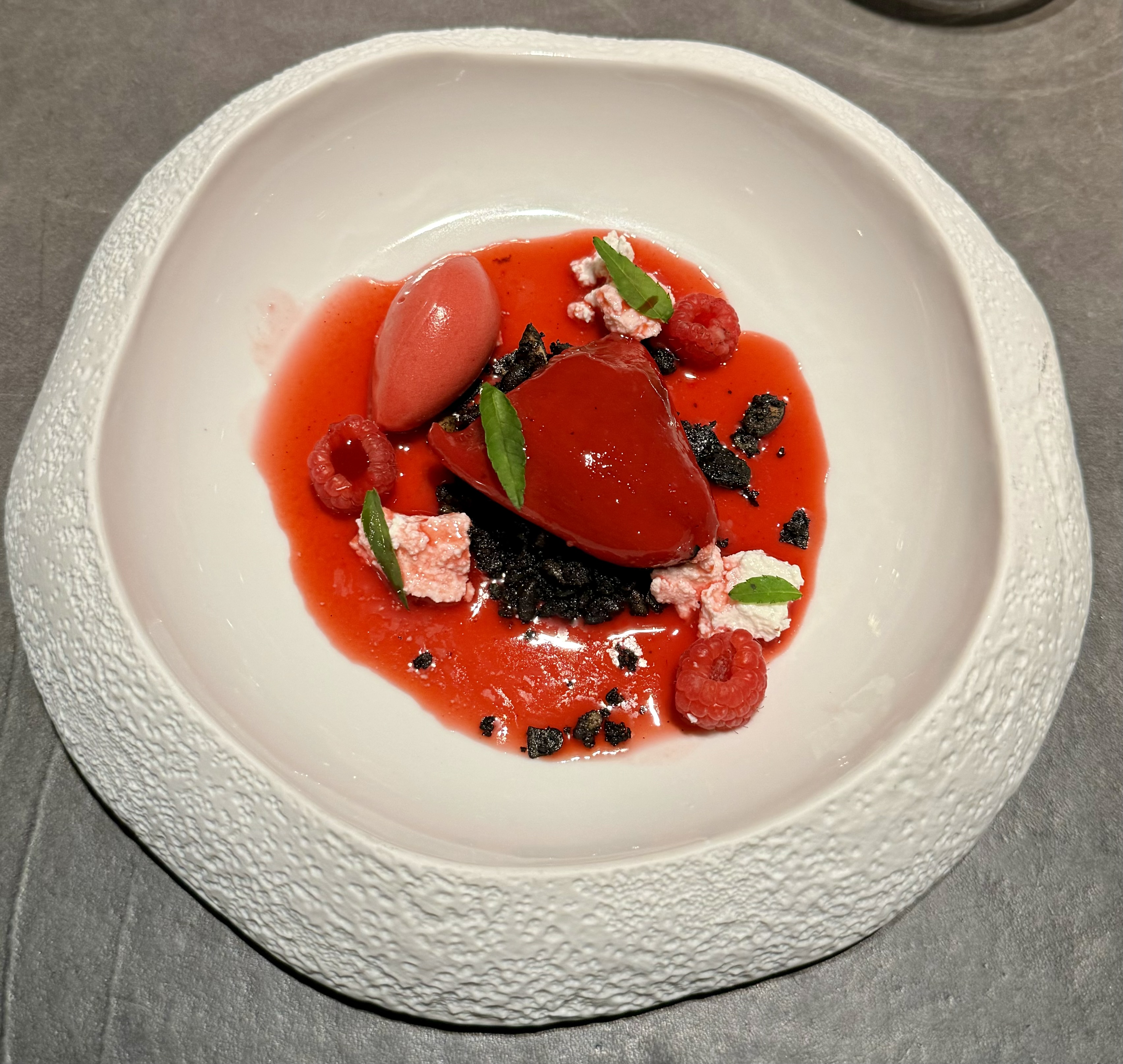 L'équipe est adorable, aux petits soins, pleine d'attentions envers leurs convives. Le sommelier aime ses vins, la cuisine -visible de la salle- travaille sereinement aux côtés du Chef en première ligne... Tout est huilé, maîtrisé, orchestré avec minutie. Le chef propose des associations incroyables, fin orfèvre, maîtrisant à la perfection les pointes d'acidité qui viennent mettre en musique sa cuisine. Un énorme coup de cœur pour une simple mise en bouche mystère de topinambour et un premier plat autour du tourteau au curry vert. Une ballade en 7 plats surprenants et parfaitement réalisés. Nous avons fait une pause après les entrées et sommes sortis prendre l'air, il faisait véritablement trop chaud dans la salle - quid de la proximité de la cuisine ? - il y a peut-être quelque chose à améliorer de ce côté-là... Nous avons été un peu moins conquis par le turbot un peu trop cuit pour nous et que la sardine écrasait un peu. Je trouve que souvent les desserts souffrent de la comparaison avec la cuisine, ici 1 pré-dessert autour du chocolat d'une légèreté incomparable et un dessert autour de la framboise et du piquillos déroutant et totalement addictif !