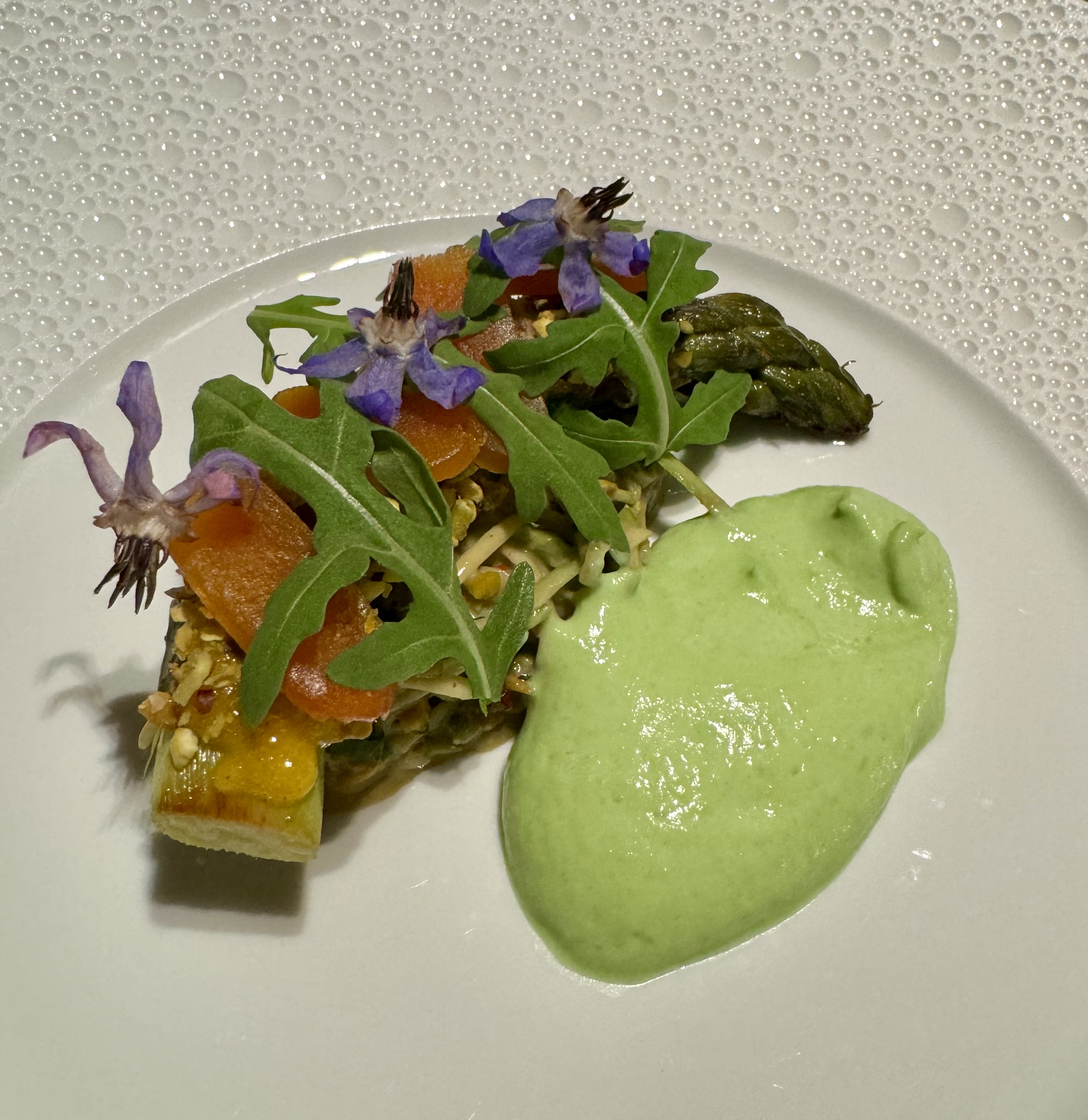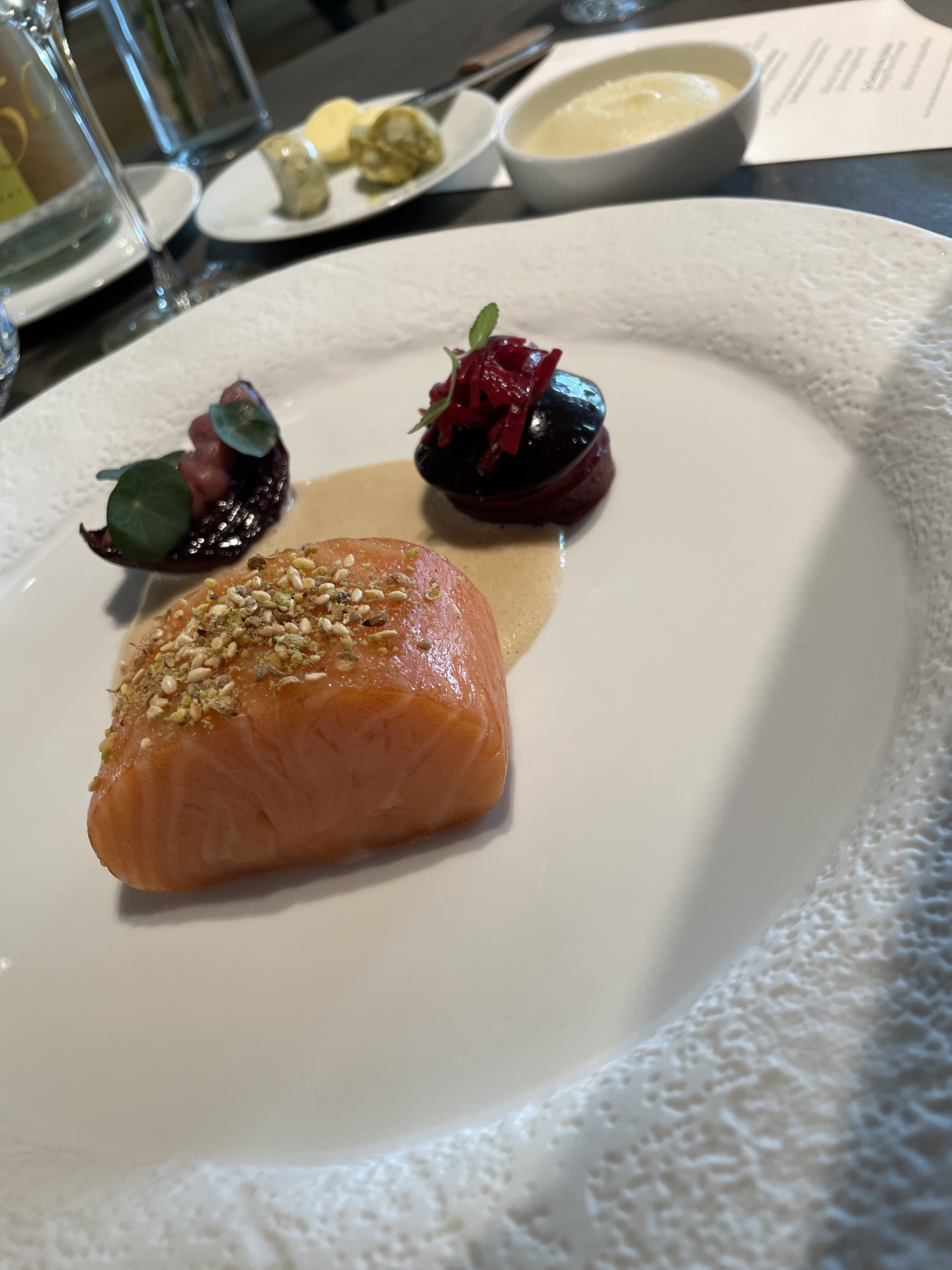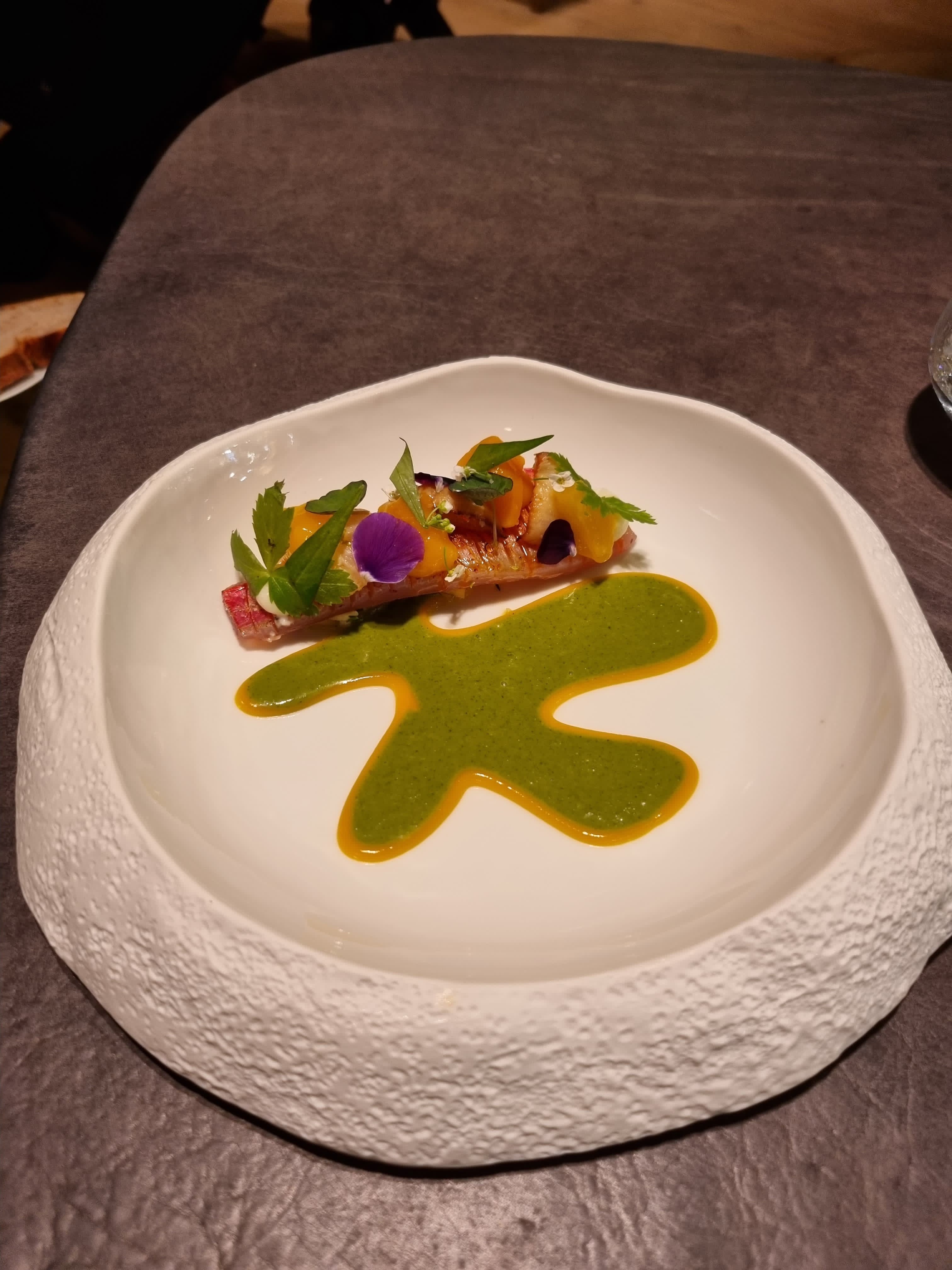 Dîner dans le gastronomique : très bon, mérite son étoile sans discussion. Lieu moderne, salle tournée vers la cuisine. La meilleure partie était les nombreux amuses bouches tous plus originaux les uns que les autres. Le dessert à l’asperge ne nous a pas convaincu en revanche. Quelques soucis dans le service : allergènes donnés trois fois, (à la réservation, au maître d’hôtel et au serveur) l’assiette arrive sans modification avec l’allergène présent dedans. Egalement, le pré dessert est déposé et servis pendant que mon invitée est absente, de ce fait, elle n’a pas pu avoir la présentation de celui ci. A part cela, le personnel était agréable et professionnel.