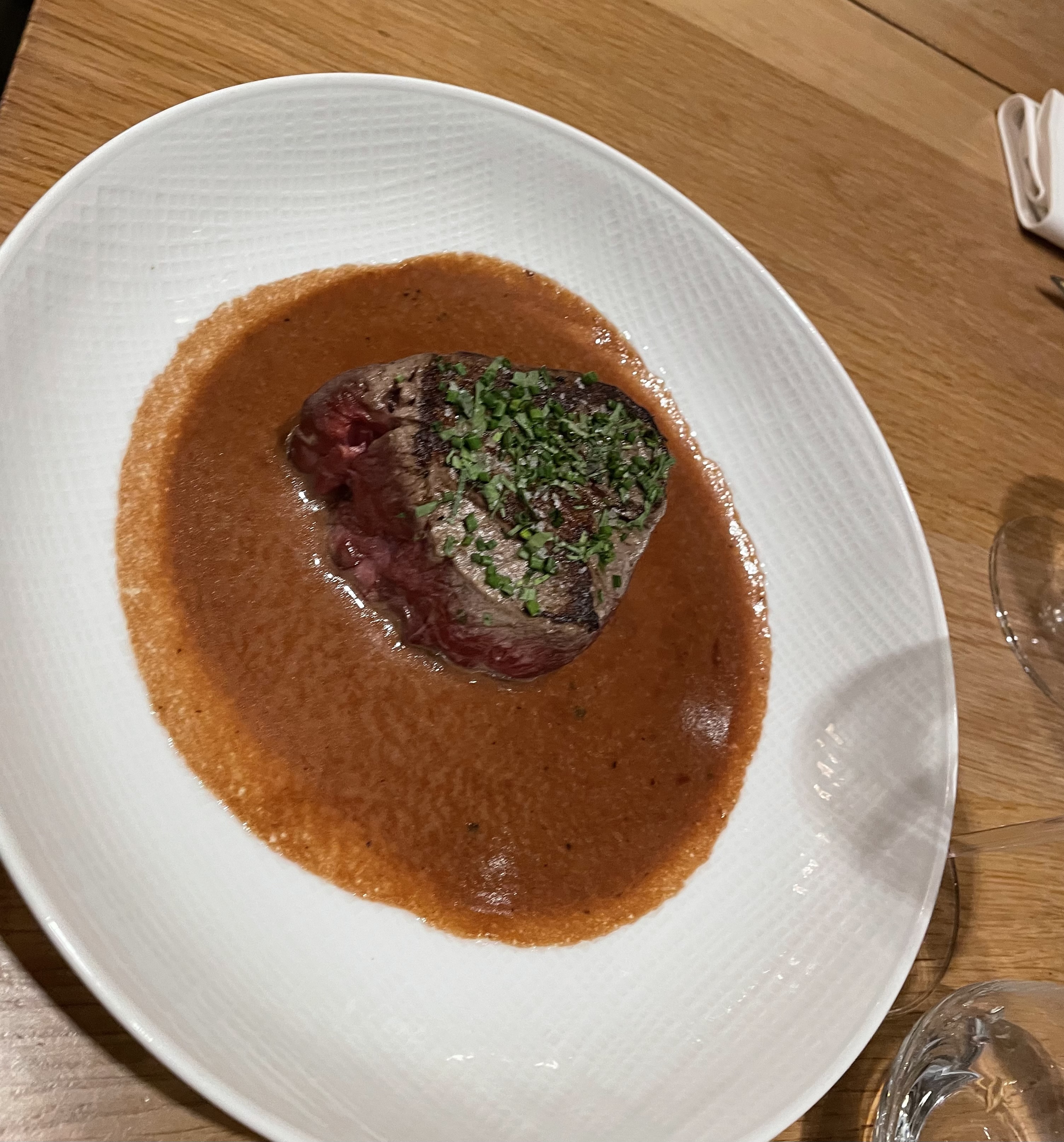 Surfait, sur-coté et rien de bien exceptionnel... Le vin qui arrive à la fin du plat pour lequel il était prévu !! Ah si une note positive, le seul moment où j’ai constaté qu’il y avait de la matière dans ce qui était proposé, ce fût au moment de l’addition Globalement une soirée décevante, un établissement qui ne mérite pas cette étoile