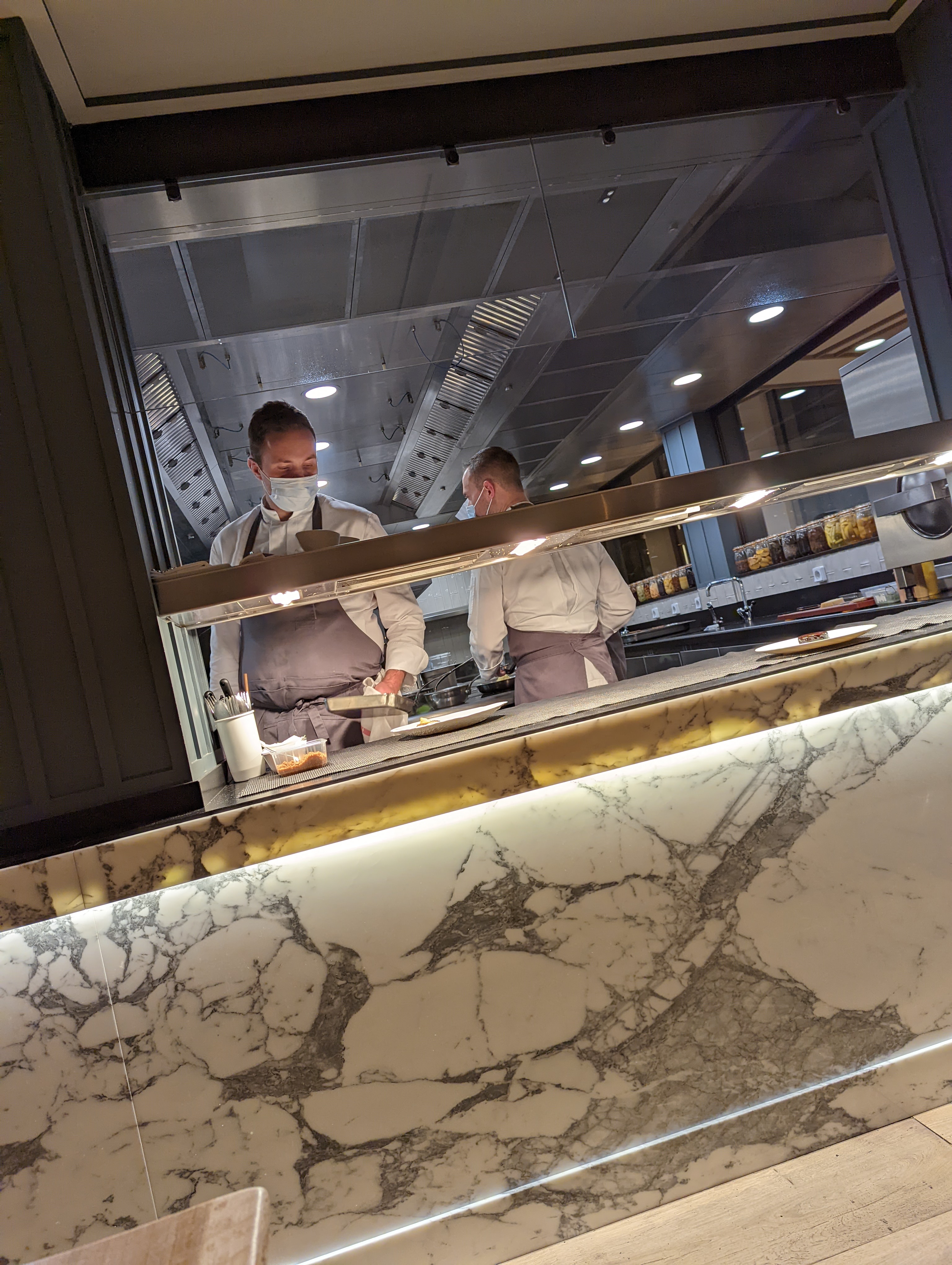 Quelques erreurs de services, à l’apéritif, la même entrée proposée une seconde fois, pas de Service de vin suivi. Au niveau cuisine, plats de plats exceptionnels, c’est bon sans plus. Pourquoi ne pas laisser le reste des sauces sur la table, en général trop peu de Sauces. Dessert autour de l’abricot pas vraiment le goût d’abricot, dommage. La vue sur la cuisine sympa mais toute les préparations dans des boites en plastiques ça ne fait pas rêver.