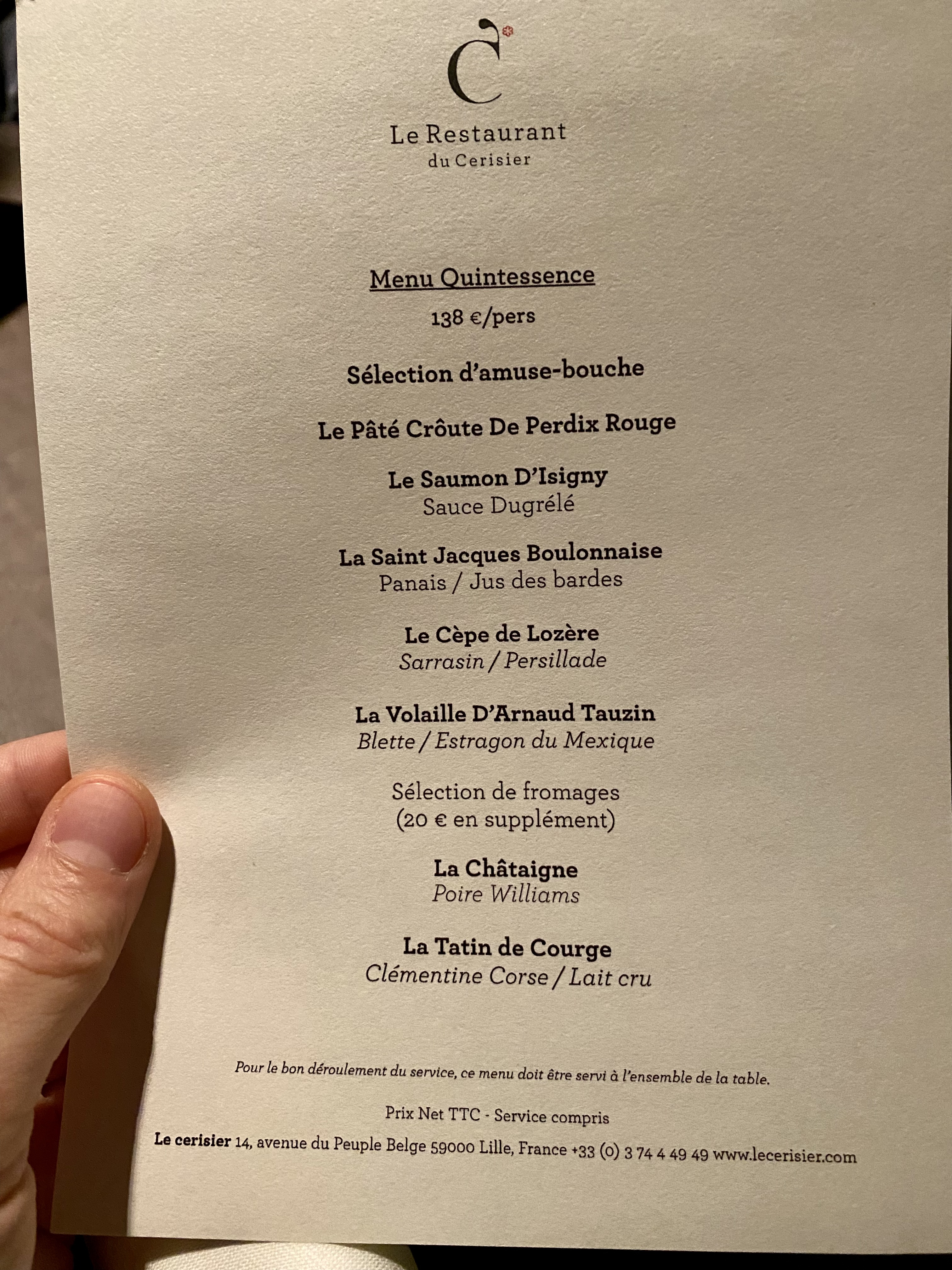 C'est la deuxième fois que nous venons dîner au Cerisier, et un seul mot résume ces deux moments : PERFECTION. Qu'il s'agisse du menu, des accords mets/vins, du service, de l'accueil, du cadre, tout est absolument parfait. Mention spéciale à Harry, dont le sourire et les pointes d'humour nous régalent autant que les plats! Merci beaucoup et à bientôt !