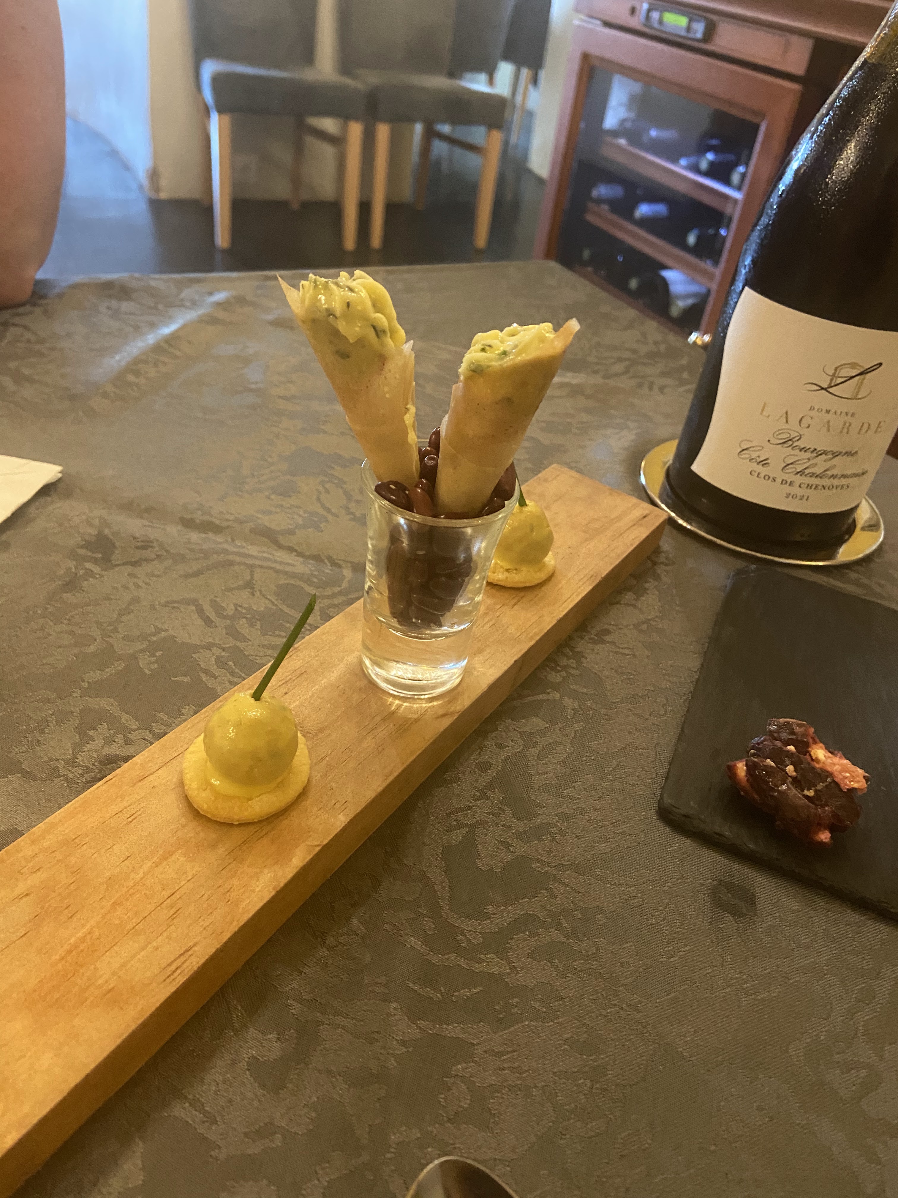 Après apéritif et ses mises en bouche, un dîner à 4 excellent sur le thème du petit pois. Des saveurs inattendues qui réveillent les papilles, il fallait oser ! En cuisine comme au service, tout était parfait.
