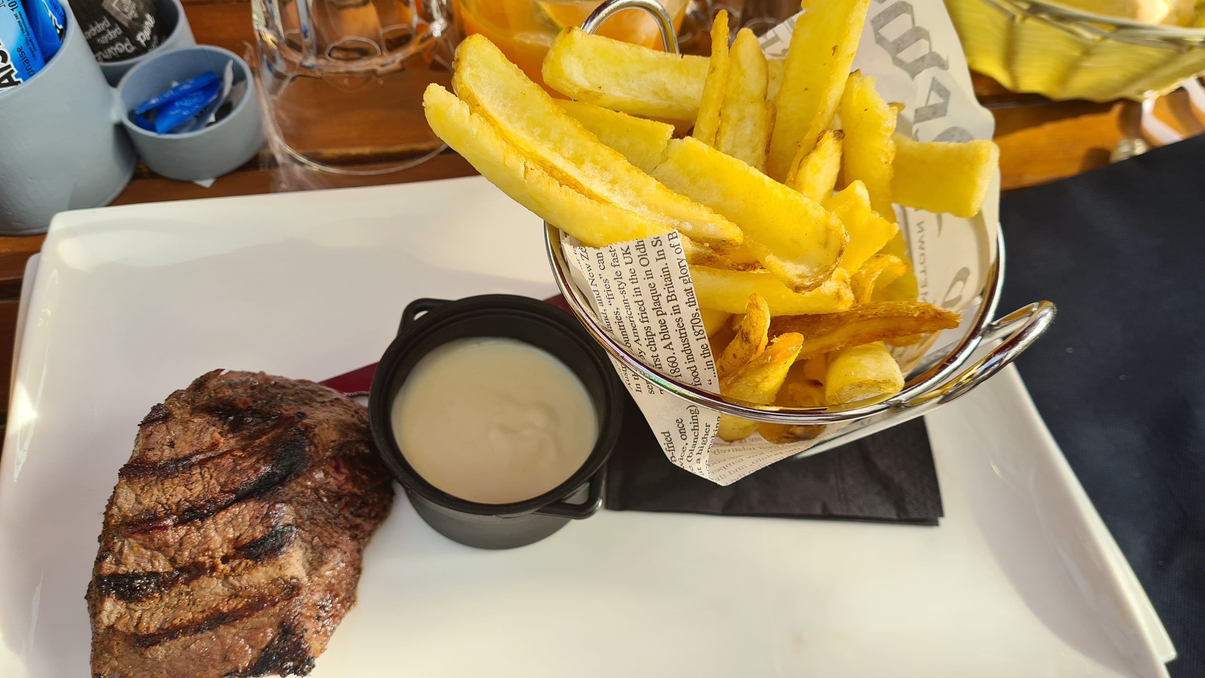Serveurs très sympathiques, servi très vite, néanmoins, la cuisson des steaks n’a pas été respectée :/c’est peut-être pour ça qu’on a été servi vite parce qu’ils n’ont pas cuit les steaks?😂 (Photos d’un steak « bien cuit » ci dessous)