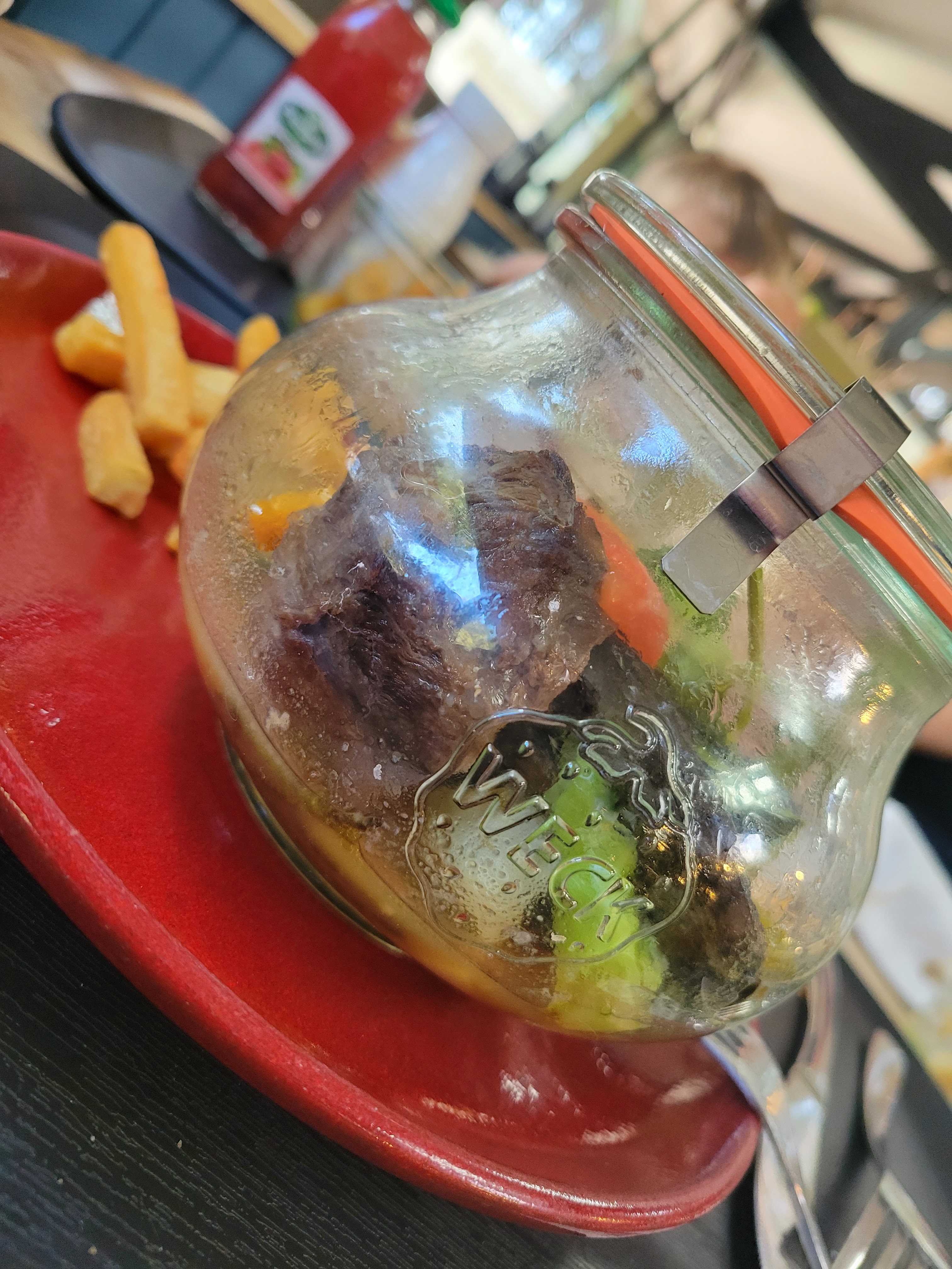 Un vol manifeste Un bocal soit disant contenant de la blanquette de veau et ses légumes...le seul bémol est que la viande se résumait à des tendrons et du gras. Ce plat ne correspondait pas à notre commande. Le dessert ....pomme et chantilly qui manquait grandement de fraîcheur Adresse à proscrire .