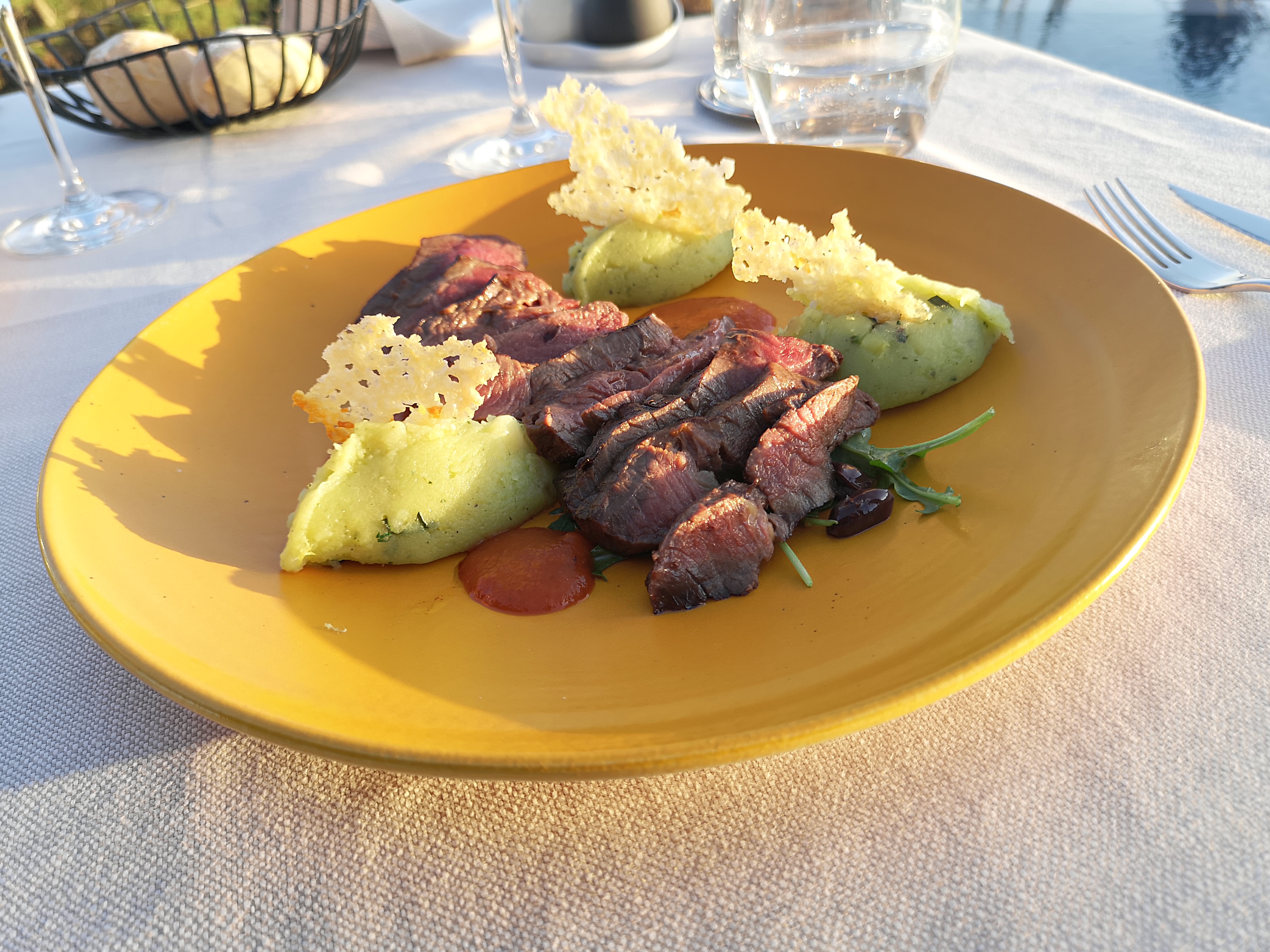 Le cadre merveilleux avec une vue superbe au calme ! Dans l assiette c’est très bon et très bien présenté ! Une belle adresse que cet hôtel 5 étoiles