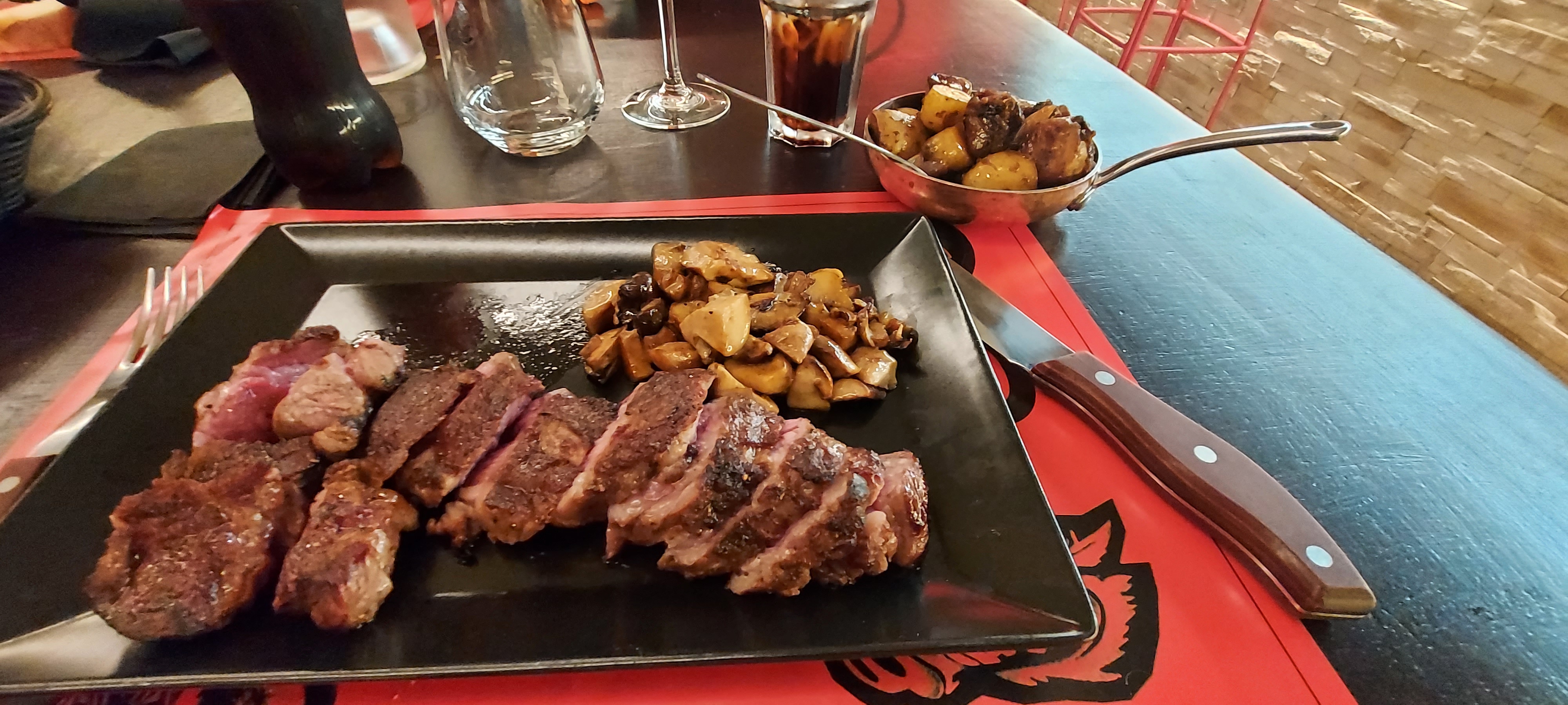Bienvenue dans le temple de la très, très, très bonne viande. Vegan et compteur de calories passez votre chemin! Ici on mange du plaisir! Bruno un grand gaillard qui joue devant à construit un restaurant à viande pour rugbymen et le résultat est magique. Grande tablée conviviale en bois massif, avec de grands bancs tout aussi massif. De quoi être bien installé pour voir Bruno, dans sa cuisine ouverte, vous préparer votre gros morceau de viande avec des accompagnements simples et délicieux. Si vous devez faire un détour de 100km faîtes le!!!