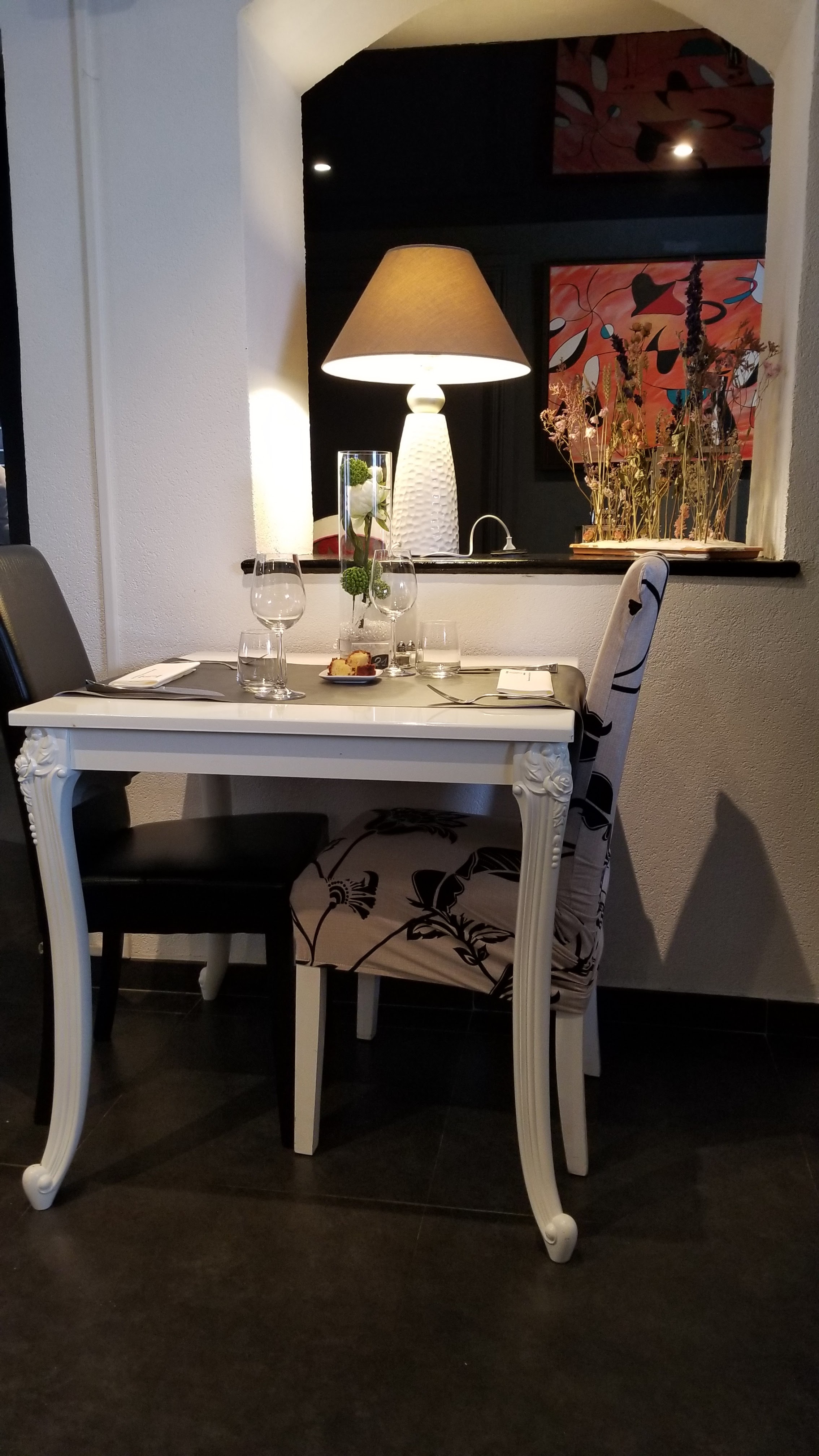 Facile à trouver, espace pour se garer, accueil enthousiaste et menu tout à fait excellent ! Produits de saison, locaux, extrêmement bien cuisinés, portions idéales. Dans un cadre moderne chic, déco baroque noir, blanc et rouge. Service sympathique, ni trop rapide ni trop long pour passer un moment agréable.
