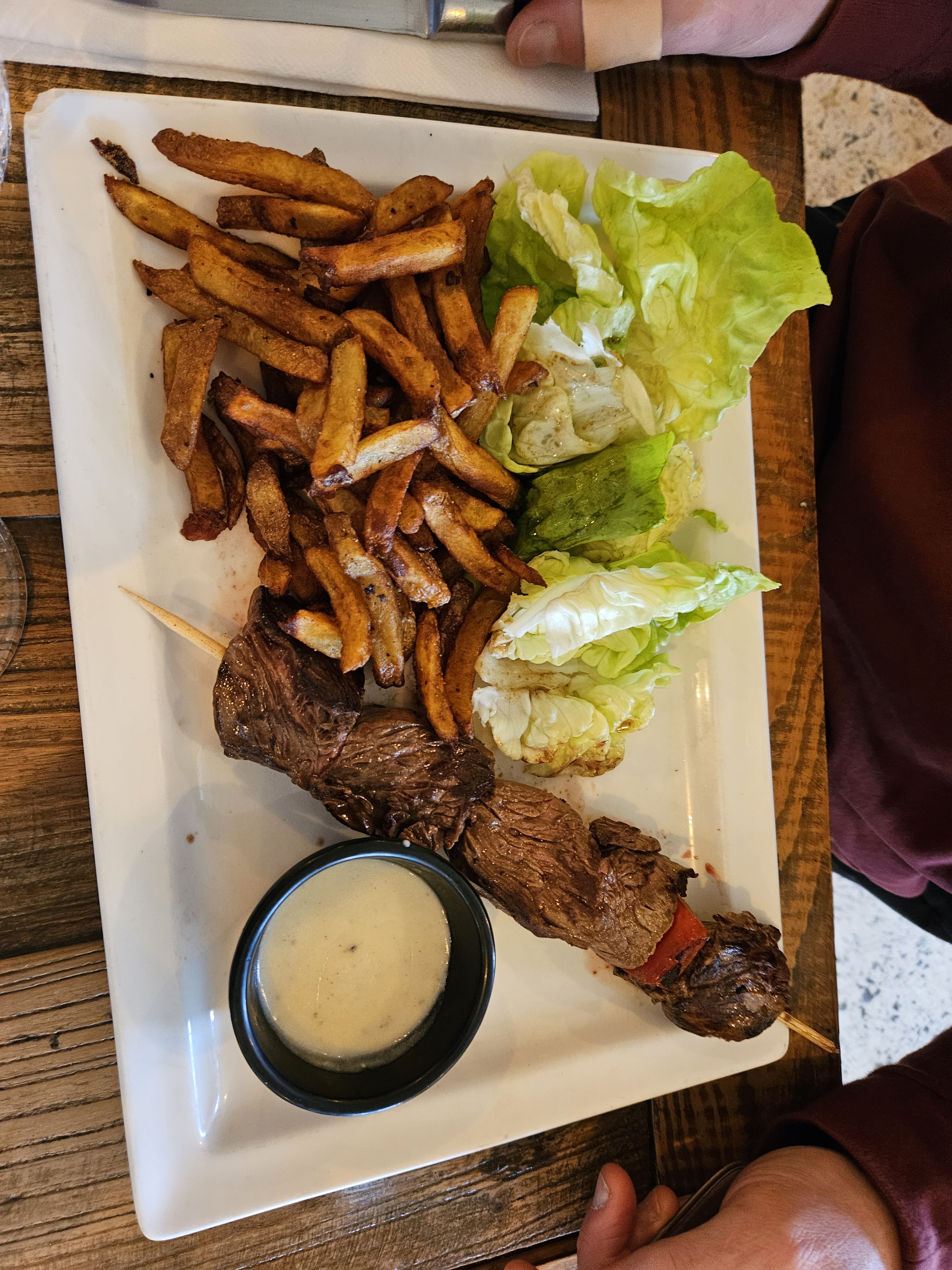 L'accueil peut effectivement surprendre au premier abord, allez y en vous disant que c'est un resto franchouillard et que vous n'êtes pas à l'abri d'une blagounette un peu limite (perso j'adore). Comme je le spécifie souvent, il faut toujours avoir conscience de l'endroit où l'on va et clairement on ne joue pas dans l'étoilé... Maintenant si on passe la porte d'un établissement qui s'appelle le Resto des Bouchers, c'est que l'on est un peu carnivore et que l'on ne vient pas y chercher des brocolis vapeur à l'eau d'Evian. Début des hostilités avec une planche de charcuterie en entrée que nous avons partagée tellement elle est généreuse... Ensuite je me suis lancé sur l'onglet en brochette, cuisson bleue bien sûr, je ne suis ni chirurgien ni cordonnier... Une des meilleures viandes que j'ai eu l'occasion de manger de mon existance, goûteuse, tendre et fondante comme dans une pub... Du coup pas de dessert pour ne pas perdre la saveur que j'avais en bouche !! Un 5 sur 5 général pour moi !!! Le 25/03/2024