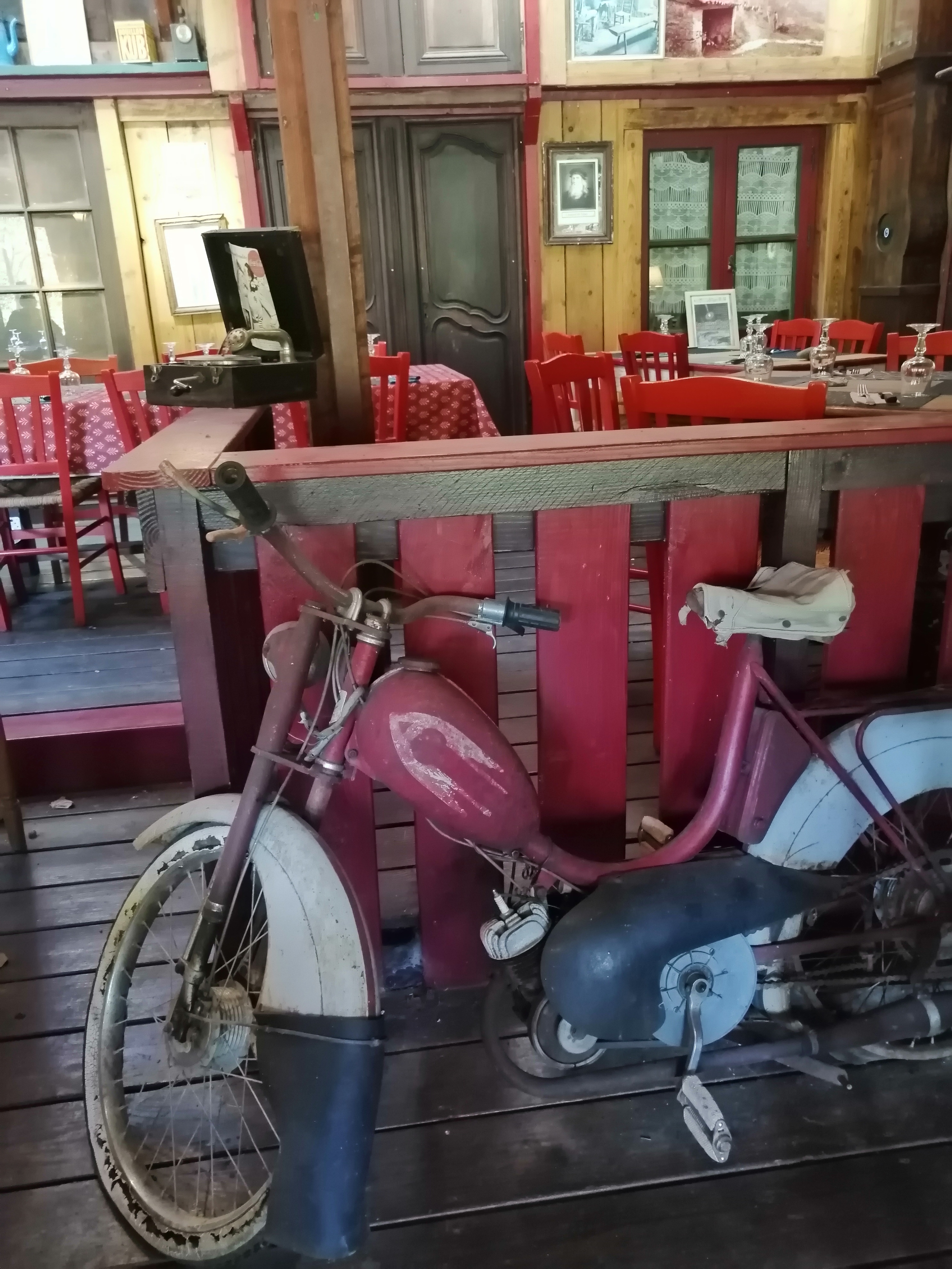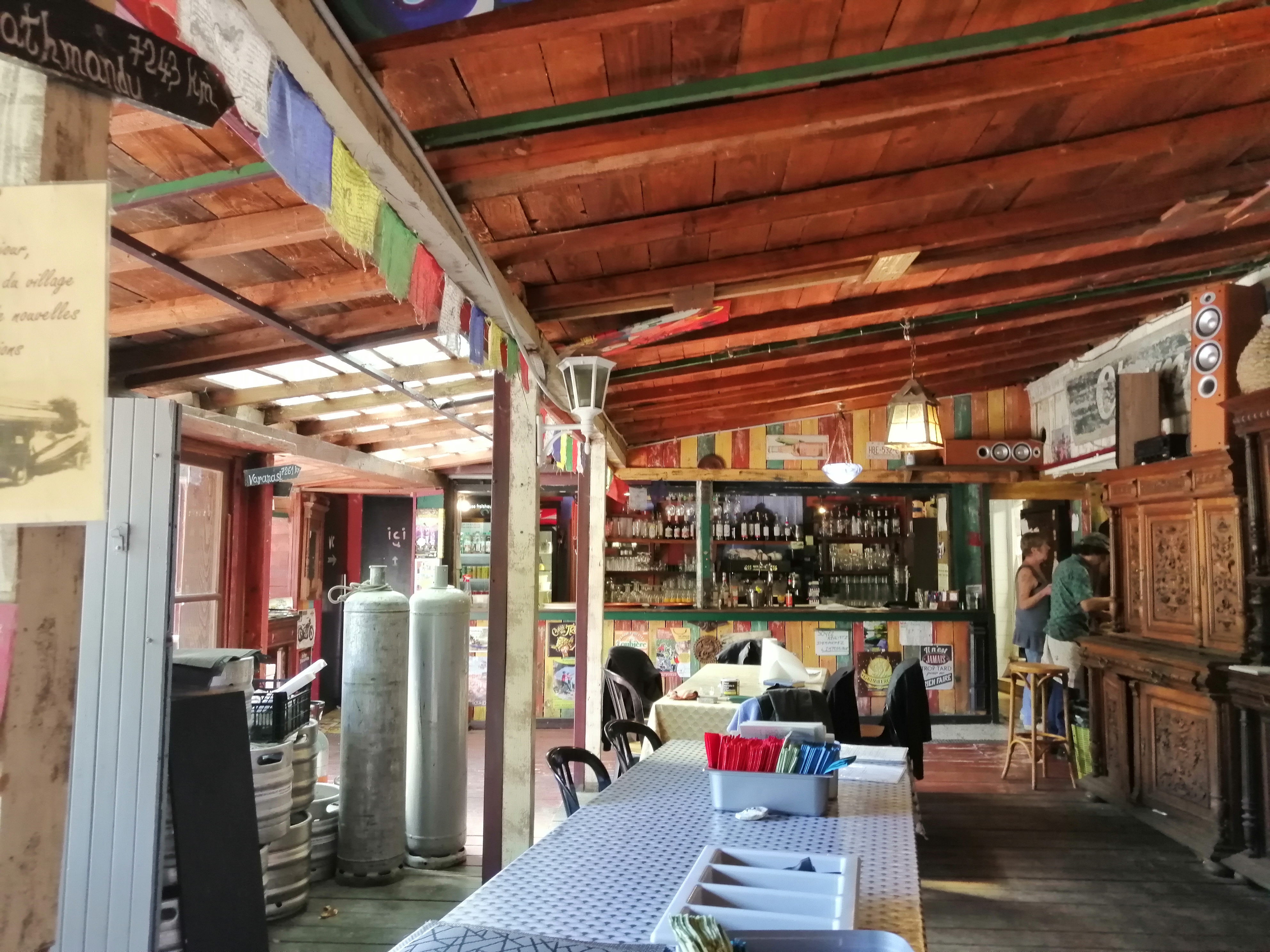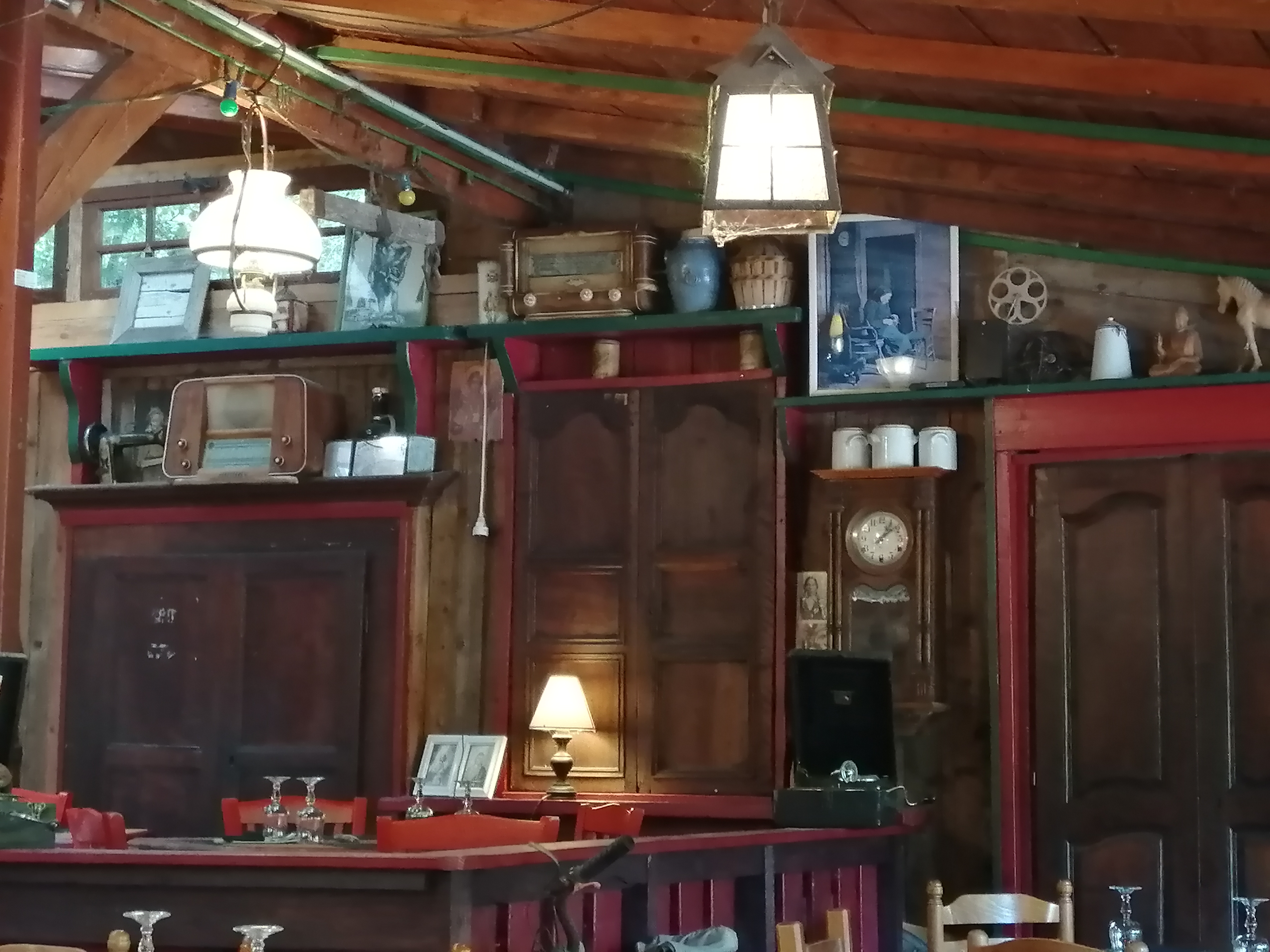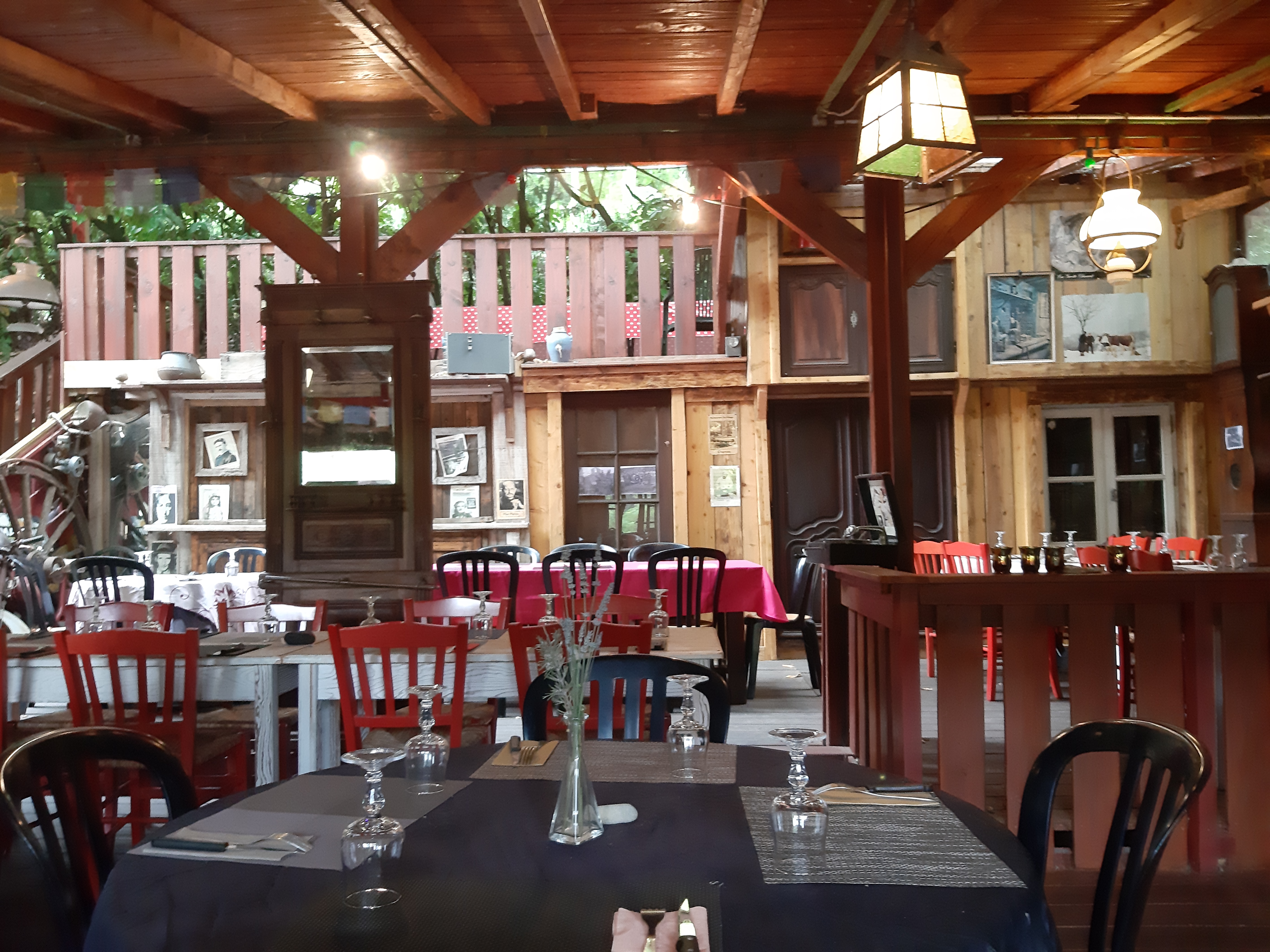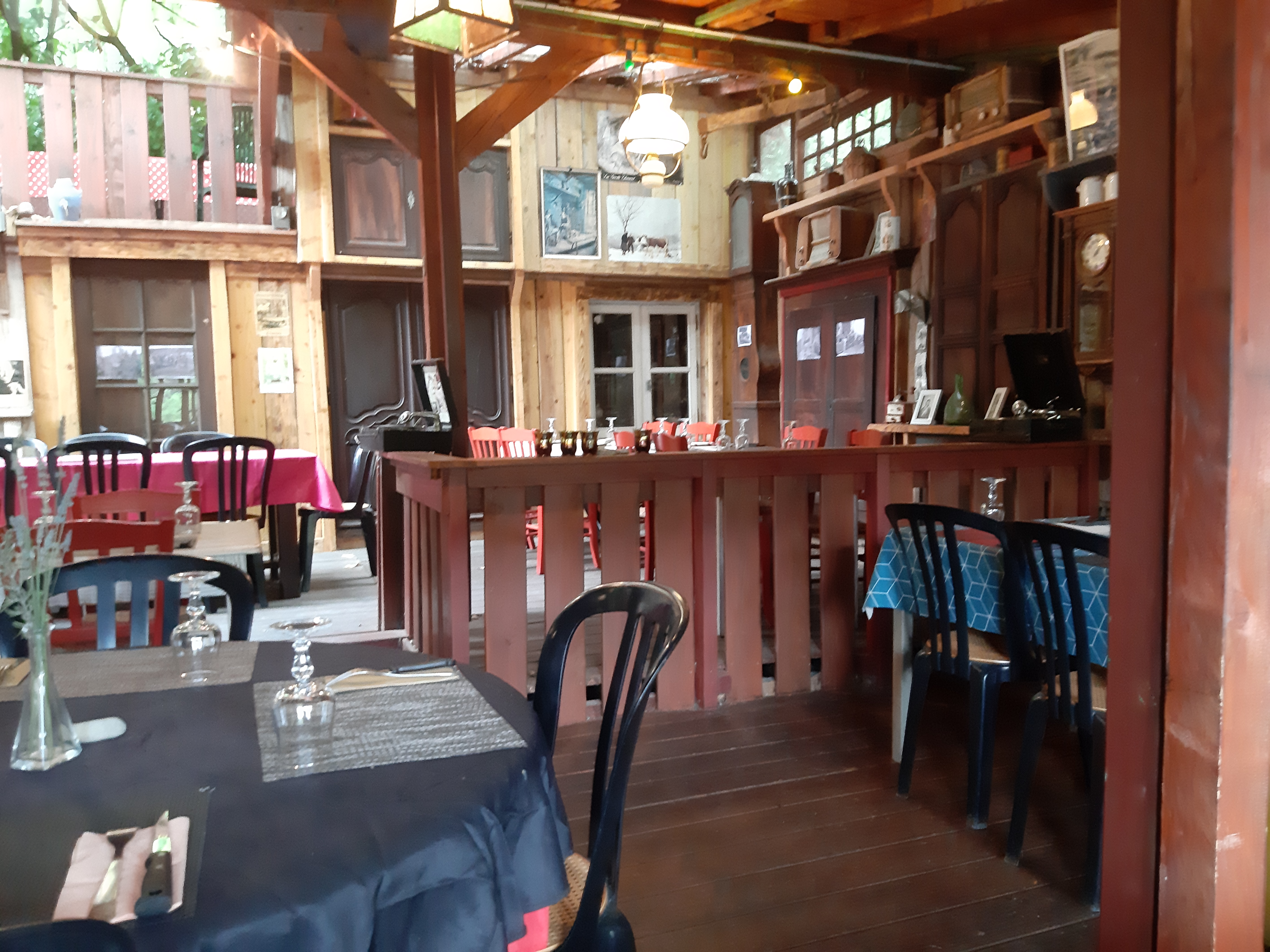 Atypique, construit avec des matériaux de récupération, meubles de brocante Bonne et généreuse cuisine Nous avons pris une assiette de charcuterie à 4 avec l'apéritif et j'étais déjà rassasiée.... ensuite des plats avec 5 légumes... Filet mignon de sanglier,2 grosse tranches de gigot, moule frite pour nos plats.. nous y étions un soir d'orage, c'est en bord de route c'est ouvert sur l'arrière,il y a des chauffages d'appoint mais c'était pas la grosse chaleur mais très sympathique... après nous il y a eu de la musique....je serai bien restée