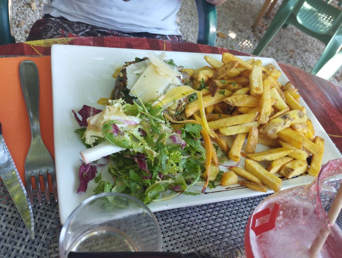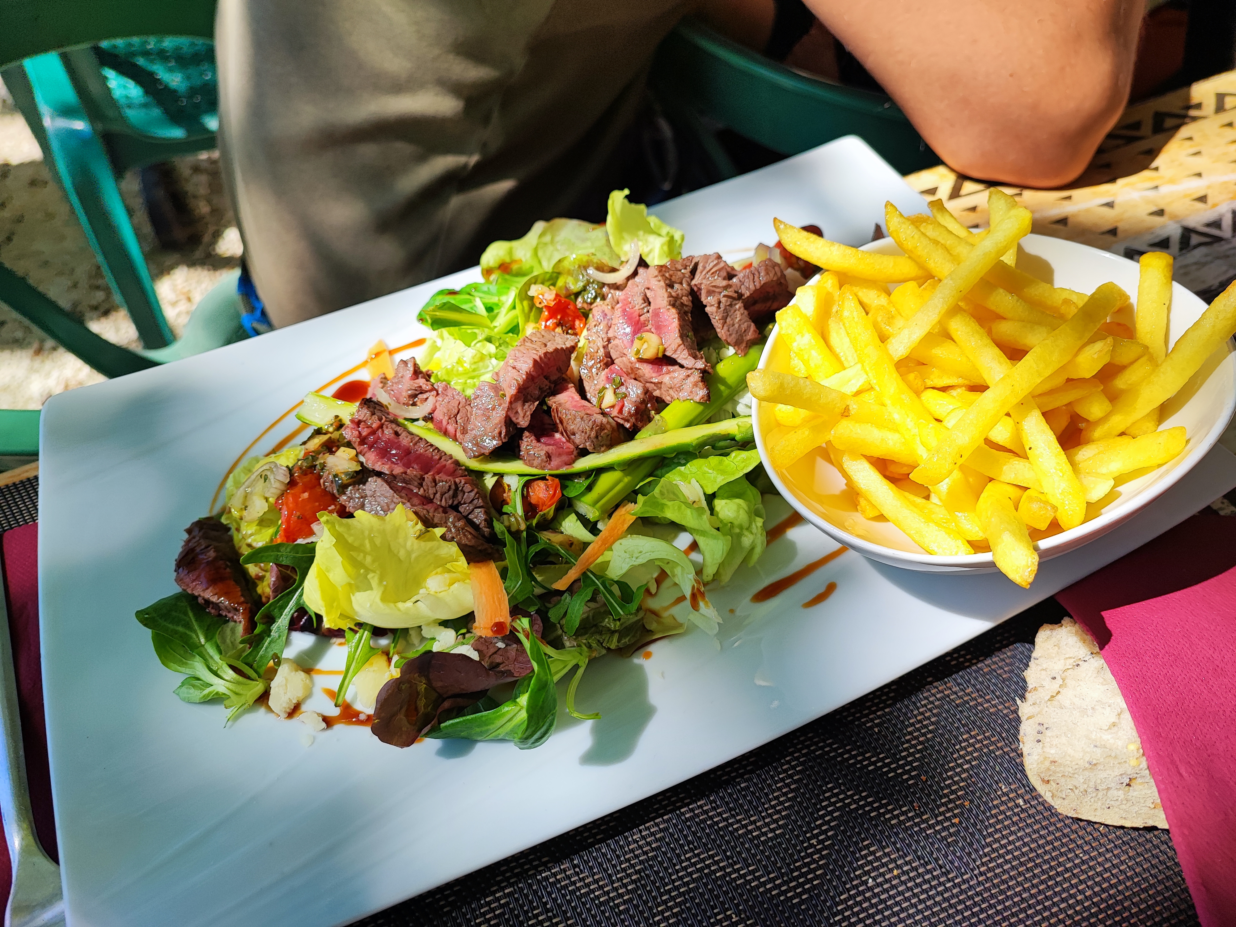Comme ne l’indique pas le nom du restaurant, ce restaurant est en bord de route offrant des places de parking, avec des tables à l’ombre des platanes (même si c’est compliqué par grande chaleur). Nous avons eu un accueil charmant, tous les plats étaient très bons (Salade César, entrecôte frites et sa petite salade, souris d’agneau avec légumes et semoule), des desserts faits maisons et d’autres pas mais annoncés par la serveuse. Pour ma part excellent rapport qualité prix. Une belle découverte.