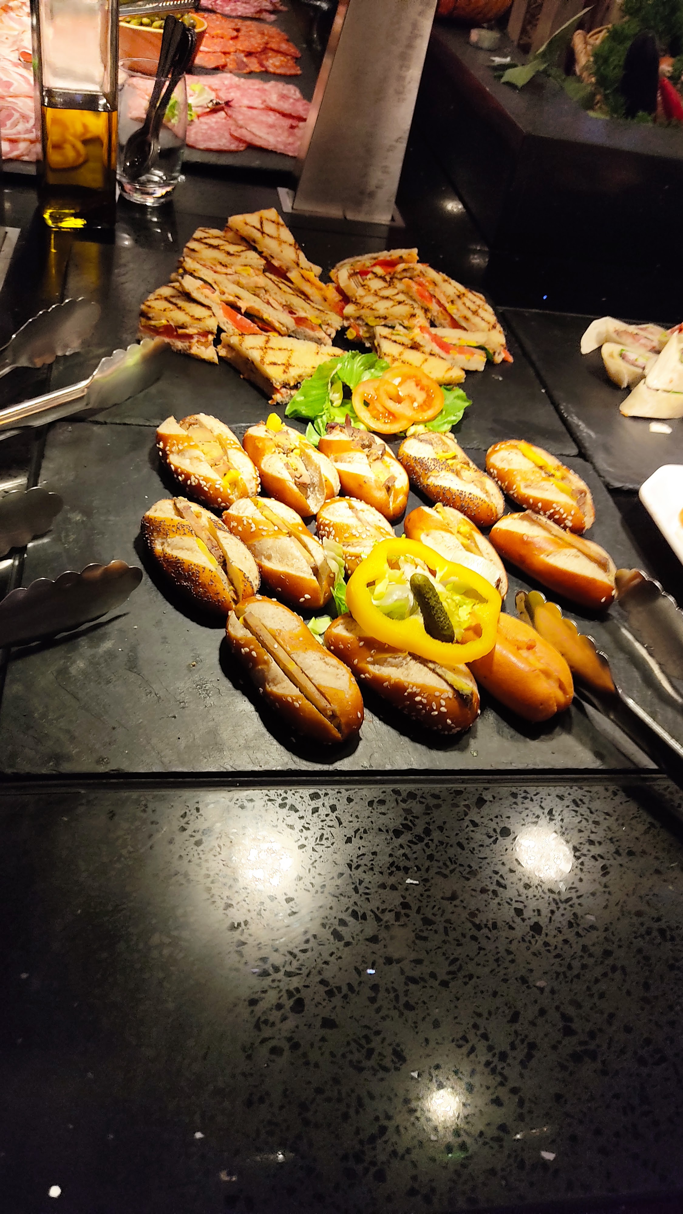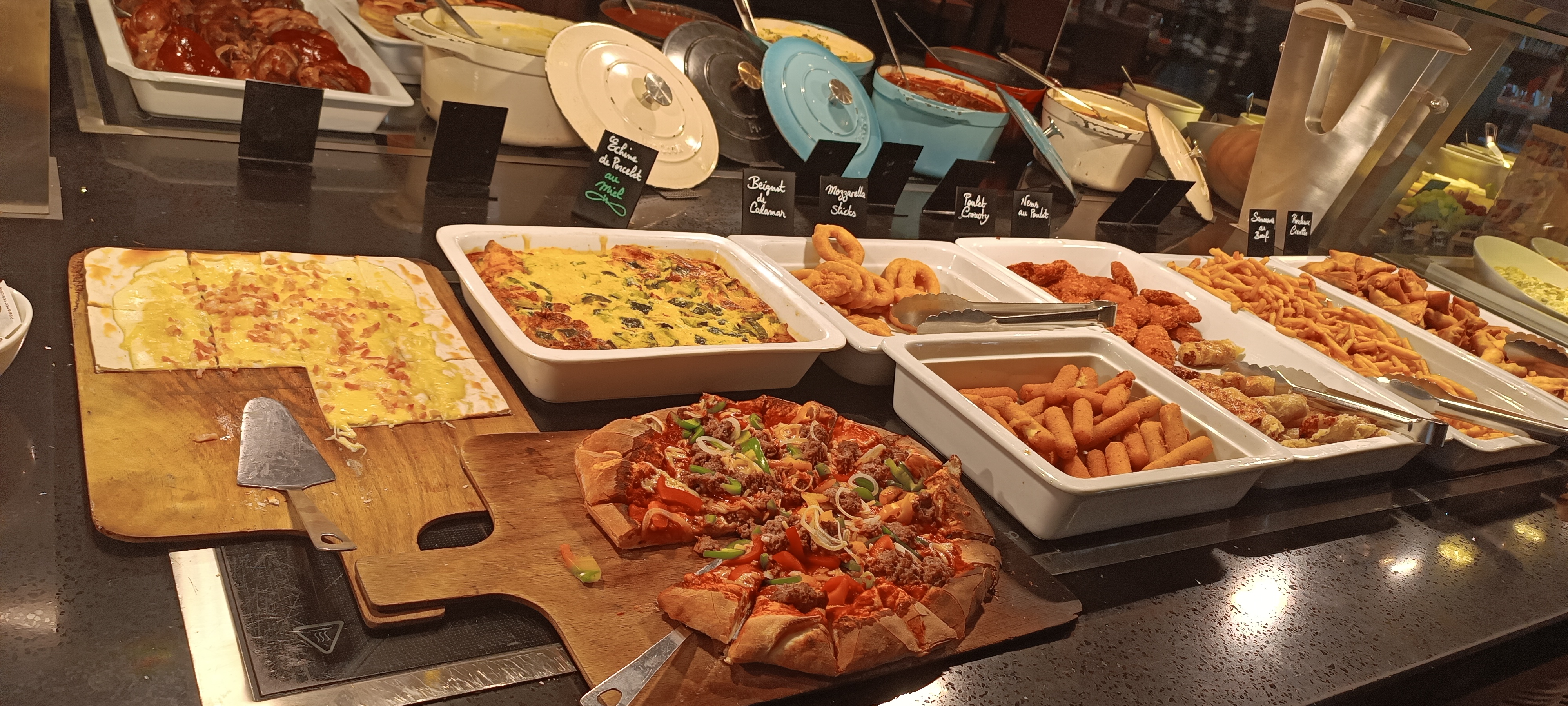 Super concept qui est peut-être un peu trop ambitieux. Super bâtiment avec une belle décoration, accueil correct. Des pizzas, des tartes flambées, crevettes, moule marinière, huître, charcuterie, pâtes, légumes, des sauces et pleins d'autres plats chauds recouvrent un large choix qui doit pouvoir au moins tenir toute la soirée, le service devrait vérifier plus souvent et charger directement les plats qui sont en manquent. Vérifier aussi la température des légumes ou peut-être investir dans des bains-marie car au-dessus certains légumes étaient froids. Au niveau du grill le bœuf était nickel comme je l'avais demandé et la sauce aux échalotes succulentes, malheureusement le poulet et le saumon manquait cruellement de cuisson et sur ce type de viande mieux vaut trop que pas assez. Au niveau des desserts ça a un air d'industriel.