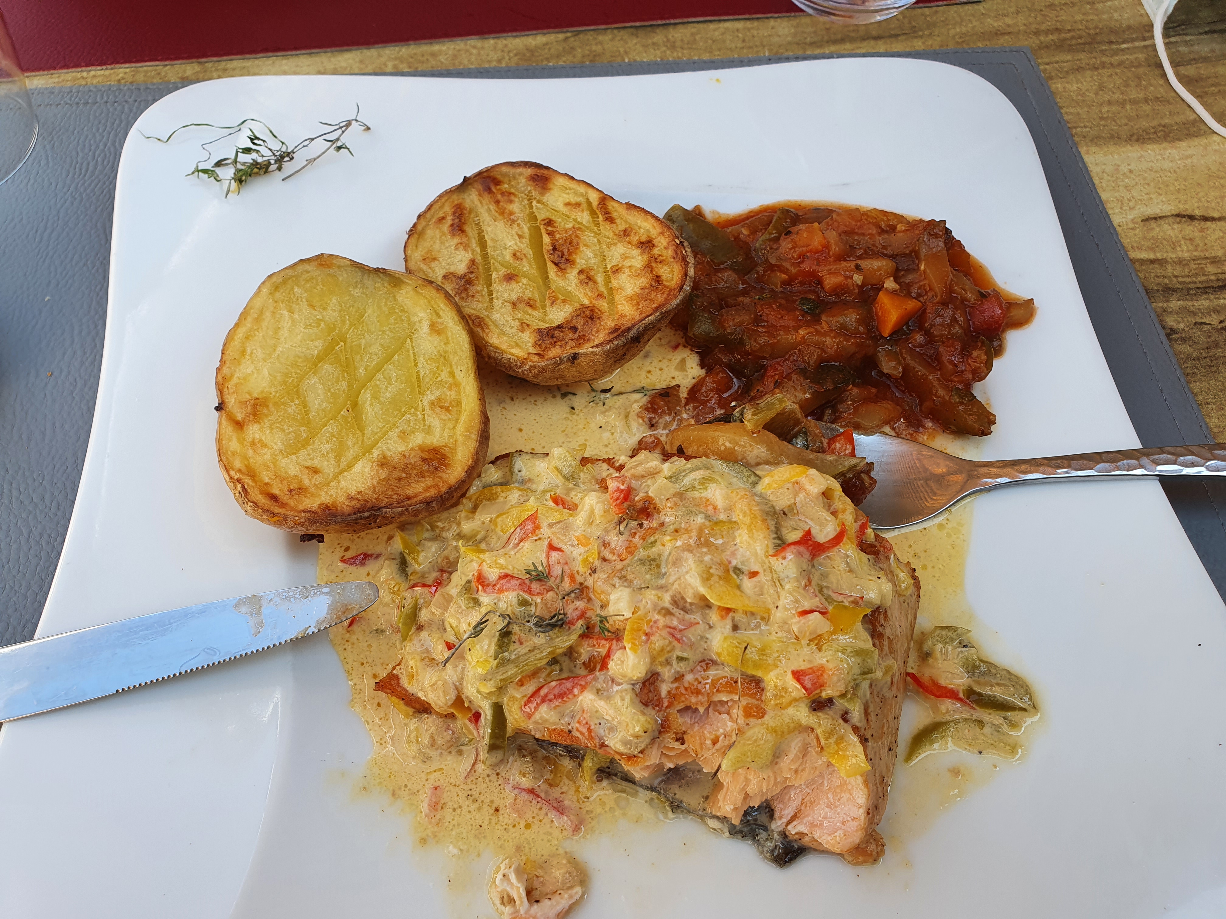 Absolument délicieux ! Moi qui n'a jamais l'habitude de finir mes assiettes au restau, là, ce fût le cas ! J'ai même essuyé mon assiette avec le pain pour ne rien laisser c'est pour dire. Madame a été conquise par le cheesecake en dessert, en plat nous avons prit fricassé de poisson pour elle, et rôti de jambon pour moi servit avec une ratatouille et un petit gratin dauphinois, un vrai régale !!! Et ne parlons même pas de l'entrée qui bien plus que délicieuse !! Le service et l'accueil était parfait, nous n'avons pas attendu plus de 5min entre chaque plat, le chef est même sorti pour demander comment cela c'était passé, au top du top ! Merci à Stéphane de la balade en bateau apéro pour nous l'avoir conseillé 🙏🏼🙏🏼