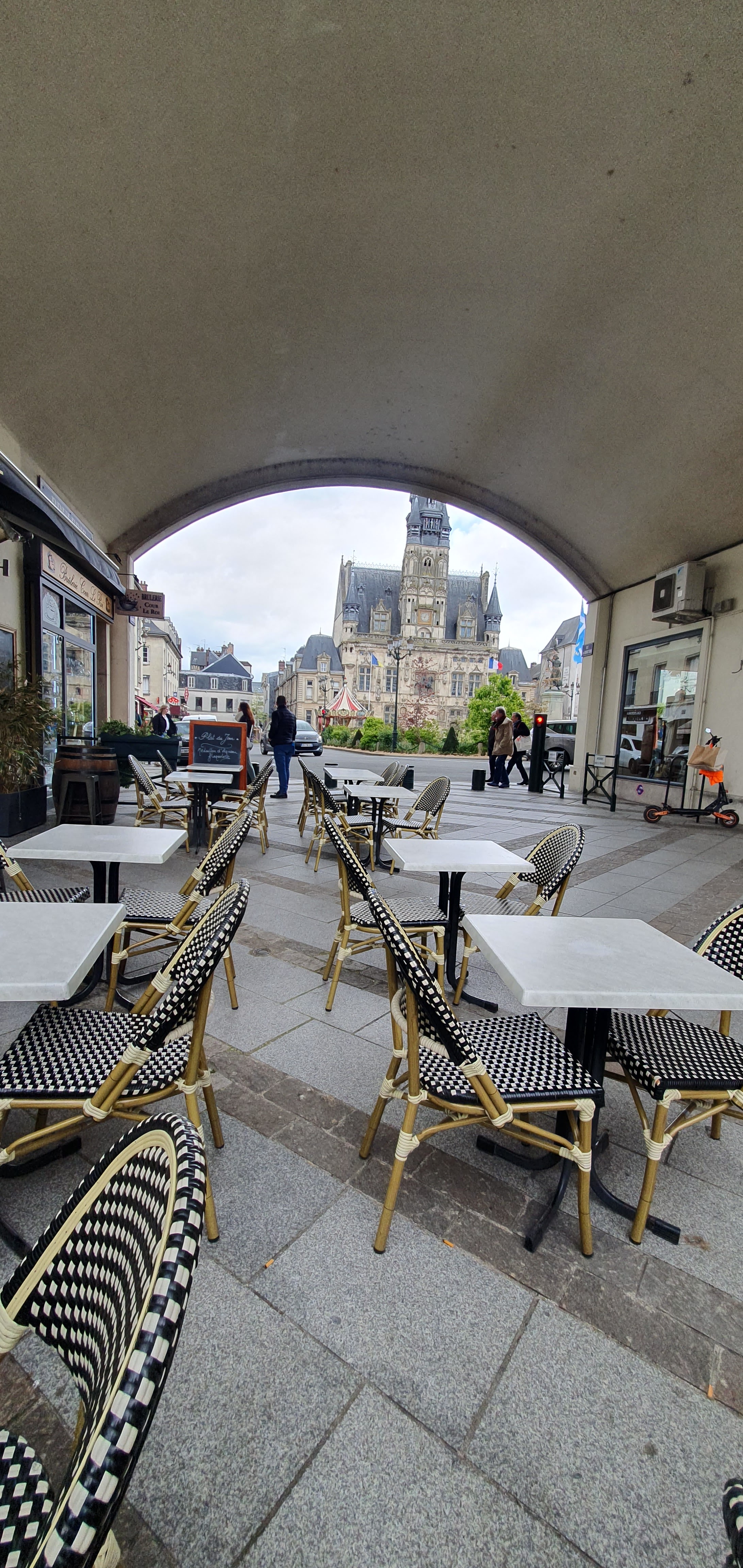 Avec une jolie vue sur l’hôtel de ville, depuis la terrasse. Le personnel y est particulièrement souriant et attentif. Même pour un simple café verre d’eau. La restauration du midi y est tout à fait bonne et le rapport qualité prix est la.