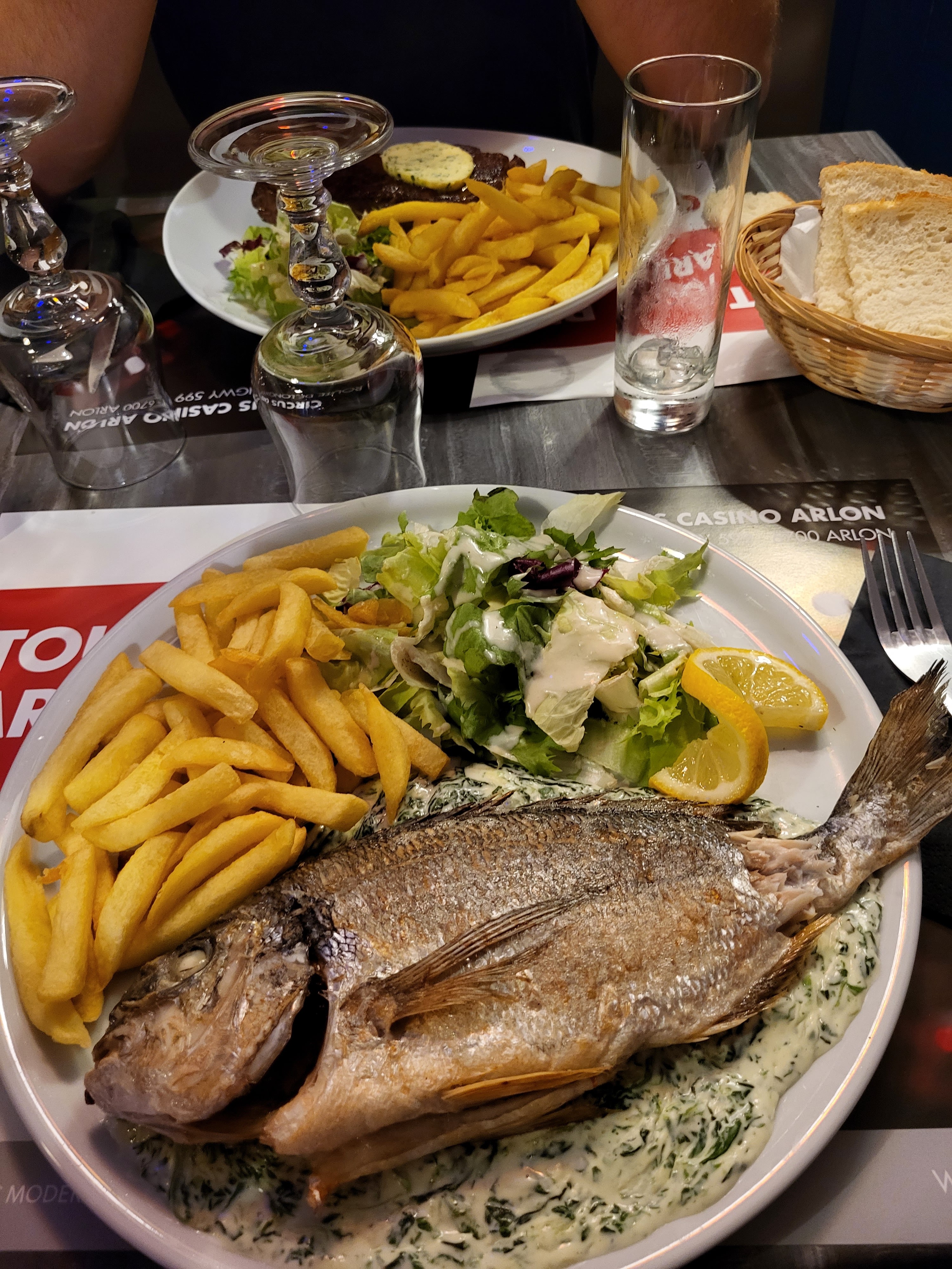 Tres bon dejeuner avec cuisses de grenouille et faux filet, le vin rouge en pichet etait bon