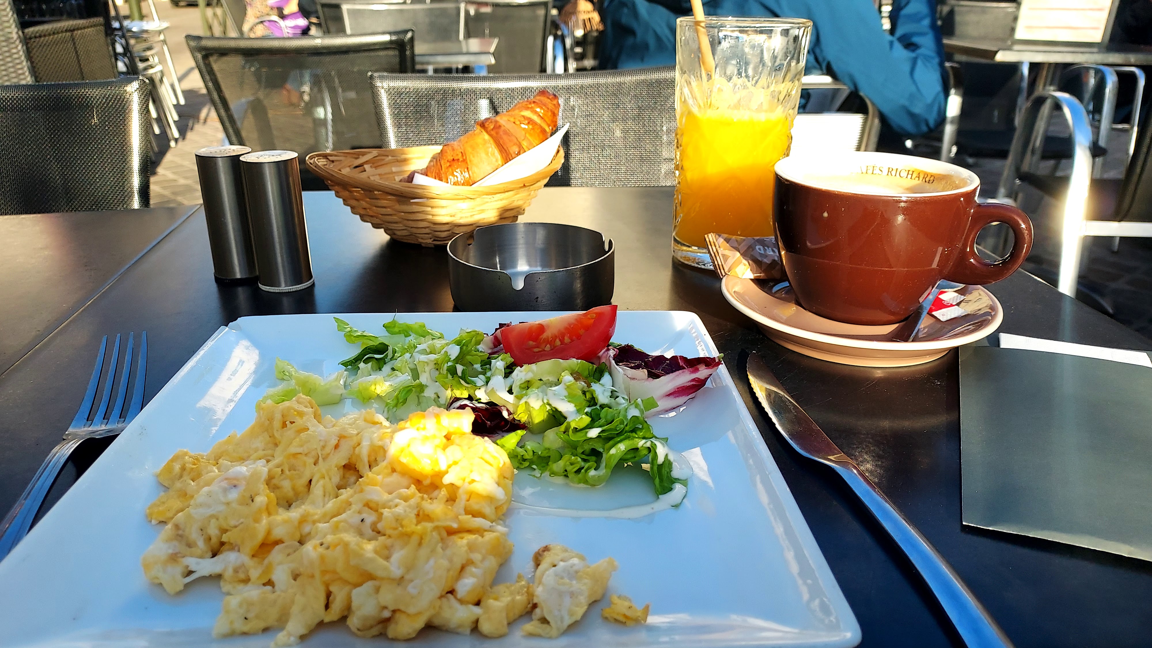 Excellent petit déjeuner complet ! Des œufs brouillés avec une salade croustillante avec une belle vinaigrette légère, un croissant avec du beurre et de la confiture, ainsi qu'un café au lait et du jus d'orange fraîchement pressé - parfait ! Les entrées du déjeuner étaient délicieuses ! Les serveurs étaient toujours sympathiques et efficaces. Si vous n'avez pas le temps de dîner, procurez-vous un café au lait à emporter !