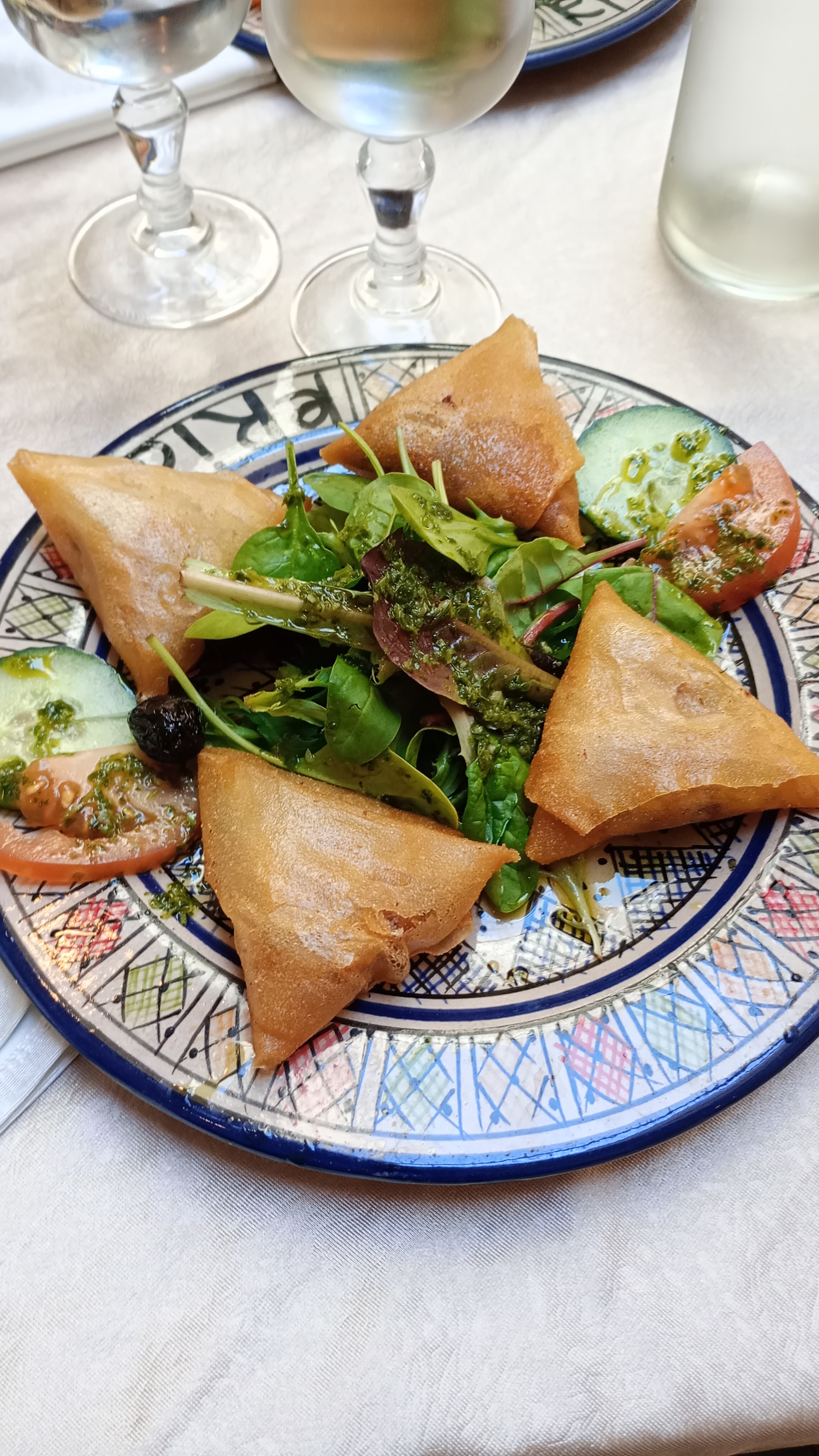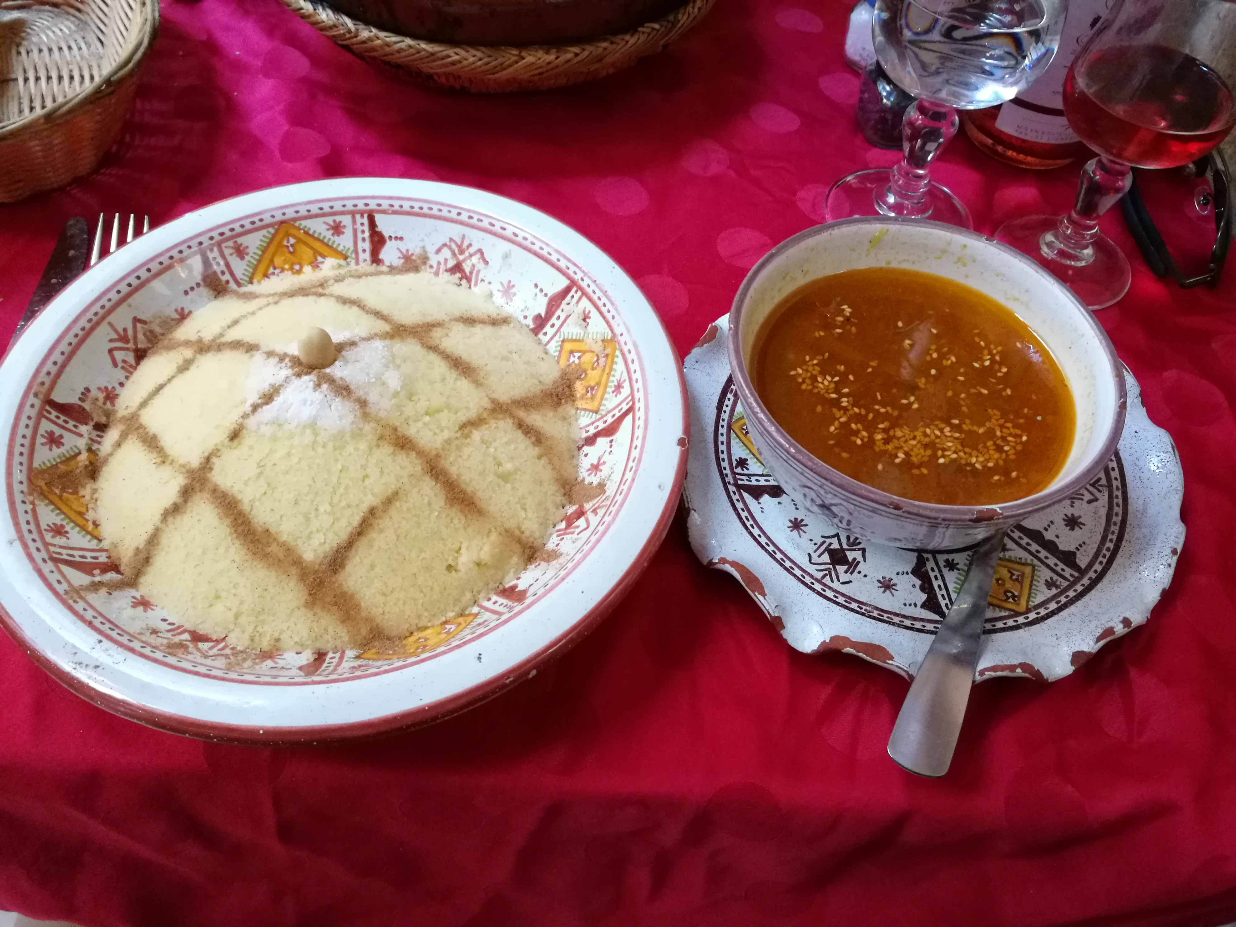 La nourriture était fraîche à chaque instant du repas. L'entrée d'un assortiment de briwattes avec du fromage de chèvre dans l'un et haché dans l'autre était excellente. Le plat de seffe ainsi que l'agneau et les prunes étaient tout aussi incroyables. Un agneau si tendre aux saveurs variées, salées et sucrées. Mêmes sentiments pour le seffe, un plat de poulet et de coucous avec de la cannelle dessus et un accompagnement de bouillon. Le vin rosé aurait besoin d'être amélioré, mais ils n'y sont pas parvenus.