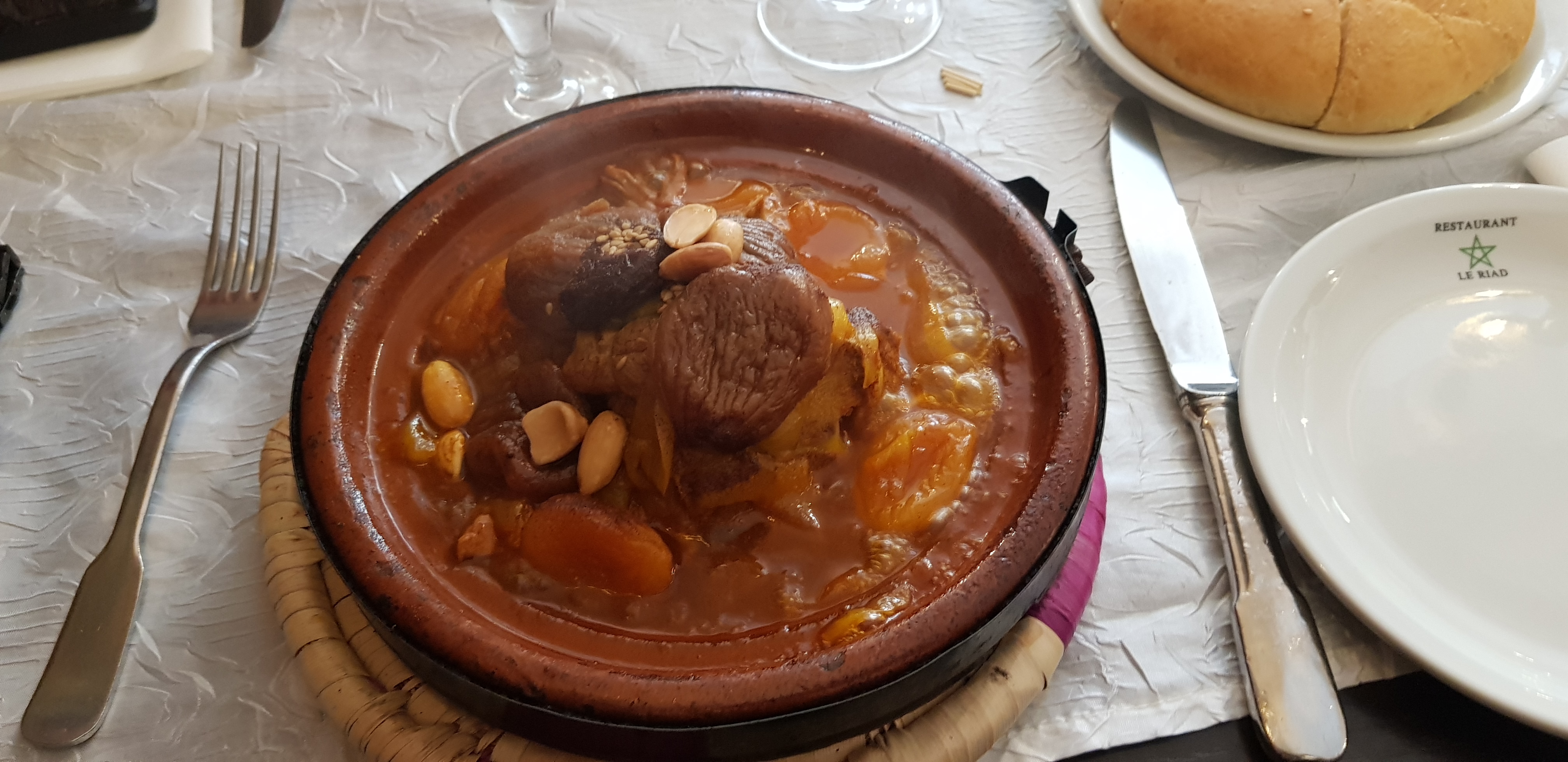 interieur du restaurant joli.ceci dit le service est tres tres tres long.nous avons commande couscous pour 3 qui etait bon mais tres decu quand on a constate que le serveur ne laissait pas la semoule a table.dans le passe le RIAD laissait tout a table avec plus de quantite.de plus, le bouillon etait beaucoup trop clair avec trop peu de legumes coupe en fines tranches.2 cuilleres a soupes de pois chiches servis dans une coupelle et non dans le bouillon ce qui n a pas permis de leur donner du gout et nous adorons les pois chiches nous avons ete tres tres decus.quant au menu enfant avec cuisse de poulet l enfant n a eu le droit qu a un haut de cuisse et non une cuisse entiere.c est un peu leger pour un ado.le menu enfant jusqu a 12 ans est qd meme a 12,50€.nous avons commande 3 the a la menthe est toujours pas servi au bout de 30 min .nous sommes donc partis en annulant le the donc pas eu le plaisir de le savourer. qd vous commandez une assiette de dattes fourree a l amande a plus de 7€ et bien vous n avez le droit qu a 4 petites dates .c est plus que cher pour 4 dates!!!160€ pour 3 adultes et un repas enfant ca fait tres cher pour un resultat plus que moyen.tres tres decu .