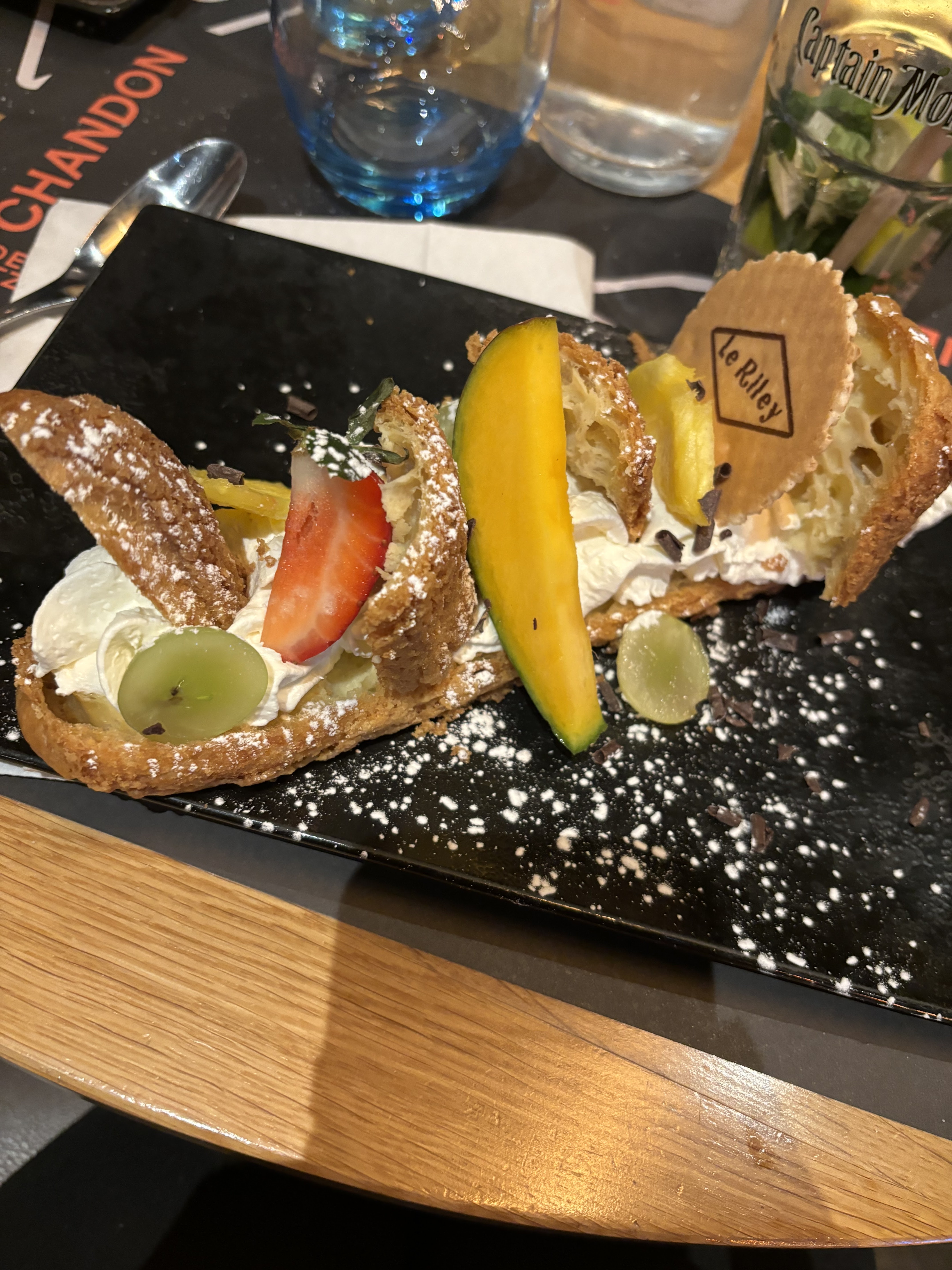 Service désastreux, continuer de servir à table sans jamais desservir au prealable Les verres d’apéro et bouteilles vides restés jusqu’au dessert malgré nos demandes. Une table de 6, 5 plats servis, le 6 ème arrivant 15 mm après, en me redevant ce que j’avais commandé. Arrrives 12h30, reparti à 15h00 passé en zappant les desserts. Trop long, 3 desserts payés, pas consommés. Offert. Merci le Riley. Plus jamais