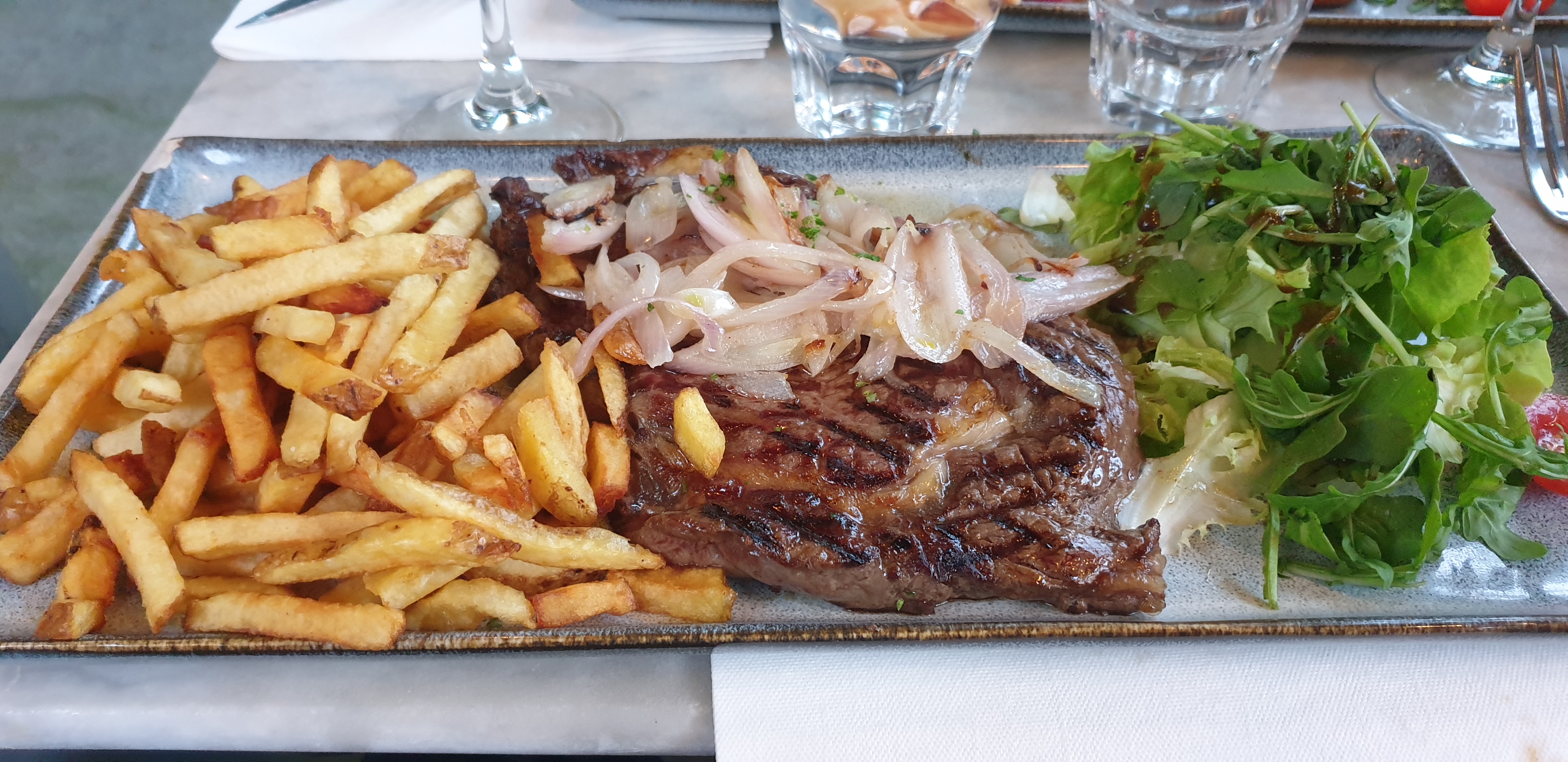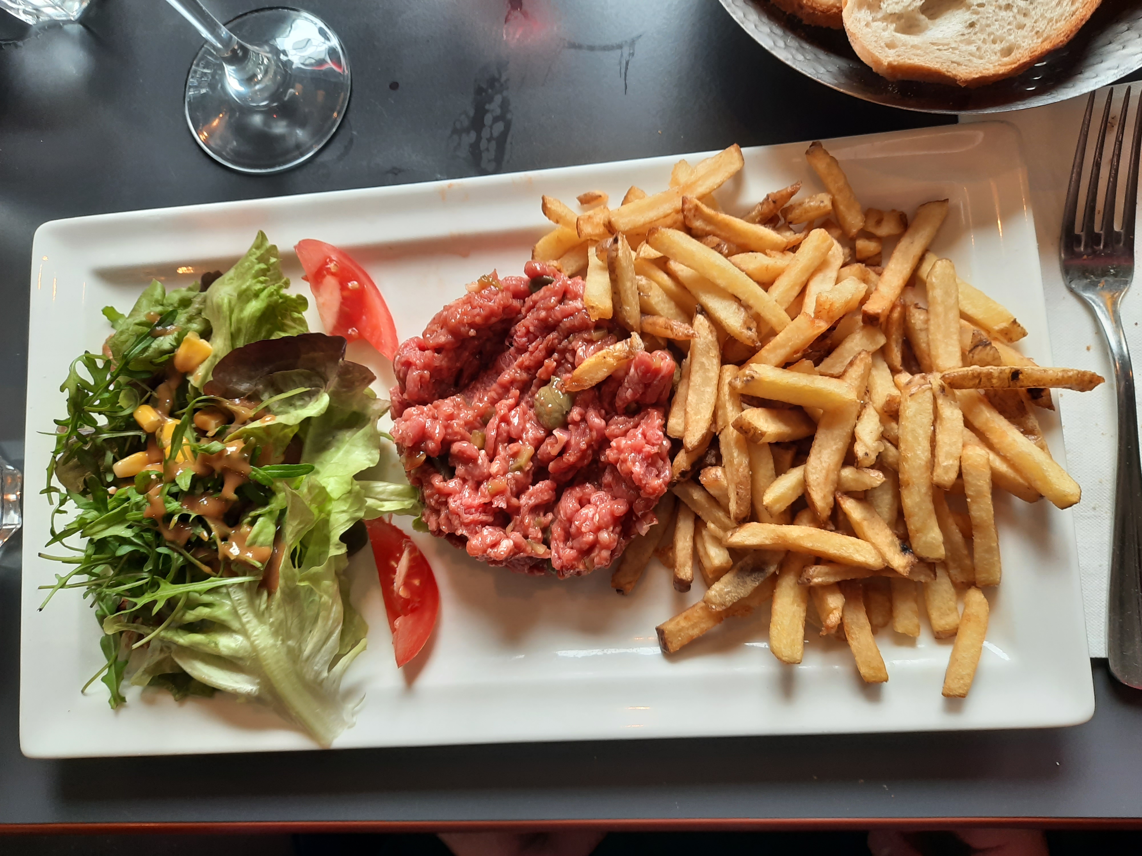 Très bonne expérience. Nous étions 2 couples. Service très agréable. Le lieu est un peu bruyant au départ mais nous avions réservé dehors (obligatoire à notre avis). Pour le repas de très bonnes portions. Le steak tartare était bien copieux peut être un peu trop sucré à mon goût, et accompagné de frites maison et d'une salade. J'aurais préféré faire mon mélange moi même, néanmoins très bonne expérience, nous reviendrons c'est sûr. Pour le service parfait, pas d'attente, une serveuse souriante et attentionné. Vraiment très bien.