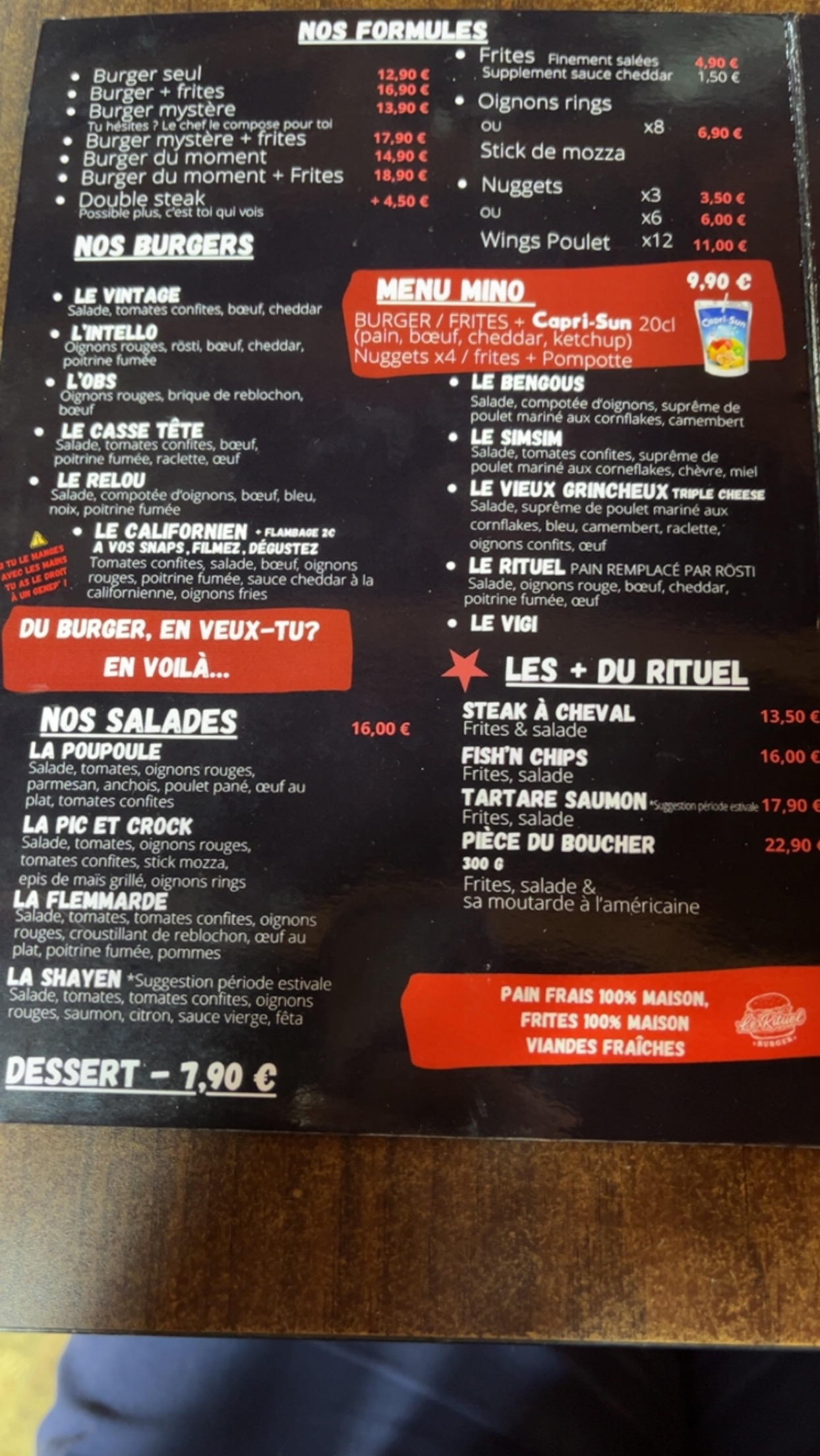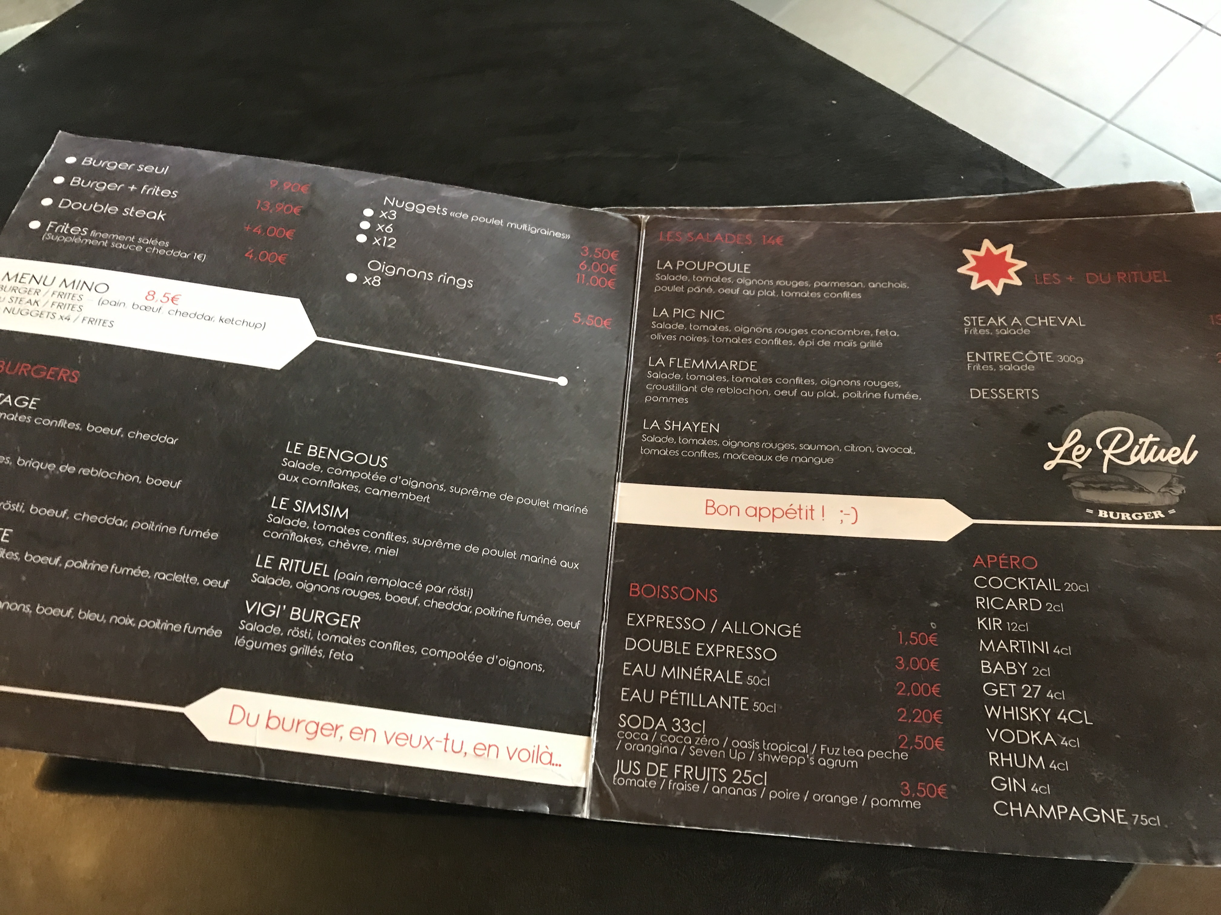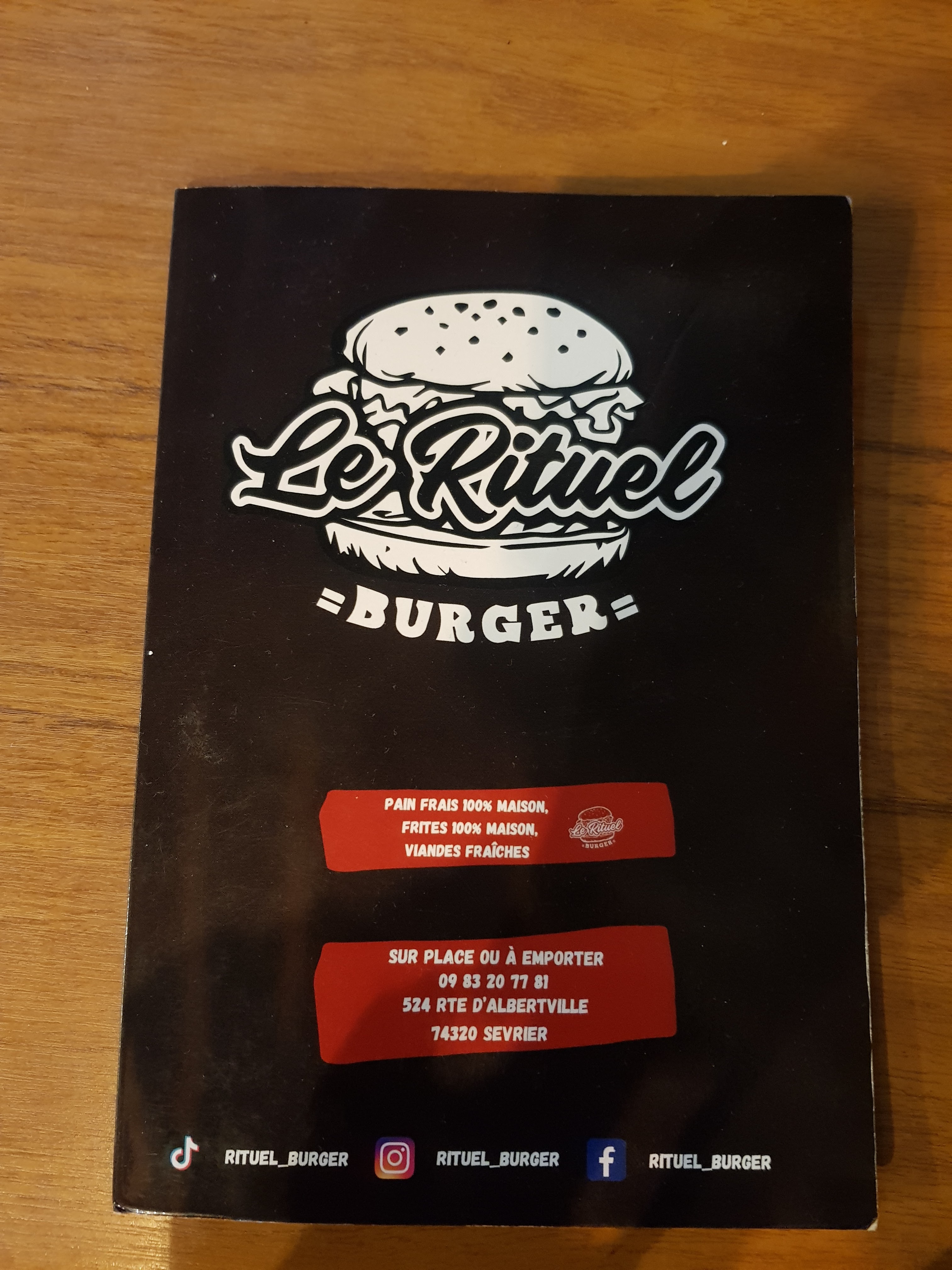 À première vue , à quelques pas du Lac ..ET,chapeau bas: un Lundi: ouvert 21h30 passées !!!! Avec une serveuse agréable souriante dynamique dans un ptit coin atypique bar resto , Le Rituel Burger aux allures de super héros et sorcier... vous accueillera les Bras ouverts et ... vous comblera de ses burgers diversifiés... au juste prix ! Merci