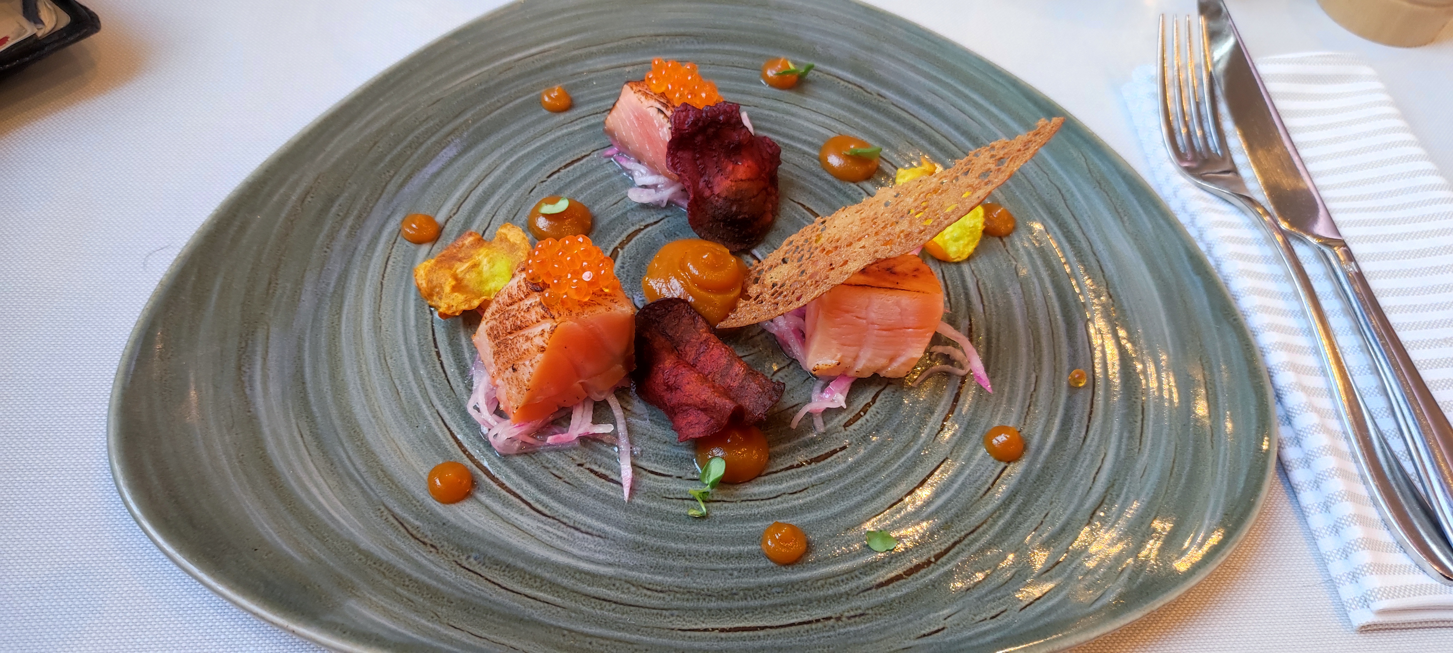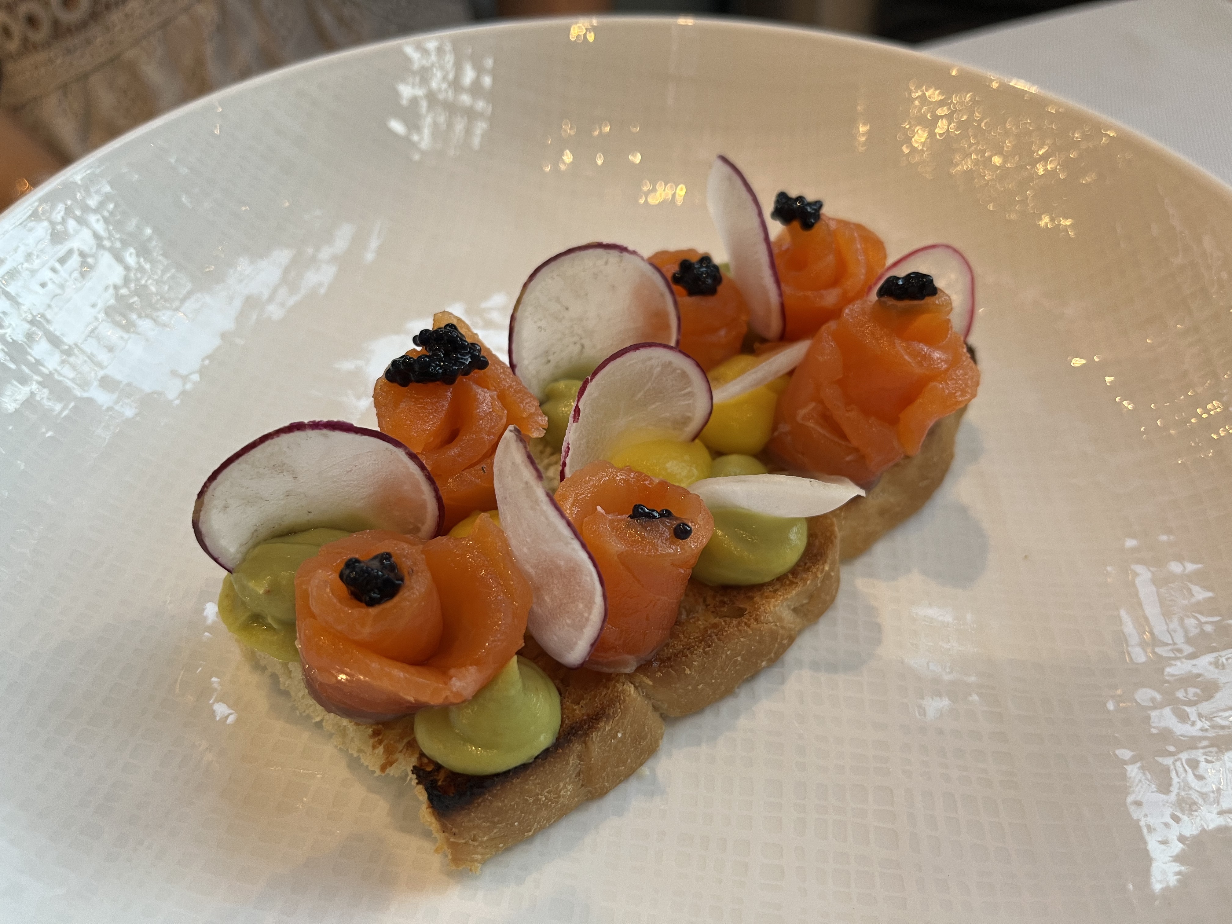 Après avoir bien jouer au casino nous avons décider de manger au riva. Service au top personnel vraiment agreable. Mais pour de ce qui est de la cuisine vraiment limite velouté froid foccacia froide la tranche de pain imbibé et pour ma part pas une vrai foccacia entre le tartare qui manque réellement d’assaisonnement et le risottos qui manque de chaleur et plutôt fade en goût je suis vraiment déçu pour un palace. Je pense tout simplement que les plat sont préparer à l’avance. Vraiment déçu