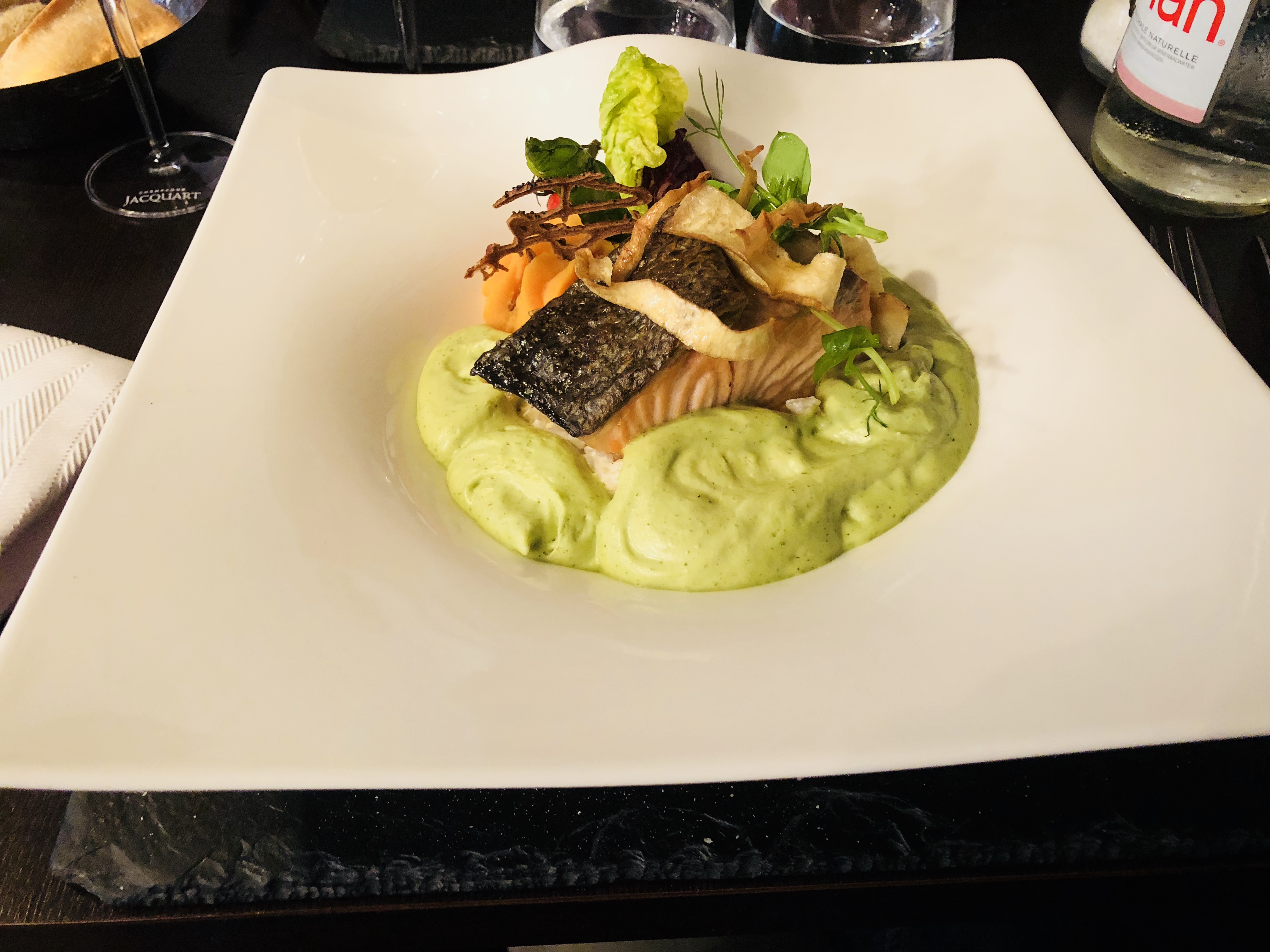 Soirée en terrasse donnant sur un jardin clos à l’abri de tout bruit, nous avons été chaleureusement accueillis par une pétillante Emma. Après quelques « mise en bouche » maison, pour nous préparer à la suite orientée poisson, nous avons eu plaisir à savourer une entrée parfaitement équilibrée dans les saveurs et les cuissons. De jolis produits, fraîcheur, chlorophylle, mélange intéressant de parfums, avec un peps tonique de pesto ail des ours sur une lotte à la cuisson ajustée. Bouquet final sur une très belle préparation de dessert (un certain Pierre aux manettes 😉) acidulé passion, miam. Chef ! un poil plus dans les assiettes parce que c’est bon, on ne dirait pas non Merci à toute l’équipe
