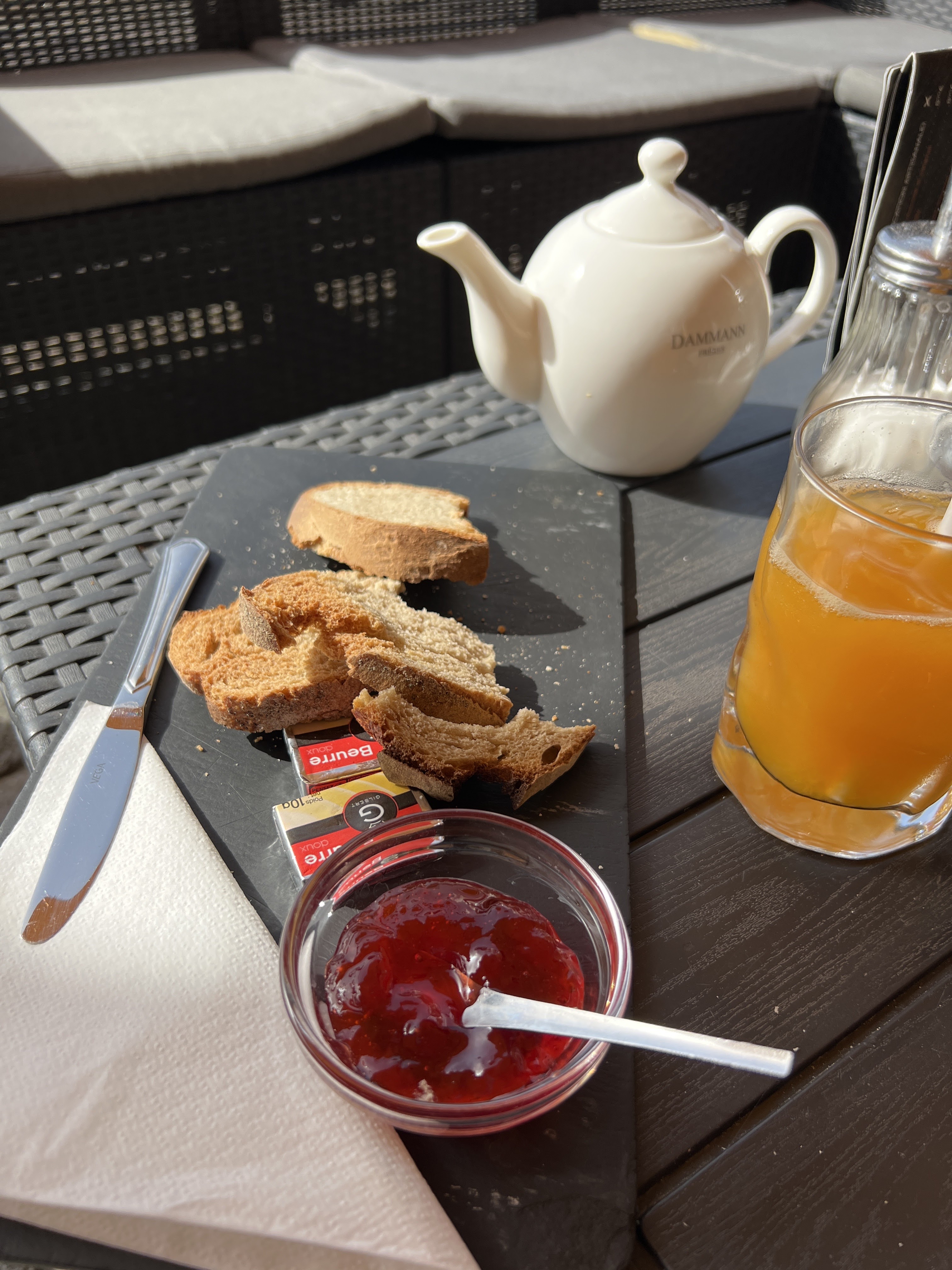 25€ pour un petit déjeuner immangeable PAIN RASSI SEC GELÉE ARTIFICIELLE SUCRÉE PAS DE CONFITURE SERVICE LAMENTABLE JUS ORANGE FRAIS PRESSÉ COUPÉ À L’EAU A fuir