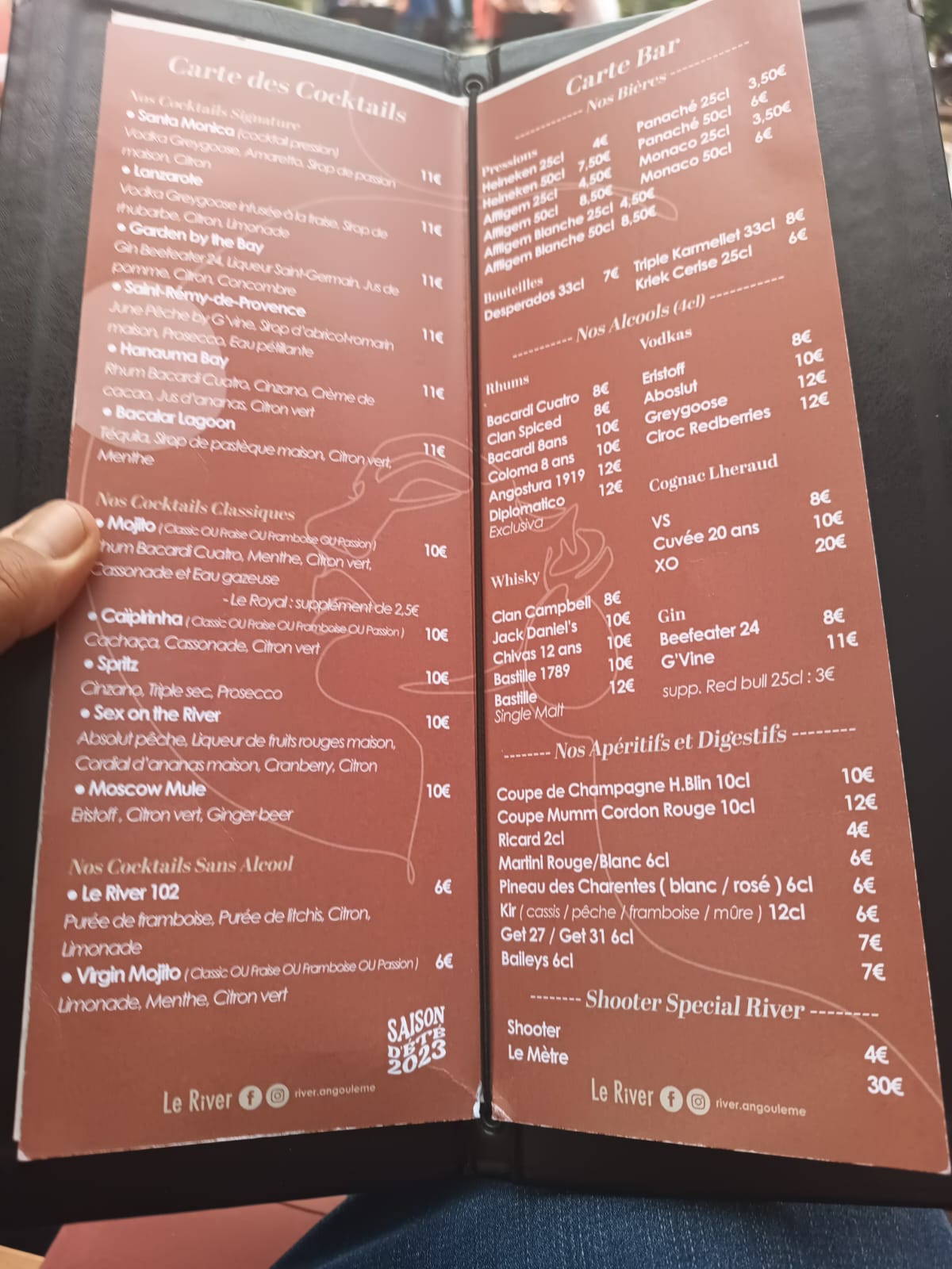 On as passer une très bonne soirée entre amis, même si les prix sont un peut élevé. Un repas délicieux le tous cuisiné maison avec des produits locaux servis dans un magnifique décor d'une belle bâtisse bien restaurer. Une super ambiance après le repas ou l on a put déguster plusieurs cognac de la région charente. Le River est juste à côté de plusieurs boîte de nuit à la mode ce qui est bien pratique pour éviter de prendre son véhicule entre les deux.