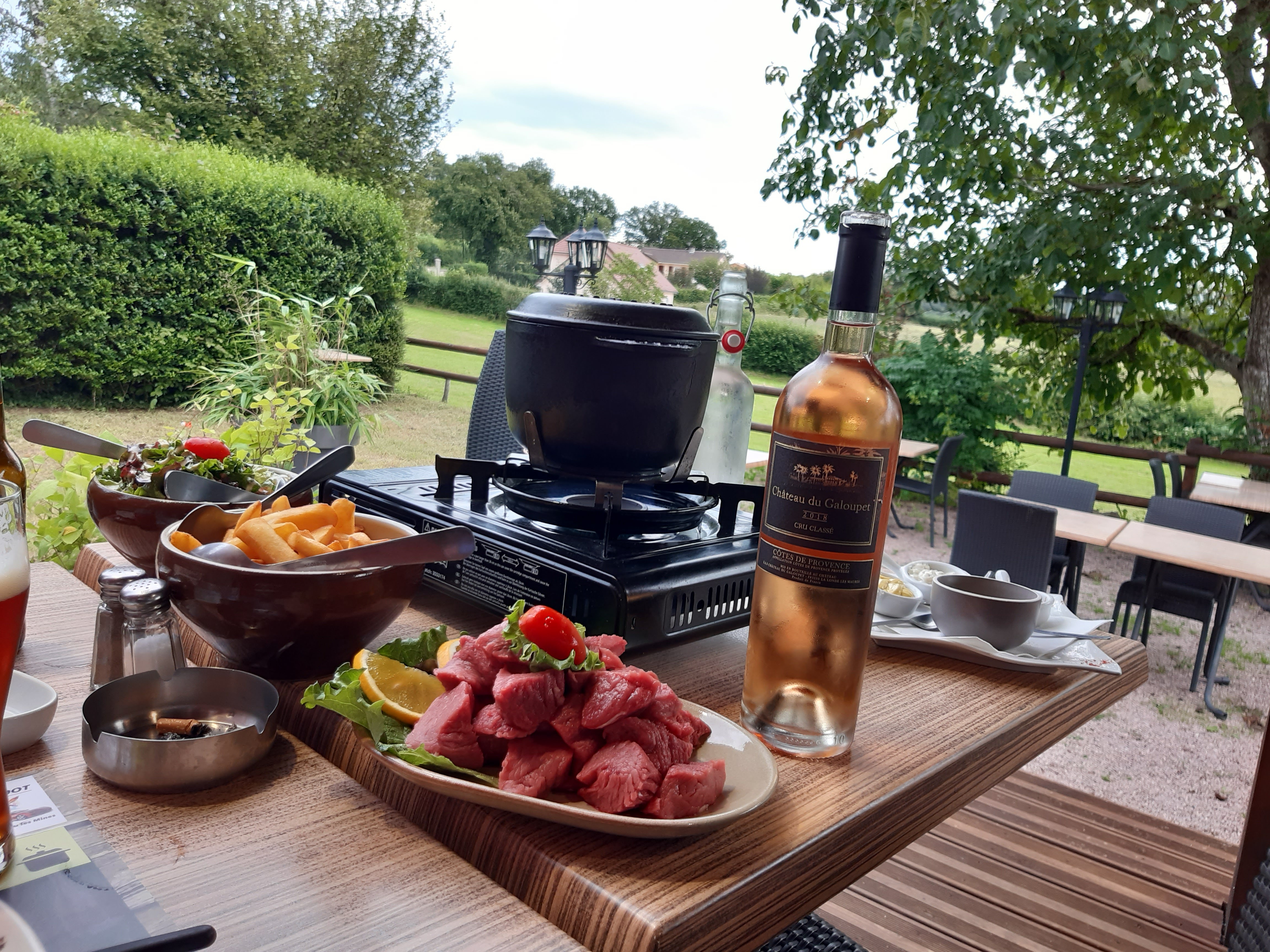 Nourriture et boissons. Nous avons eu la fondue bourguignonne (c'est à dire une fondue à la viande). La viande n'était pas aussi tendre que prévu et l'huile dans laquelle nous avions fondu la viande ne gardait pas sa température. Le vin de la maison était correct. Rien de spécial, mais correct en terme de rapport qualité prix. Les bières étaient bonnes et froides. Service. La serveuse était très sympathique. Cependant, compte tenu du nombre de tables sur place, il serait probablement préférable de se faire assister par un autre membre du personnel afin de réduire les temps d'attente pour les clients. Atmosphère. Le jardin du lieu est charmant !