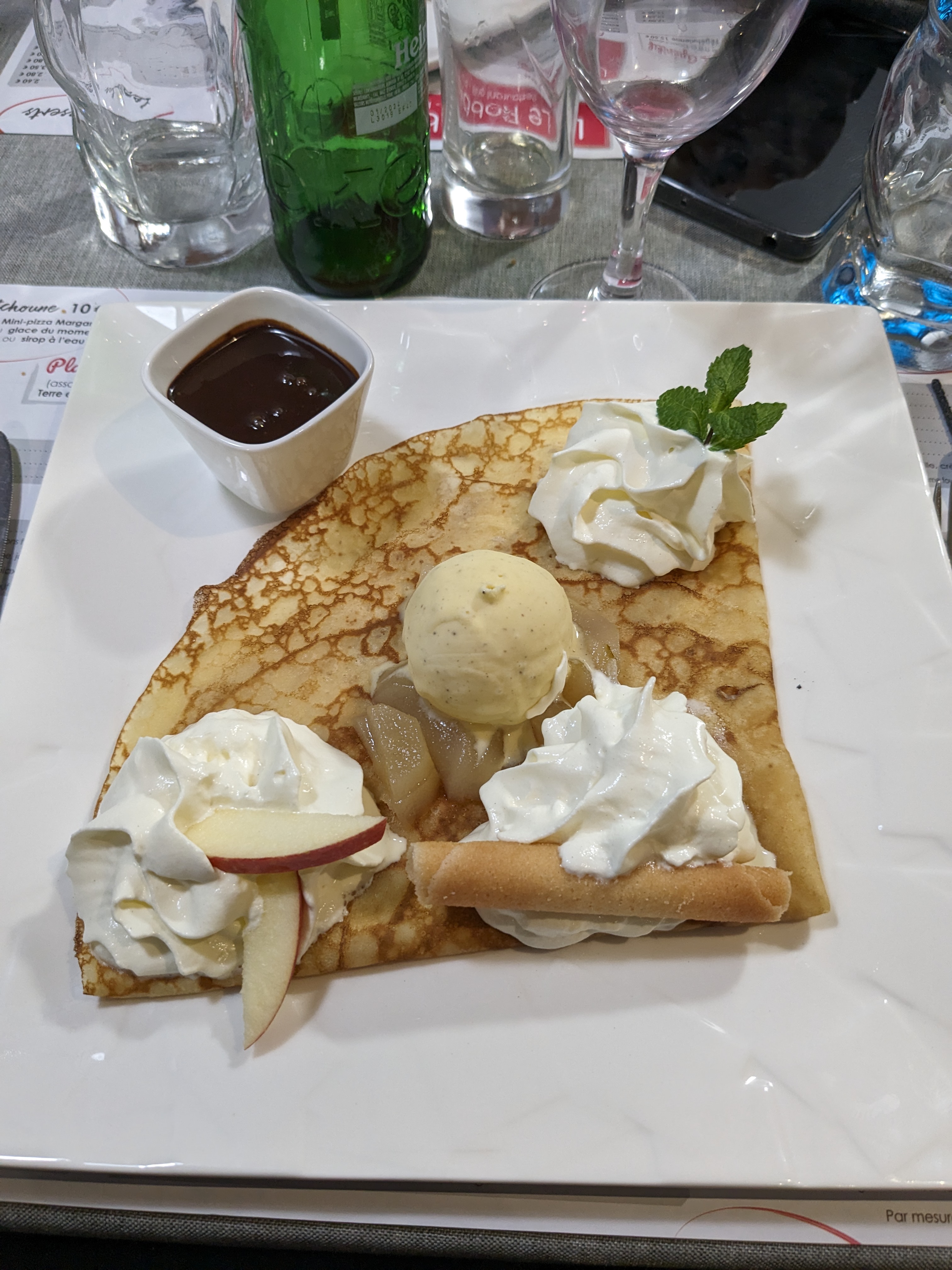 C est correct pour manger. Accueil sympa. Les crêpes sont sèches et nous avons attendu 45 minutes notre dessert. Par contre ils prennent les tickets restaurant. Pas de limite pour les tickets. Sinon bel endroit. Les toilettes sont au sous sol.