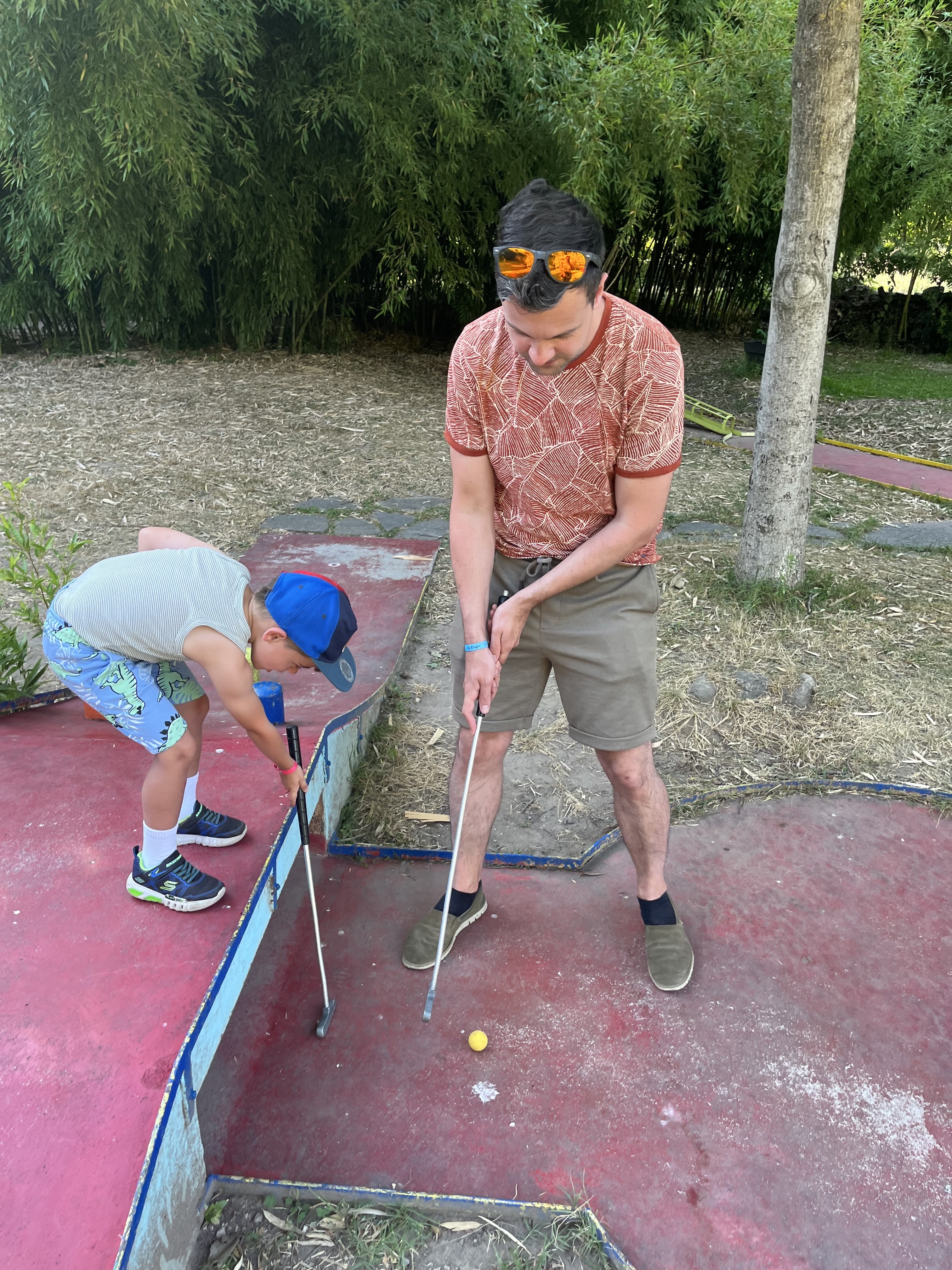 Activité ludique avec de jeunes enfants par une journée moins chaude. Ils ont même des clubs pour les plus petits de 3 ans. L'entretien des parcours pourrait être un peu meilleur, mais sinon l'état est bon.