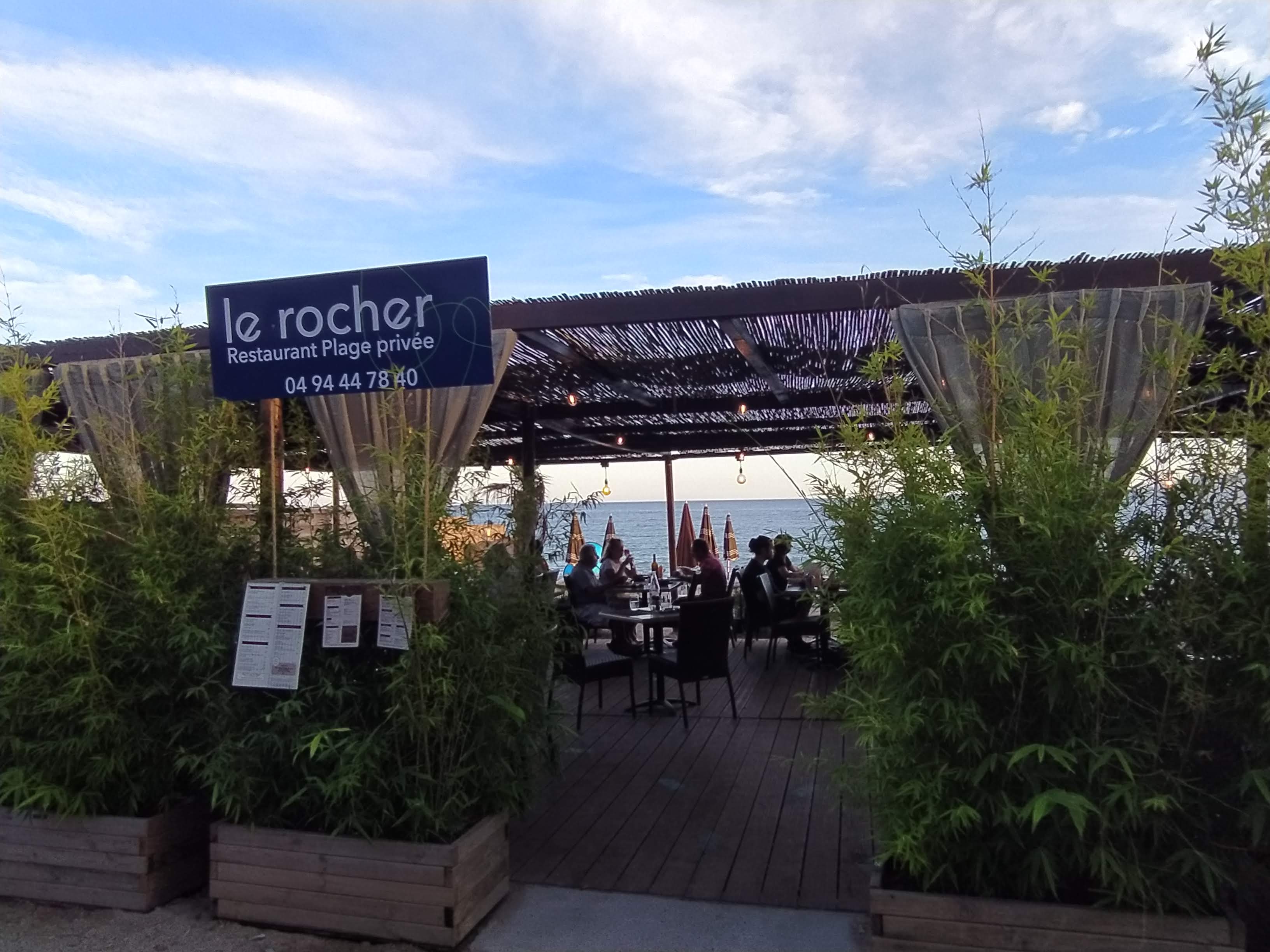 Nous avons diné le vendredi 4 août au Rocher, nous avons passé une très bonne soirée. Un très beau cadre, face à la mer avec une jolie déco, les tables sont espacées. Un service rapide et souriant. De très bon plats avec produits frais et cuisson au top. Bien que les plats soient un peu chers, très bon rapport qualité prix. Mention spéciale au DJ de la soirée qui a mis le feu !