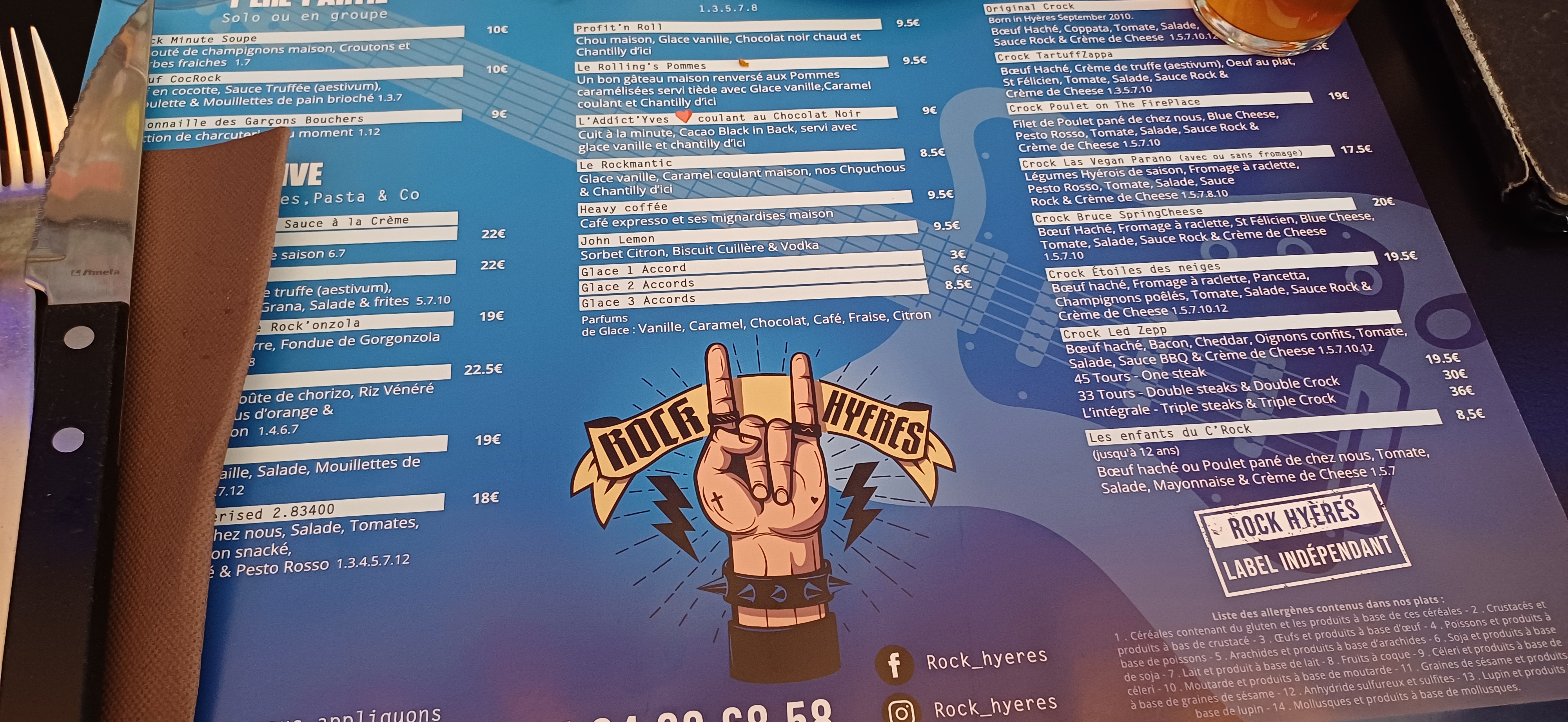 En visite sur hyeres, j'ai passé un très bon moment ce soir, le concept est bien complet autour du rock, la carte est originale et la cuisine d'un bon niveau. L'ambiance musicale est sympa : red hot, Doors, off spring... J'ai apprécié également le petit rhum offert en fin de repas.