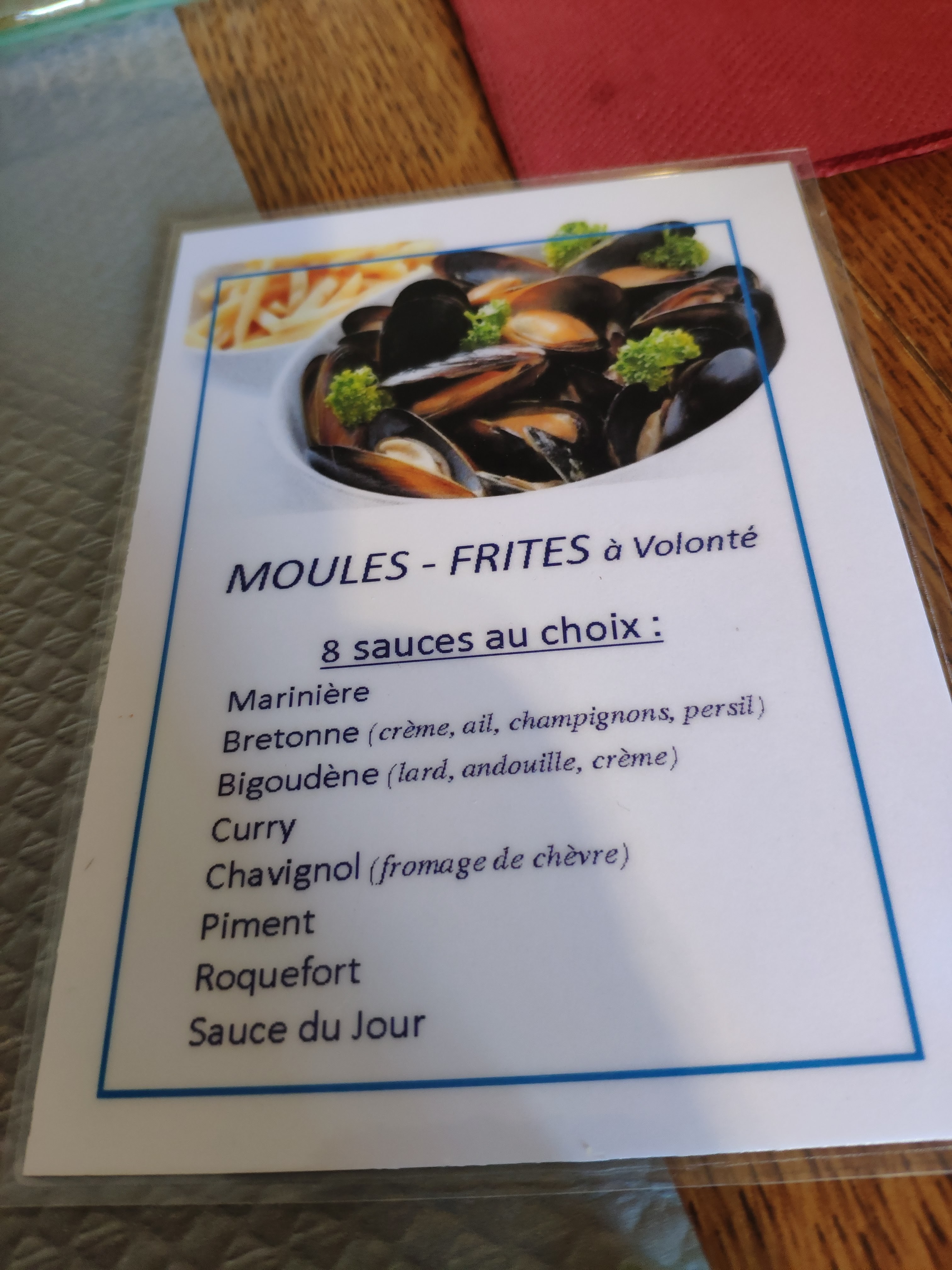 Moule à volonté les sauces sont très bonne. Manque les prix affiché et les cartes. Service un peu long par moment... Peu de choix de dessert et pas très variés.