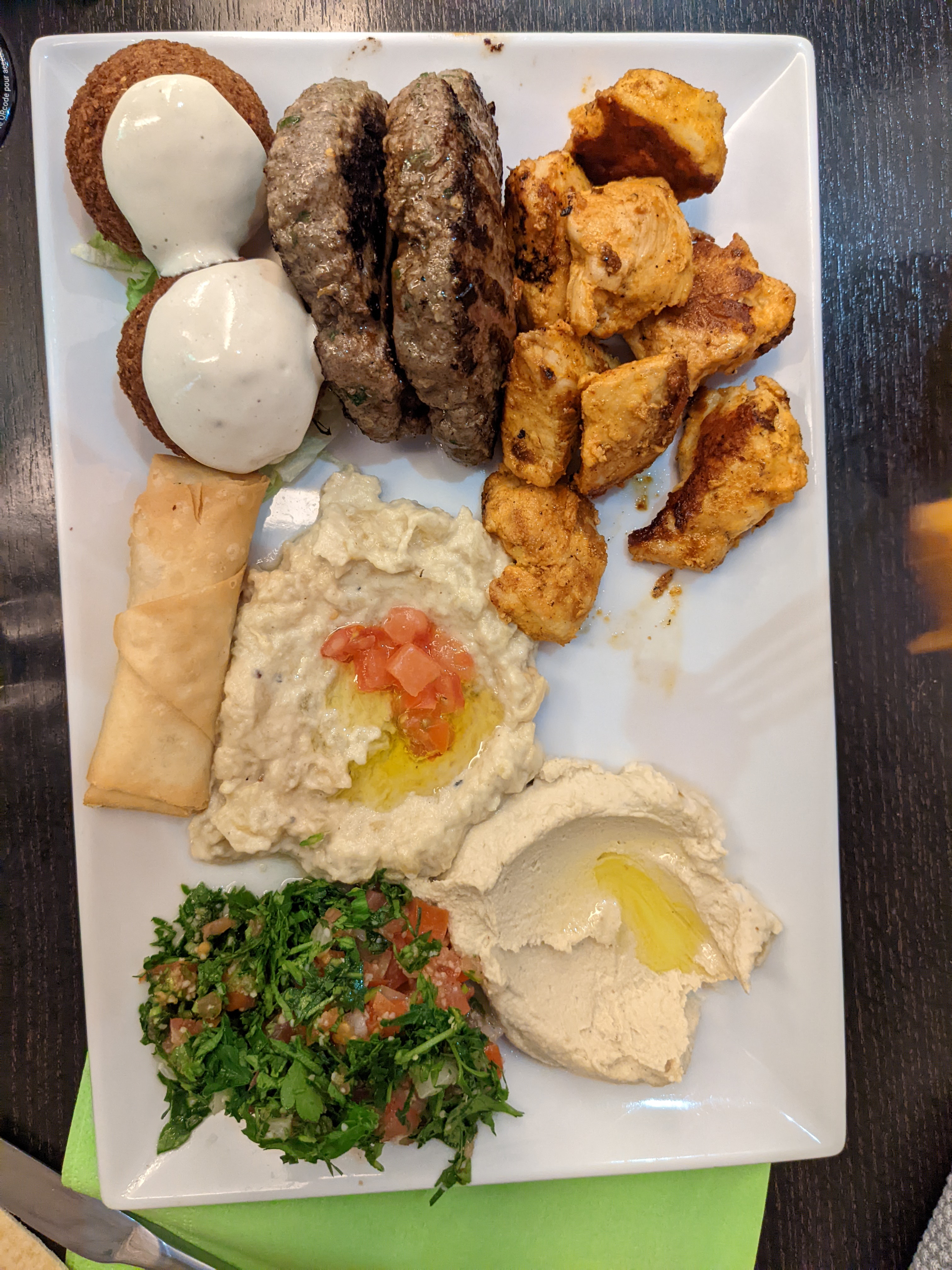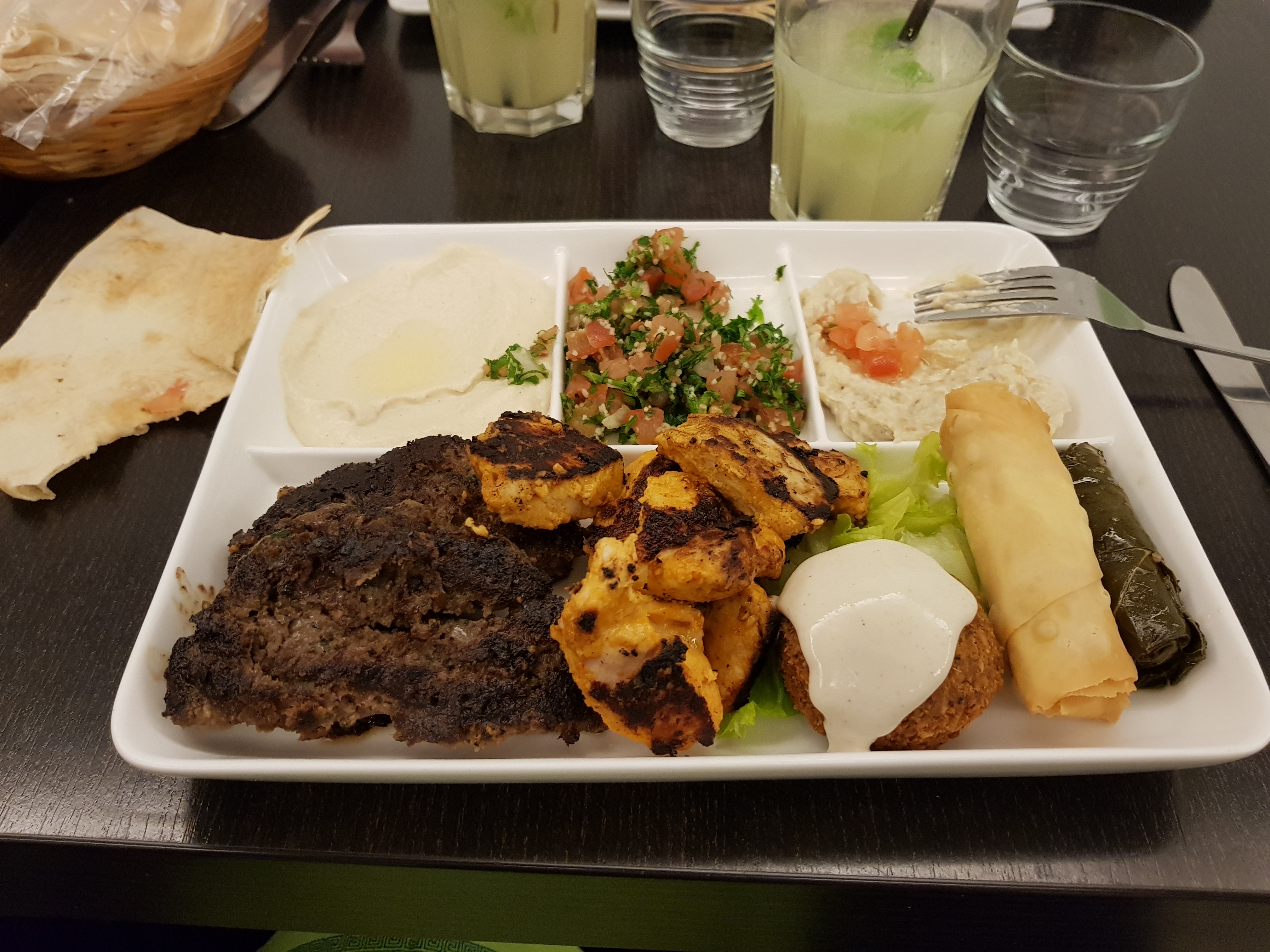 Très moyen. Peu copieux et assez cher au final. Kefta sèches, pas et pas à mon goût. Poulet mariné à l'ail très moyen. Mini portion de taboule libanais. Pas certain que les falafels soient maison. Pas de choix de desserts. Pas de vin. Service rapide.