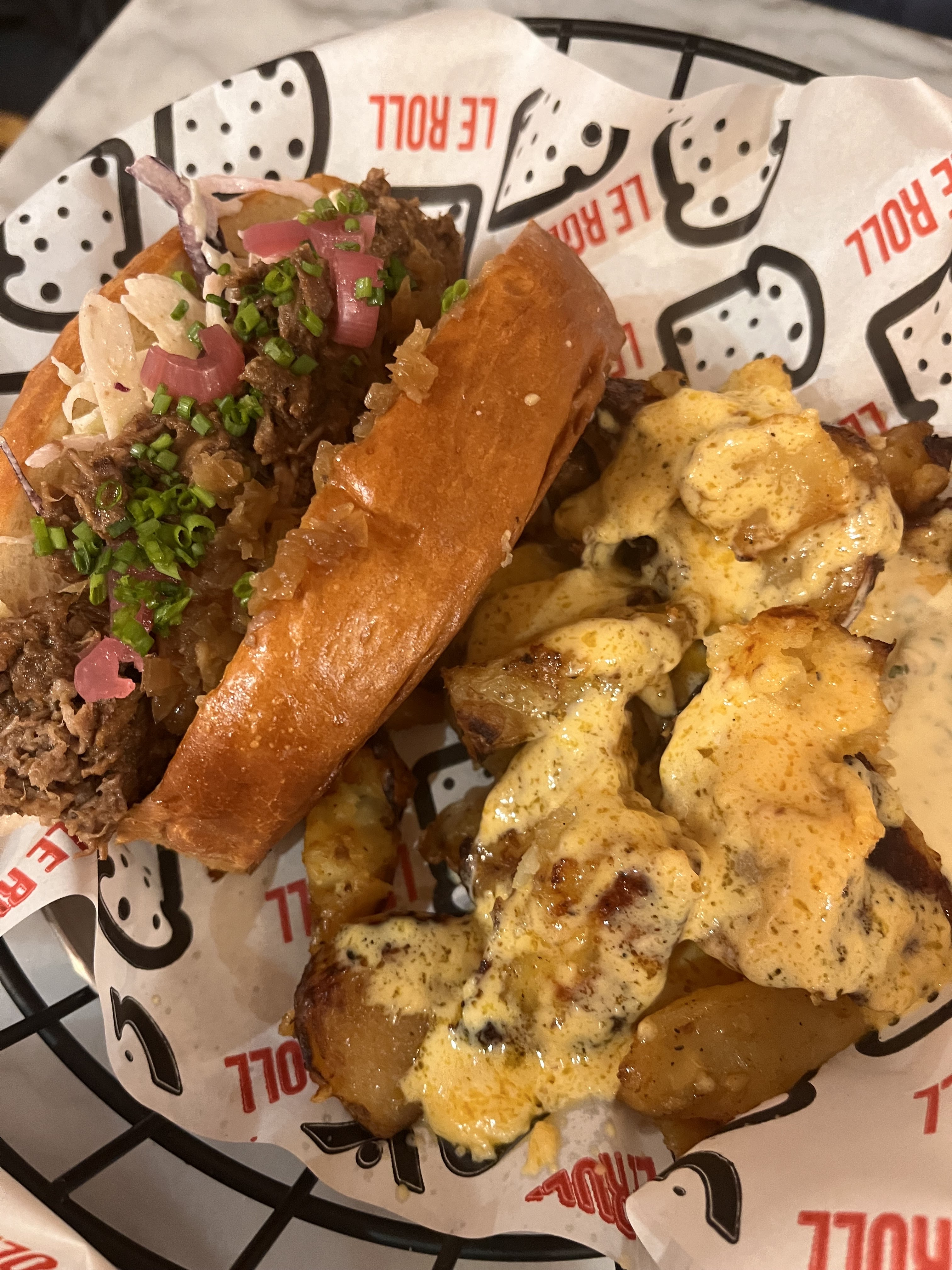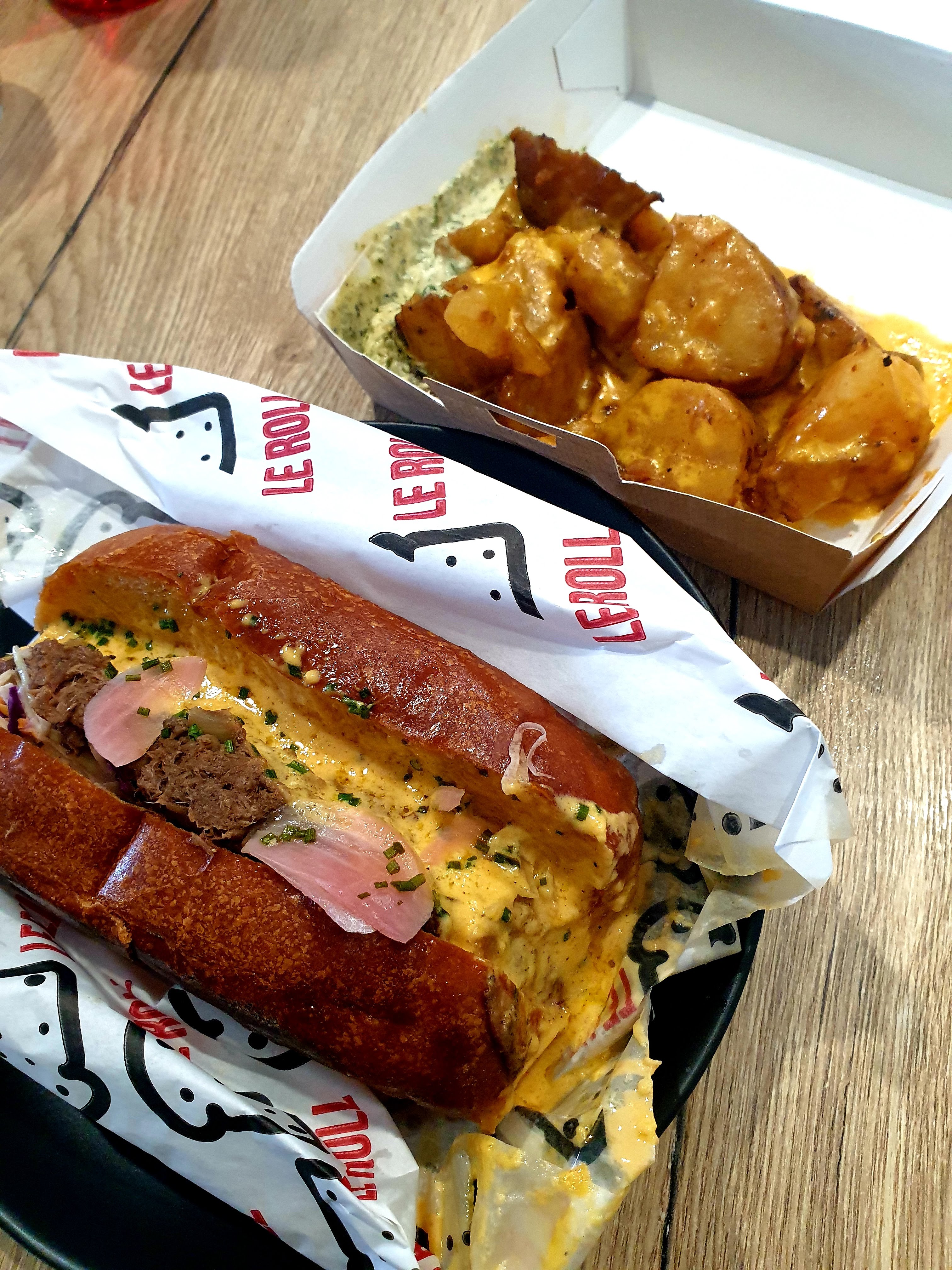 J’ai commandé sur Uber Eats un roll boeuf cheese avec des patates au fromage sauce ciboulette et supplément sauce piquante avec en dessert une mousse au chocolat. C’était incroyable ! Les patates étaient en petite quantité mais cela m’a très largement suffit, je n’en pouvais déjà plus alors que je n’avais pas encore entamé le roll 😅 En ce qui concerne le roll, la viande est juteuse et on sent que c’est du bœuf bourguignon. La viande se marie très bien avec le cheddar et les légumes. ⚠️Je déconseille fortement aux personnes n’aimant pas le boeuf/ & où n’ayant jamais mangées de boeuf bourguignon de commander ce roll ! La brioche rend le roll très consistant, je vous déconseille d’en commander 2 ( à moins d’avoir très faim ) En ce qui concerne le dessert, la mousse au chocolat était incroyable. On sent bien le praliné et le chocolat n’est pas du tout écœurant ! C’était ma première commande mais ça ne sera pas la dernière 😊 Vous méritez amplement 5 étoiles: 🌟🌟🌟🌟🌟