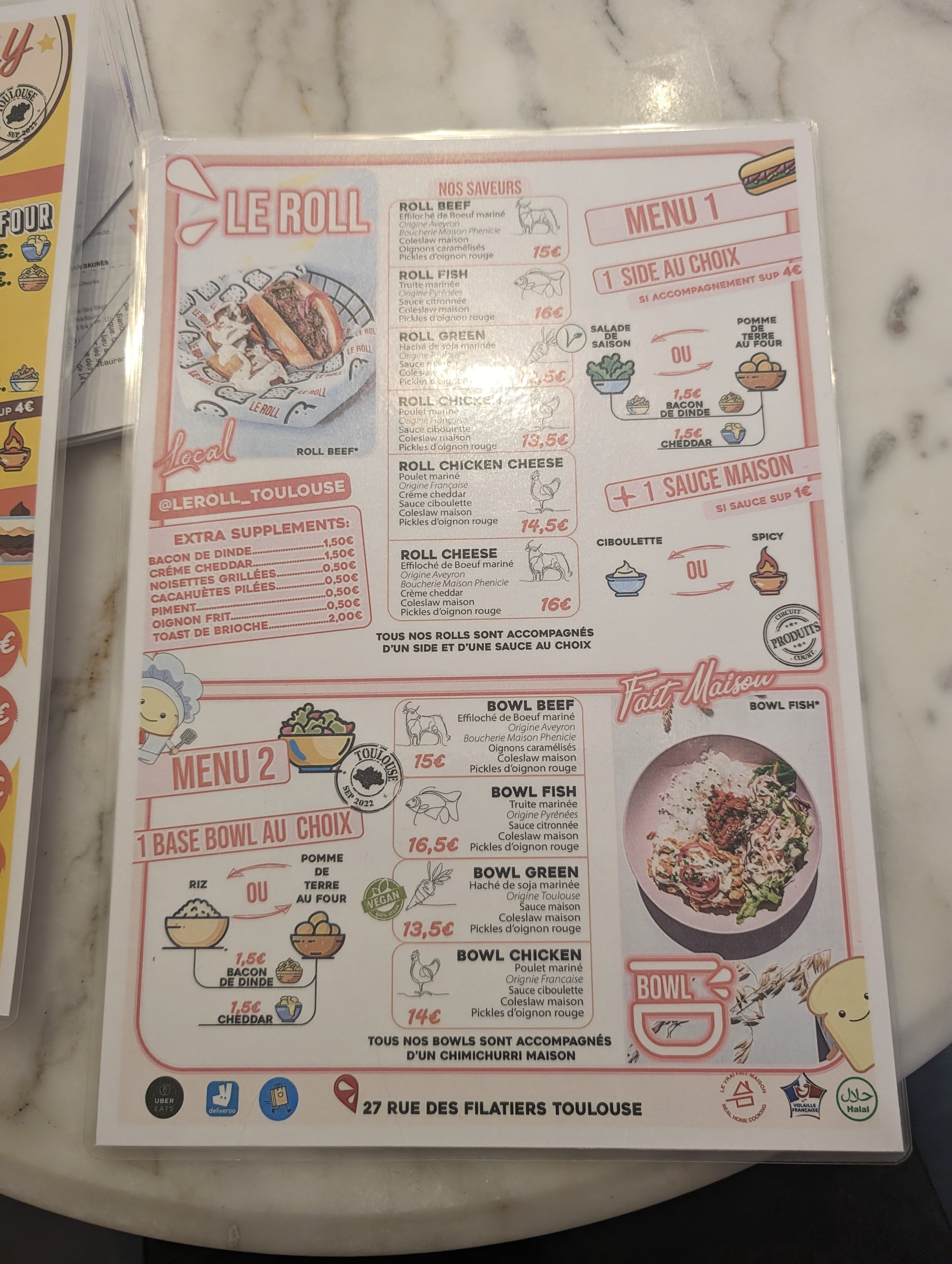 Une adresse toulousaine qu’il faut visiter si vous recherchez des menus aux recettes originales et délicieuses. Spécialiste du Roll brioché à la garniture riche et variée, ce restaurant propose aussi des bowls (à la truite confite et poulet yassa pour nous). Les desserts sont faits maisons, et très gourmands. On reviendra !